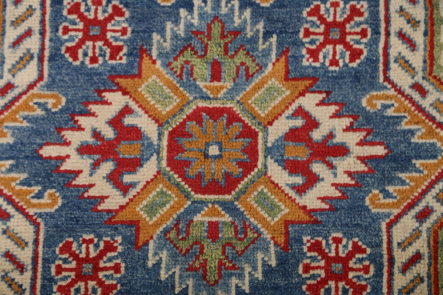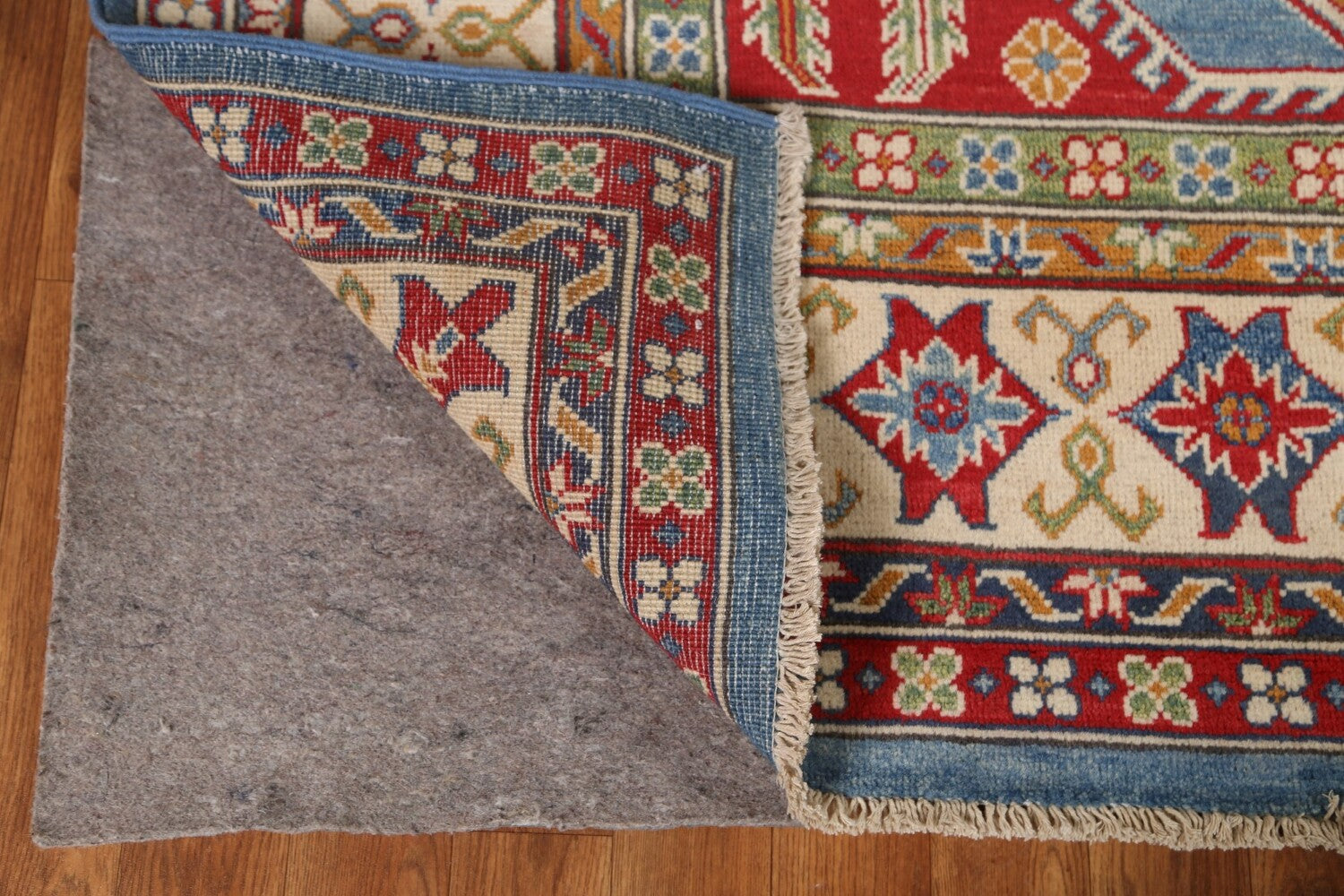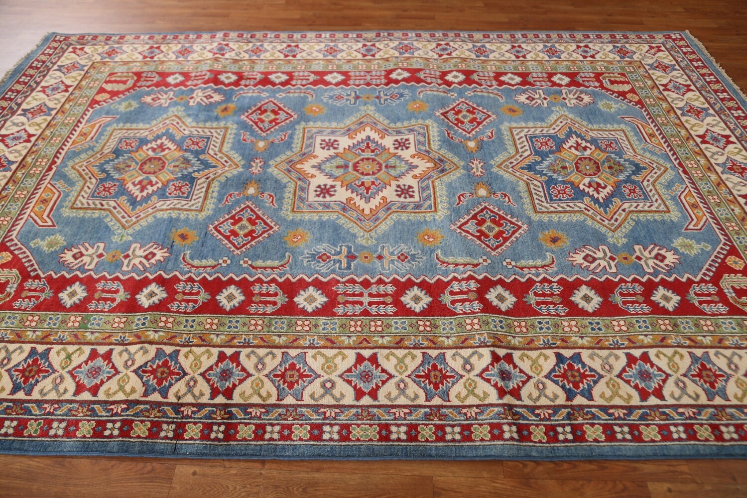 A Beautiful Genuine Pakistan Kazak rug is Hand Knotted by skillful weavers in Pakistan with 100% Wool Material. This rug is in condition. dimensions are 9' 10'' X 6' 6'' in foot and 300 X 198 in centimeter. the primary color is Navy Blue & Blues.
