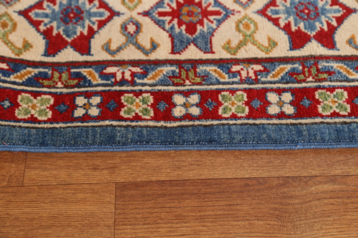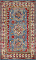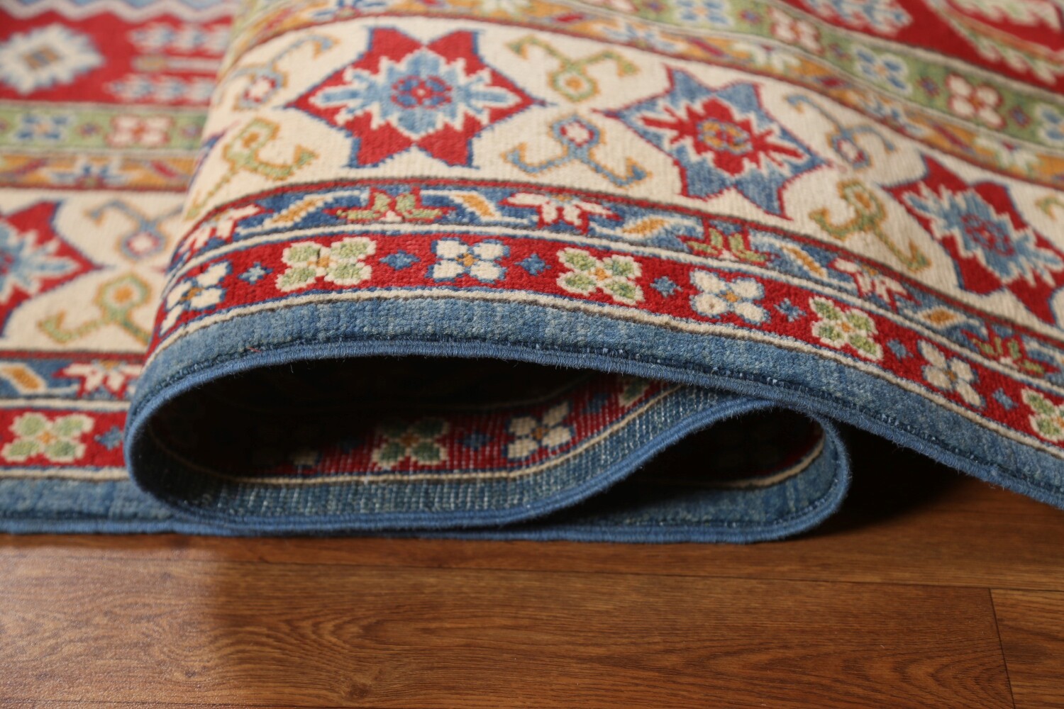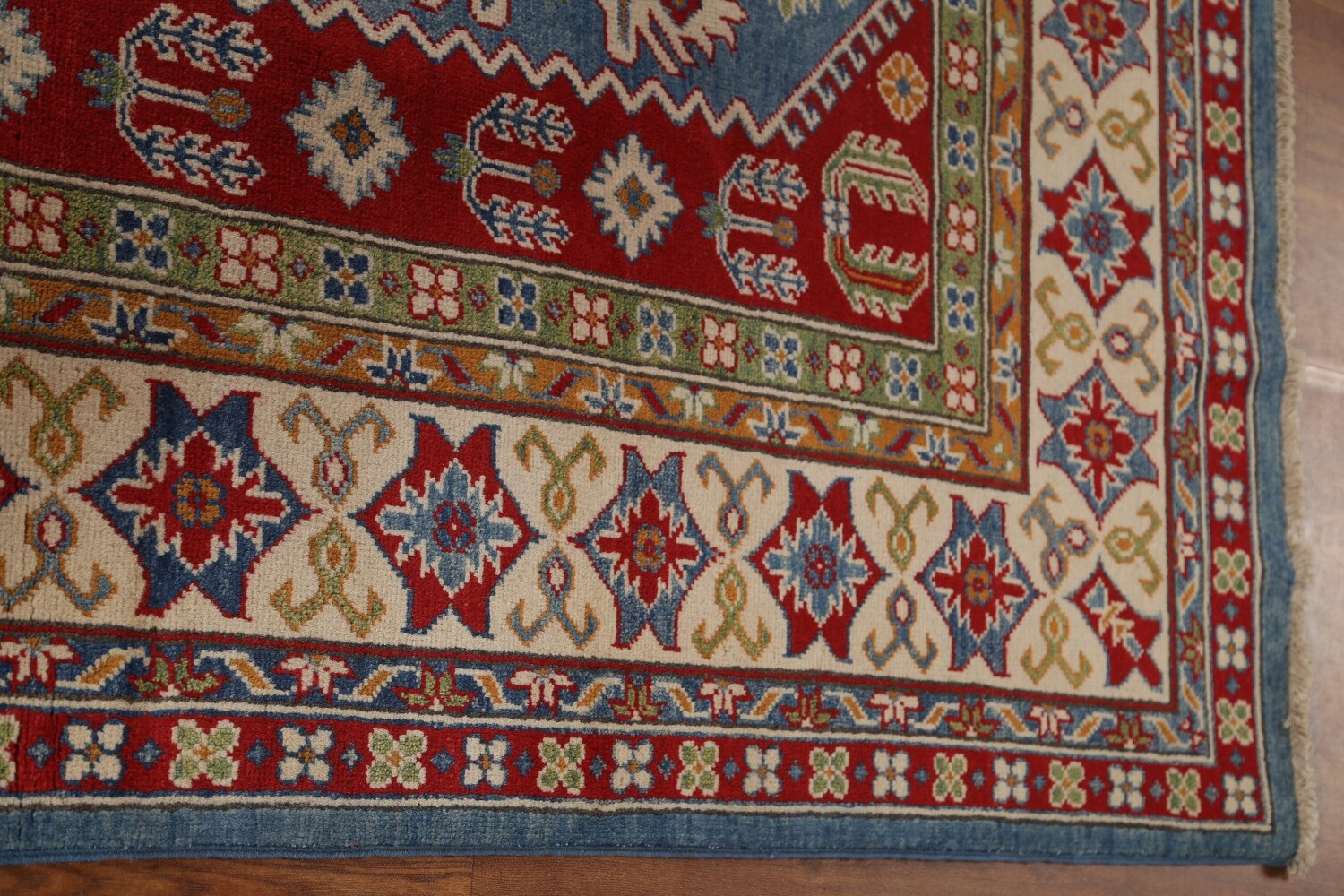 A Beautiful Genuine Pakistan Kazak rug is Hand Knotted by skillful weavers in Pakistan with 100% Wool Material. This rug is in condition. dimensions are 9' 10'' X 6' 6'' in foot and 300 X 198 in centimeter. the primary color is Navy Blue & Blues.