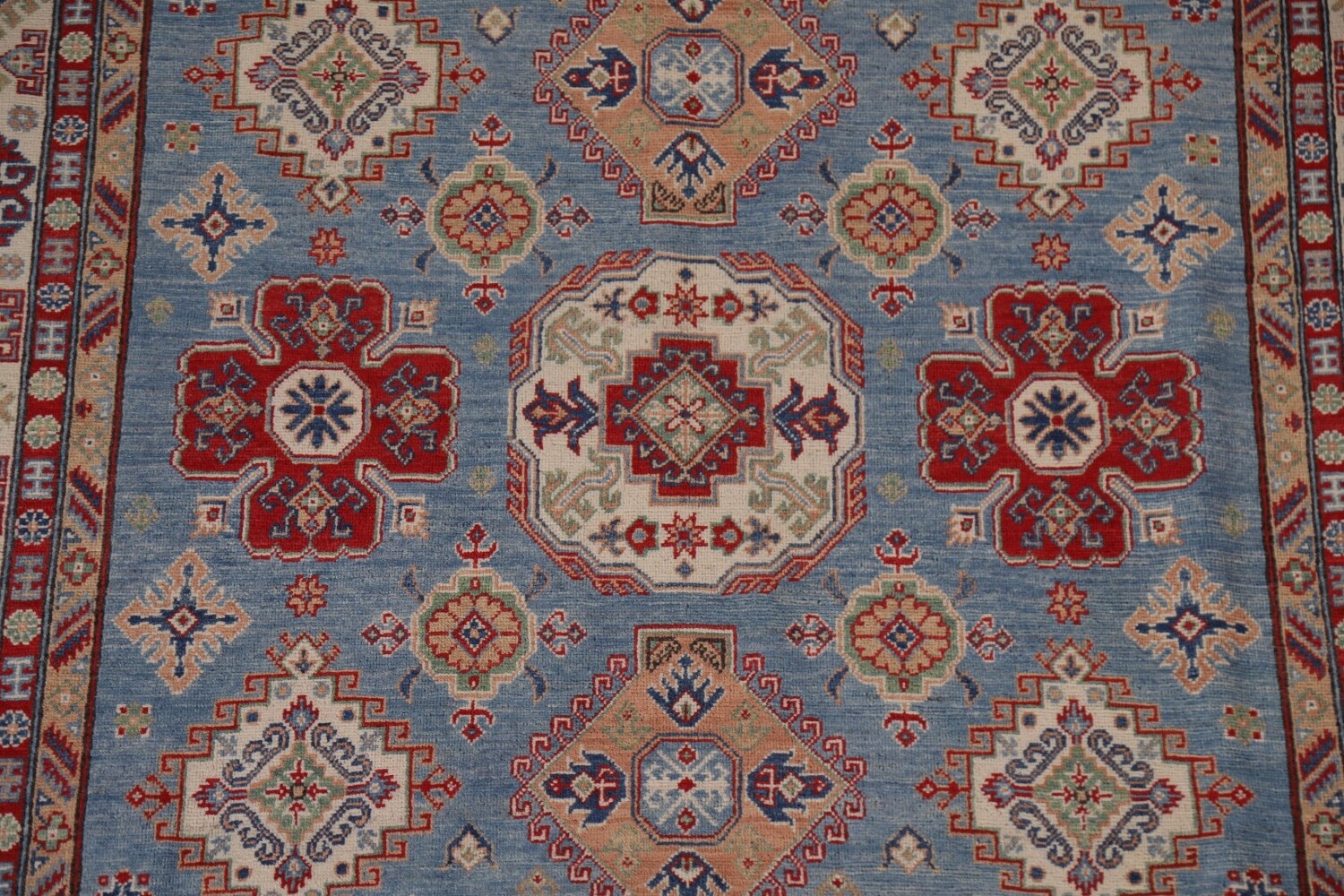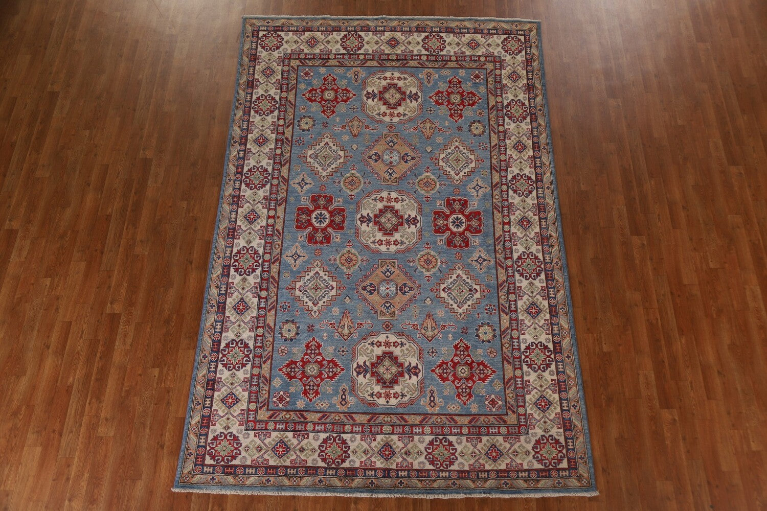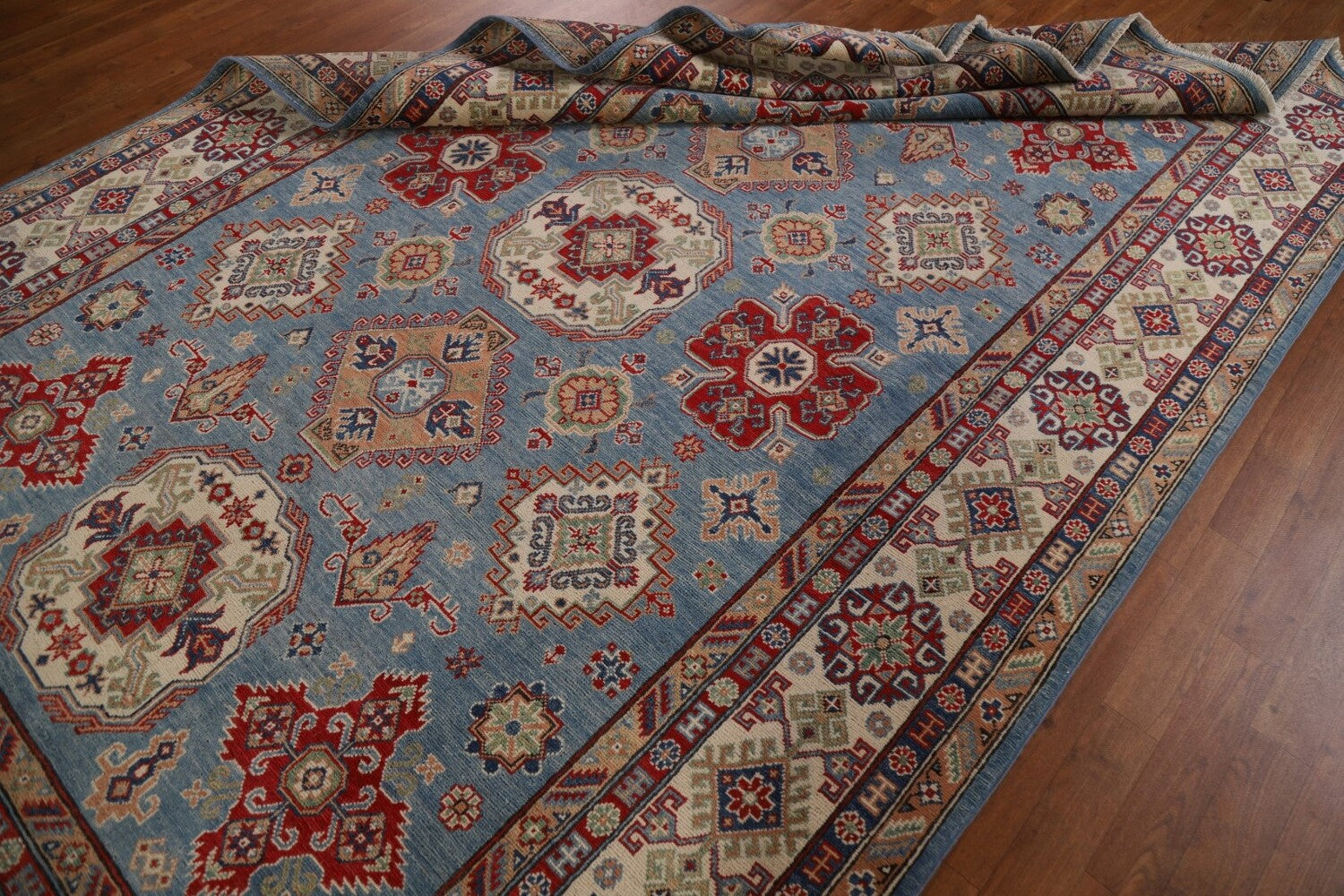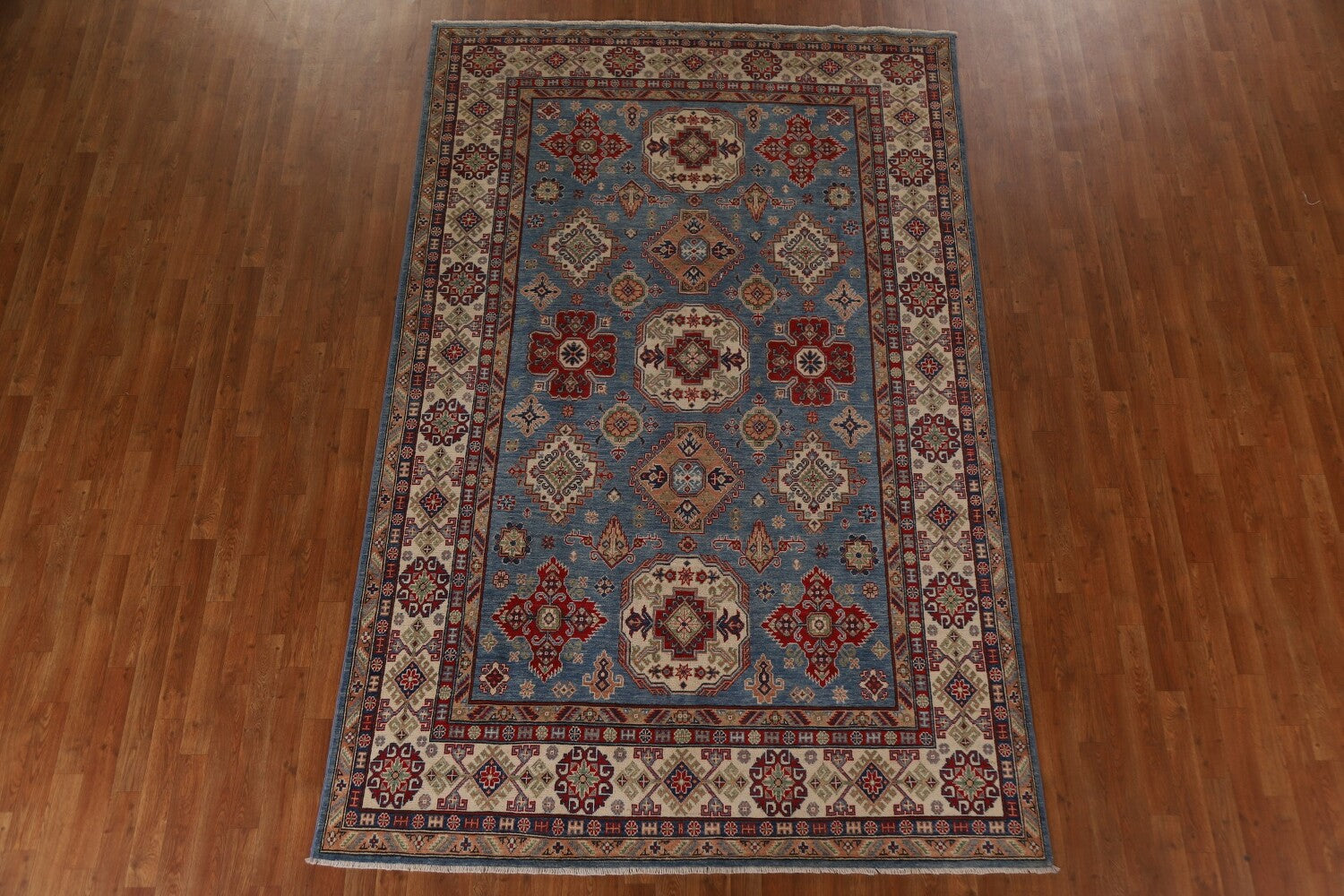 A Beautiful Genuine Pakistan Kazak rug is Hand Knotted by skillful weavers in Pakistan with 100% Wool Material. This rug is in condition. dimensions are 10' 2'' X 6' 6'' in foot and 310 X 198 in centimeter. the primary color is Navy Blue & Blues.