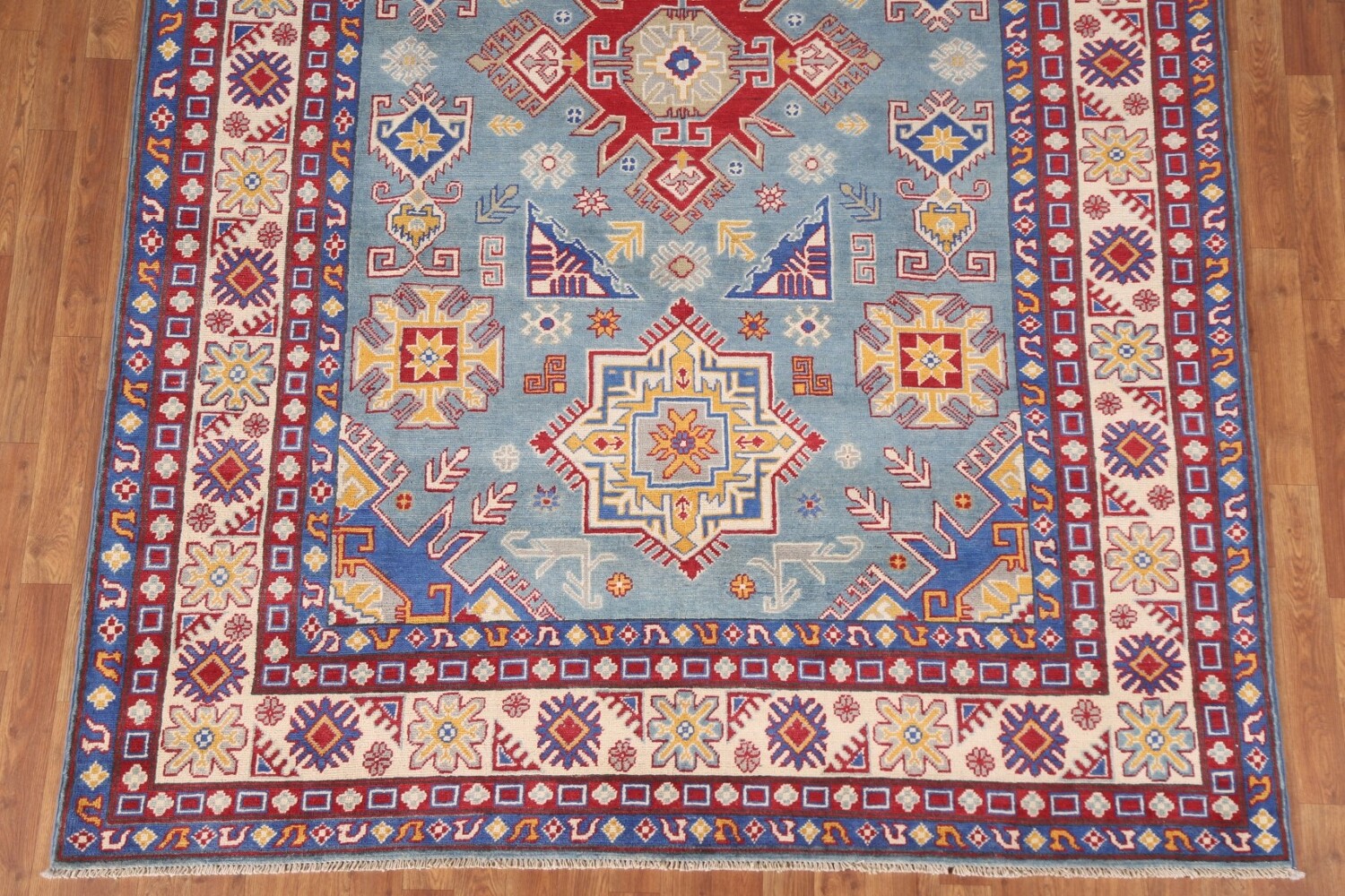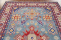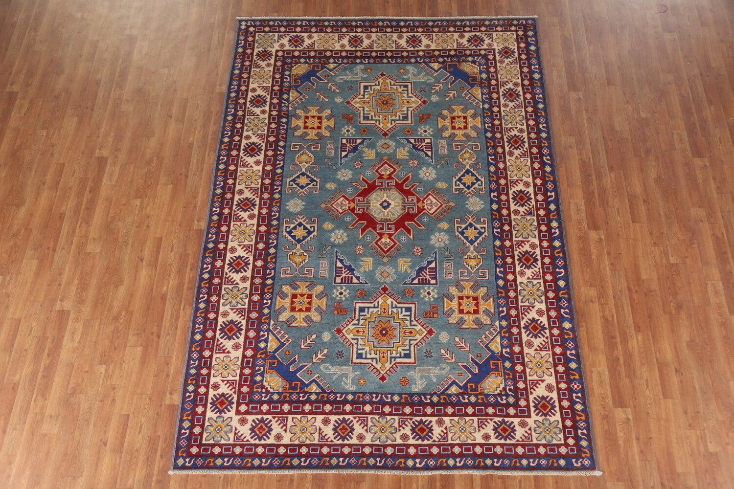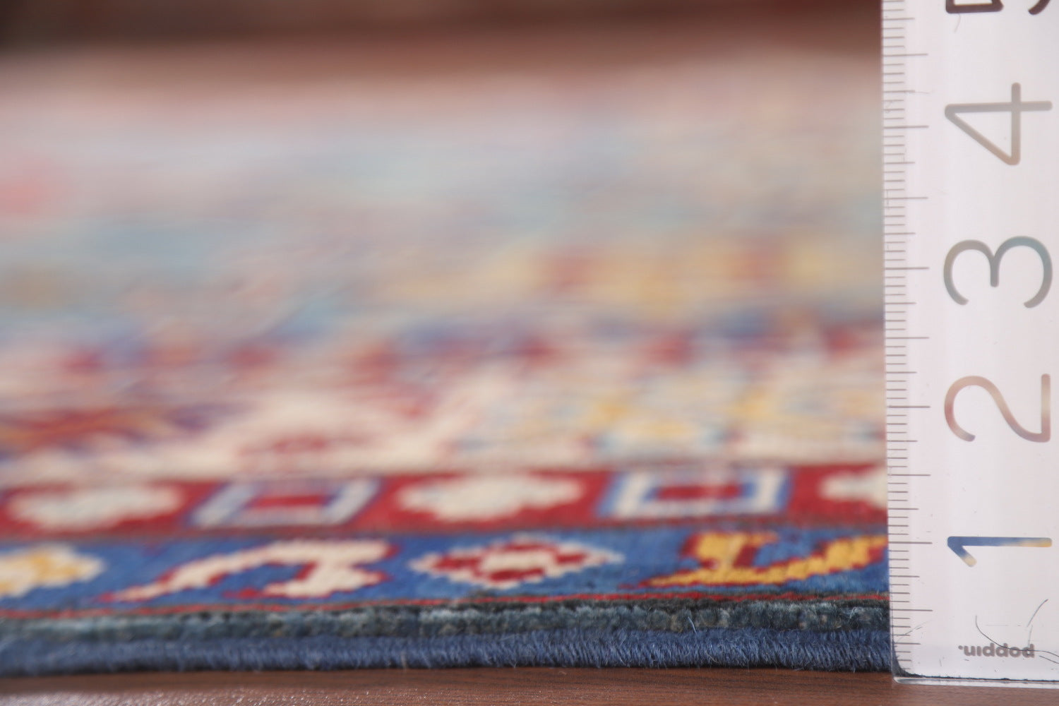 A Beautiful Genuine Pakistan Kazak rug is Hand Knotted by skillful weavers in Pakistan with 100% Wool Material. This rug is in New, First Quality condition. dimensions are 9' 8'' X 6' 7'' in foot and 295 X 201 in centimeter. the primary color is Navy Blue & Blues.