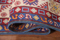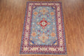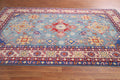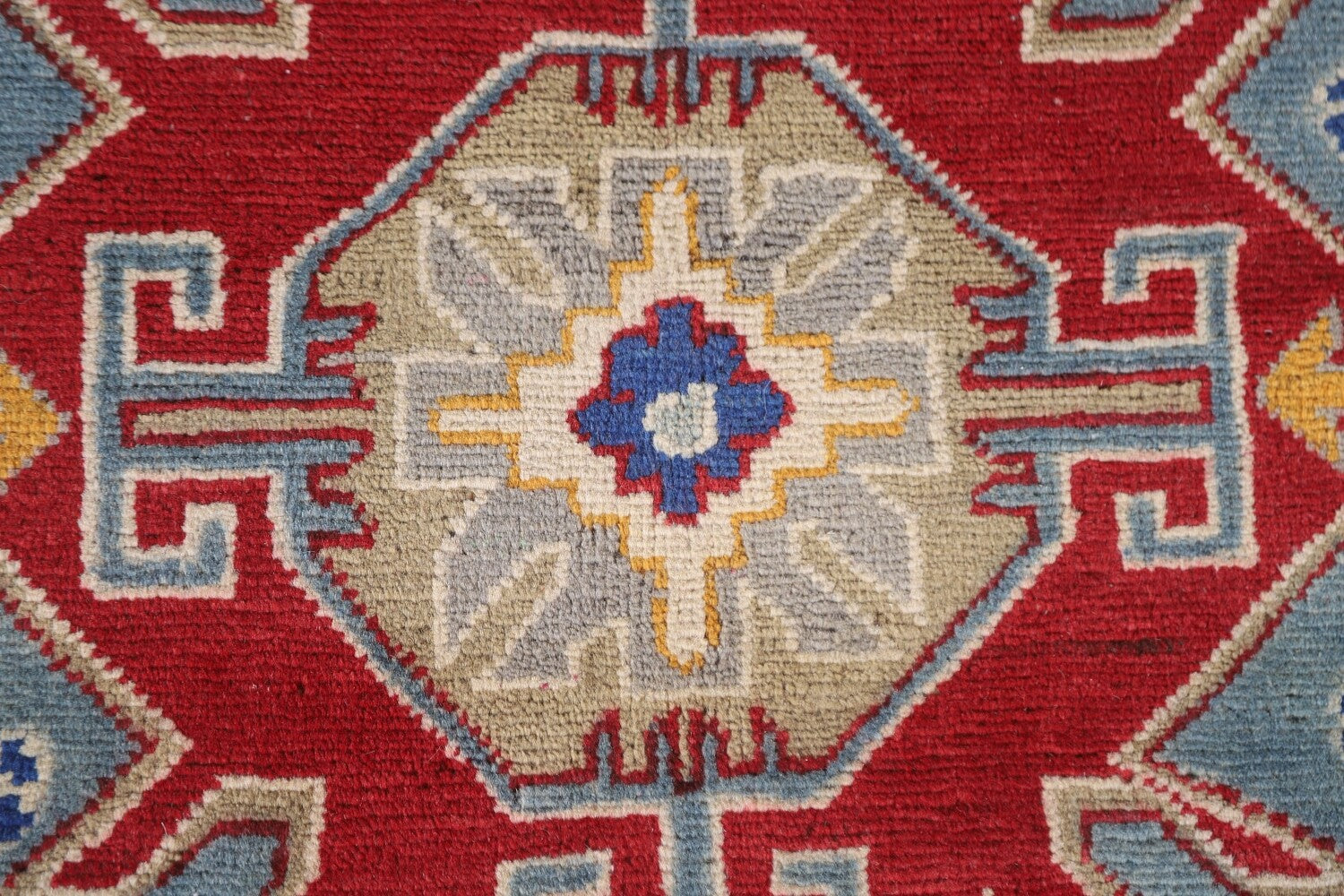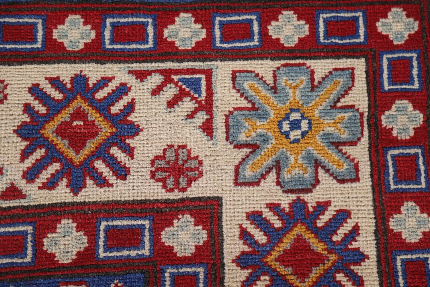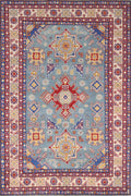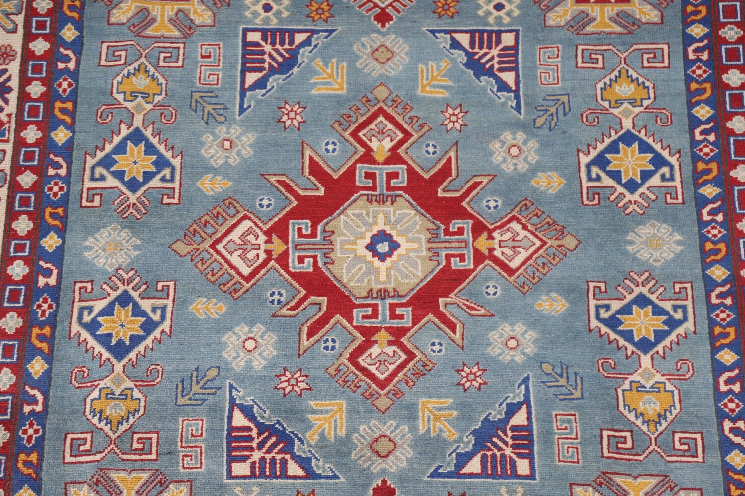 A Beautiful Genuine Pakistan Kazak rug is Hand Knotted by skillful weavers in Pakistan with 100% Wool Material. This rug is in New, First Quality condition. dimensions are 9' 8'' X 6' 7'' in foot and 295 X 201 in centimeter. the primary color is Navy Blue & Blues.