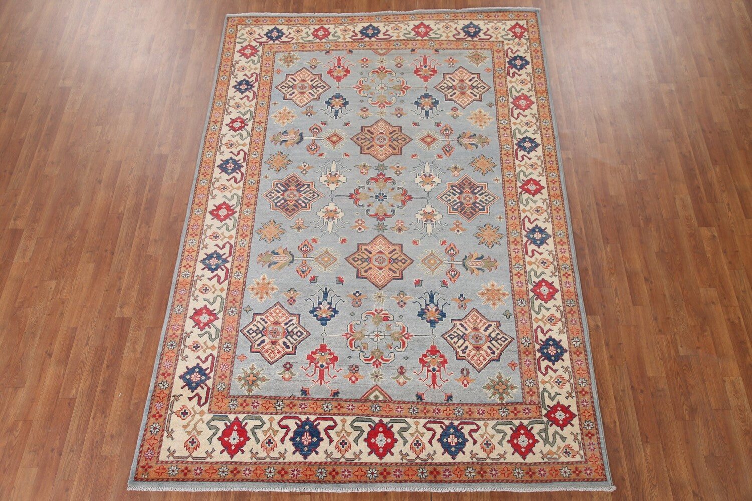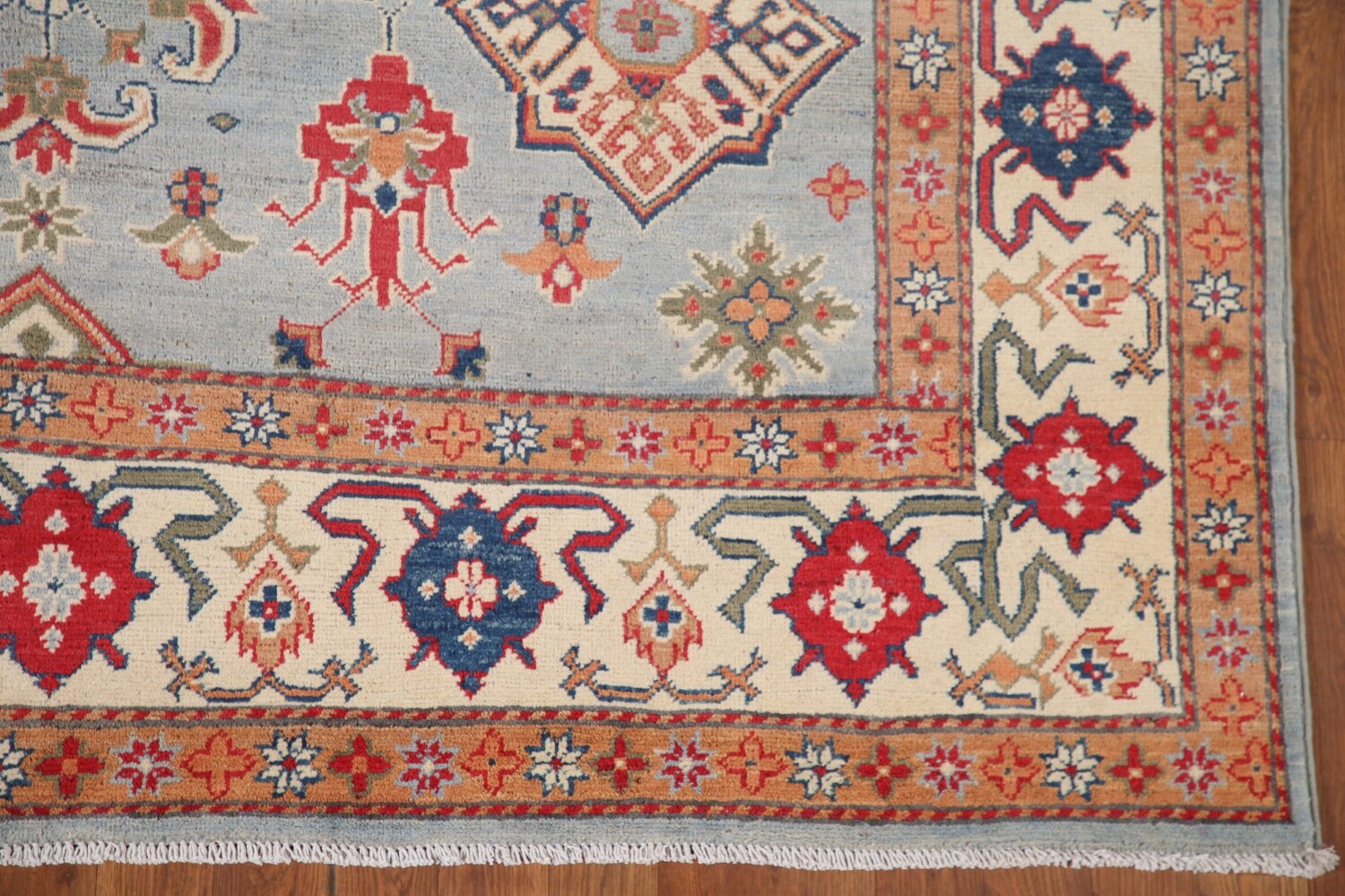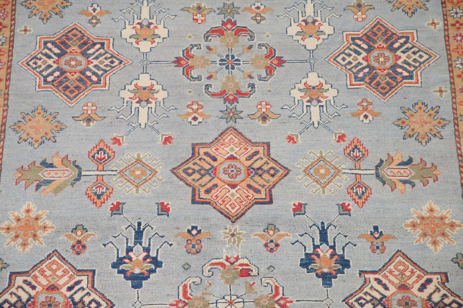 A Beautiful Genuine Pakistan Kazak rug is Hand Knotted by skillful weavers in Pakistan with 100% Wool Material. This rug is in New, First Quality condition. dimensions are 9' 7'' X 6' 8'' in foot and 292 X 203 in centimeter. the primary color is Navy Blue & Blues.