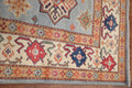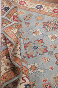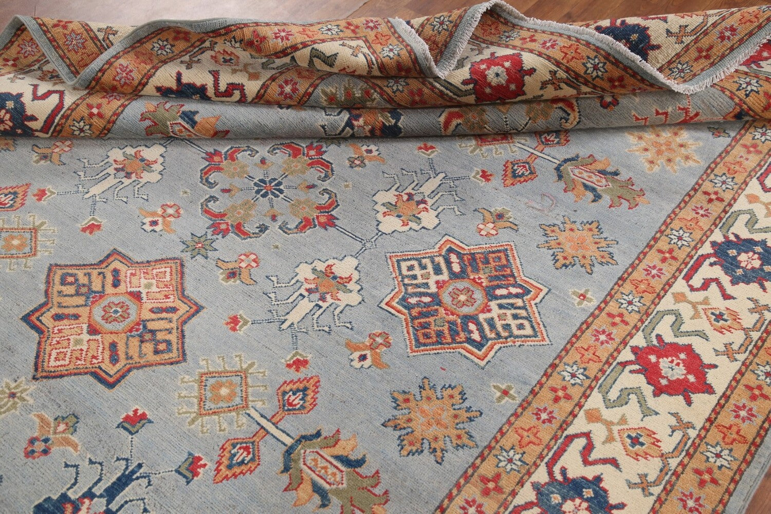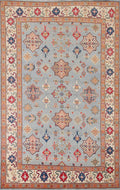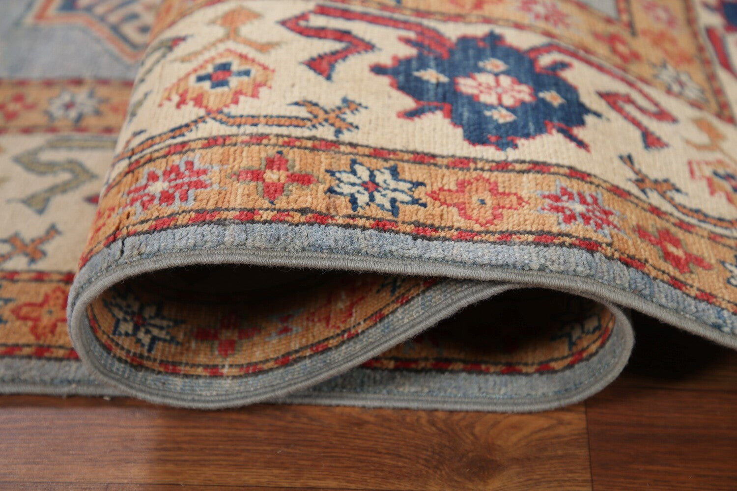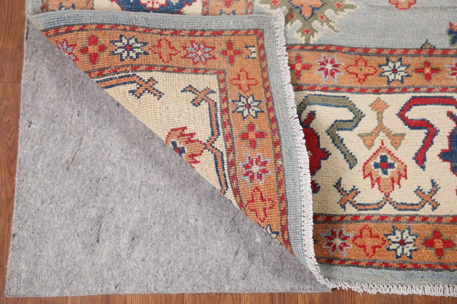 A Beautiful Genuine Pakistan Kazak rug is Hand Knotted by skillful weavers in Pakistan with 100% Wool Material. This rug is in New, First Quality condition. dimensions are 9' 7'' X 6' 8'' in foot and 292 X 203 in centimeter. the primary color is Navy Blue & Blues.