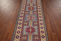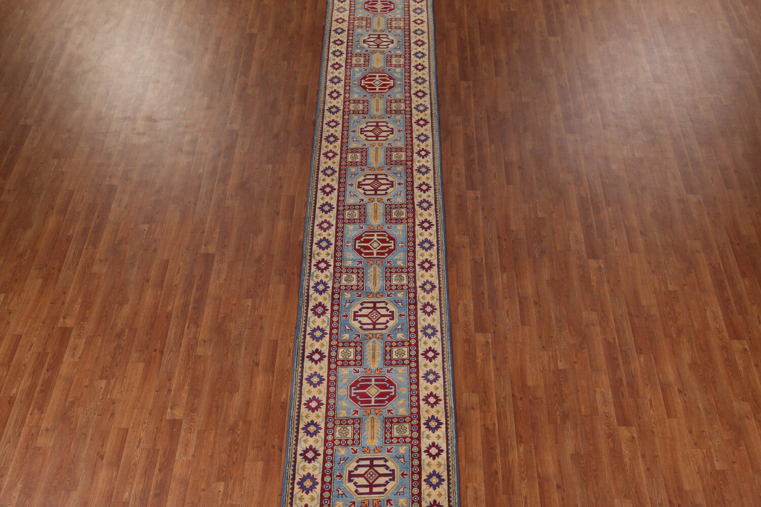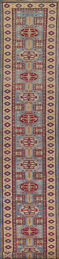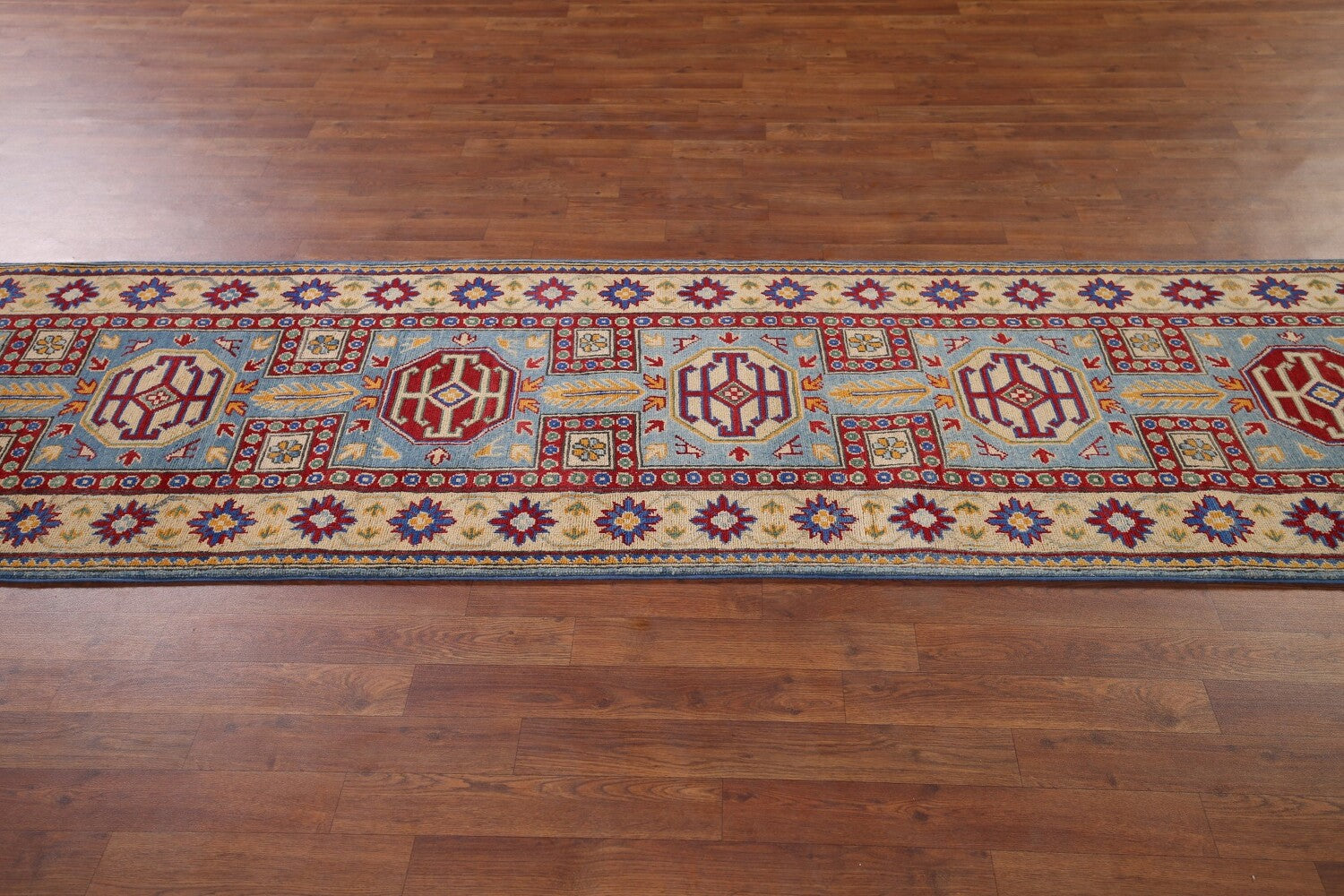 A Beautiful Genuine Pakistan Kazak rug is Hand Knotted by skillful weavers in Pakistan with 100% Wool Material. This rug is in New, First Quality condition. dimensions are 20' 7'' X 2' 7'' in foot and 627 X 79 in centimeter. the primary color is Navy Blue & Blues.