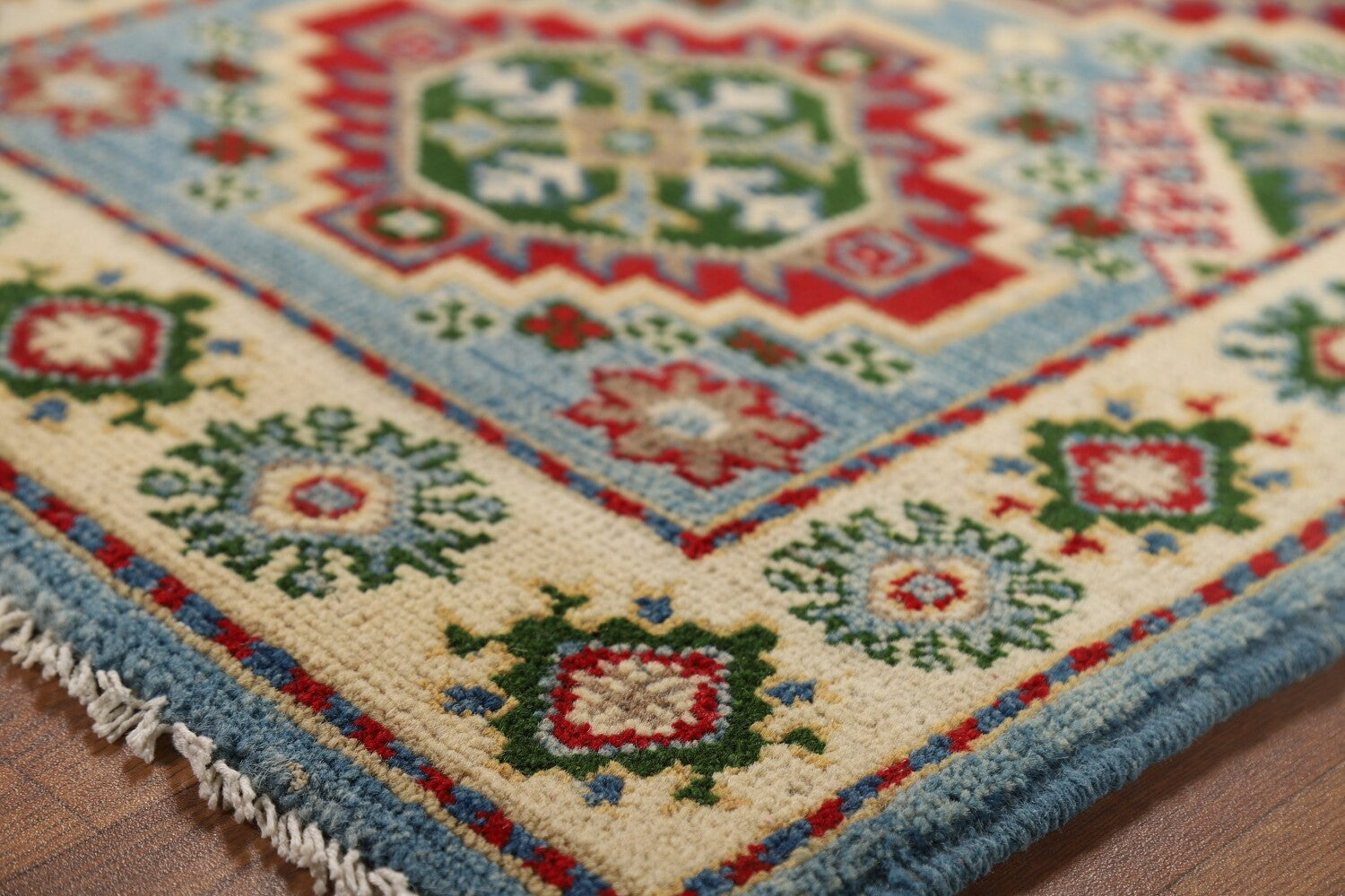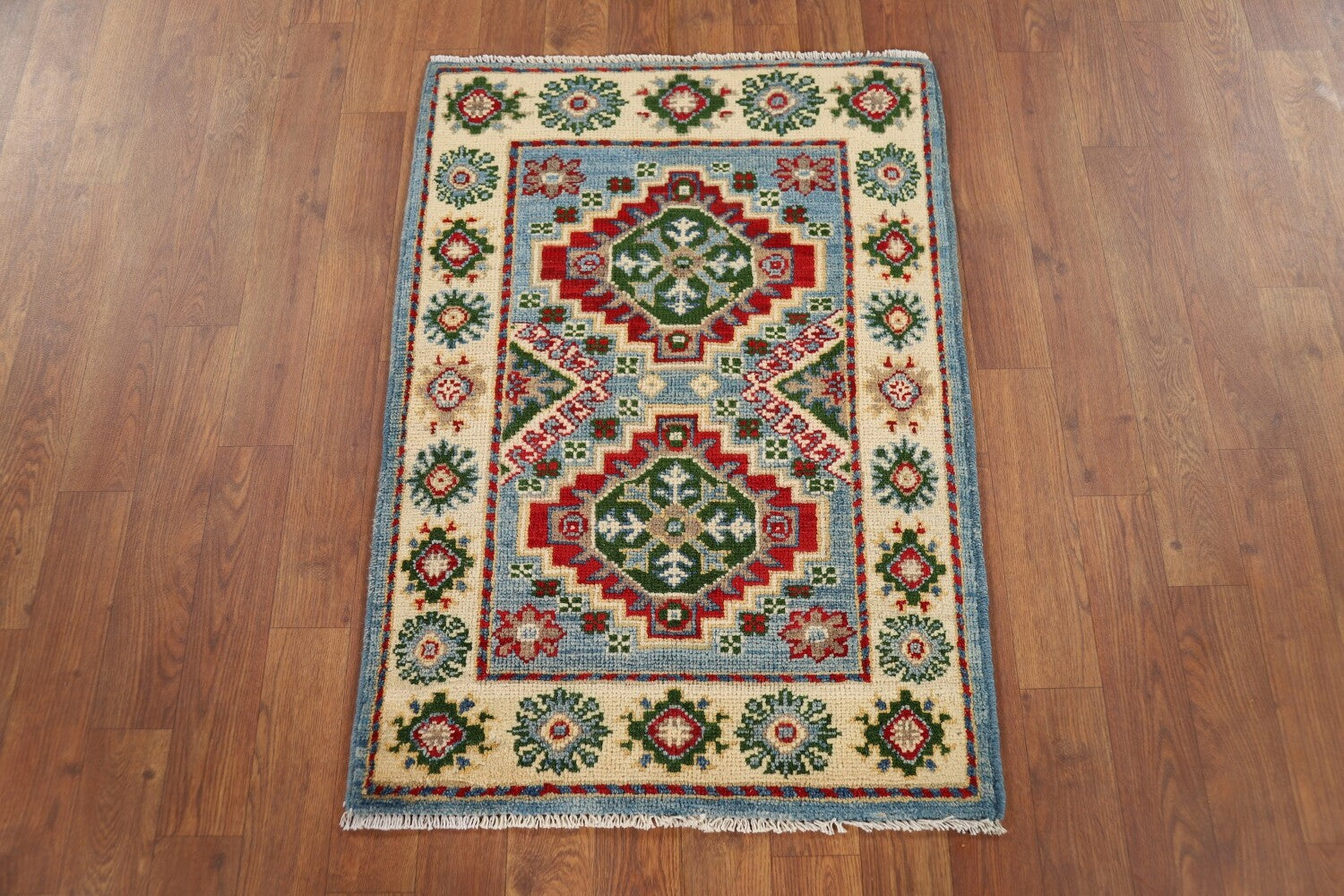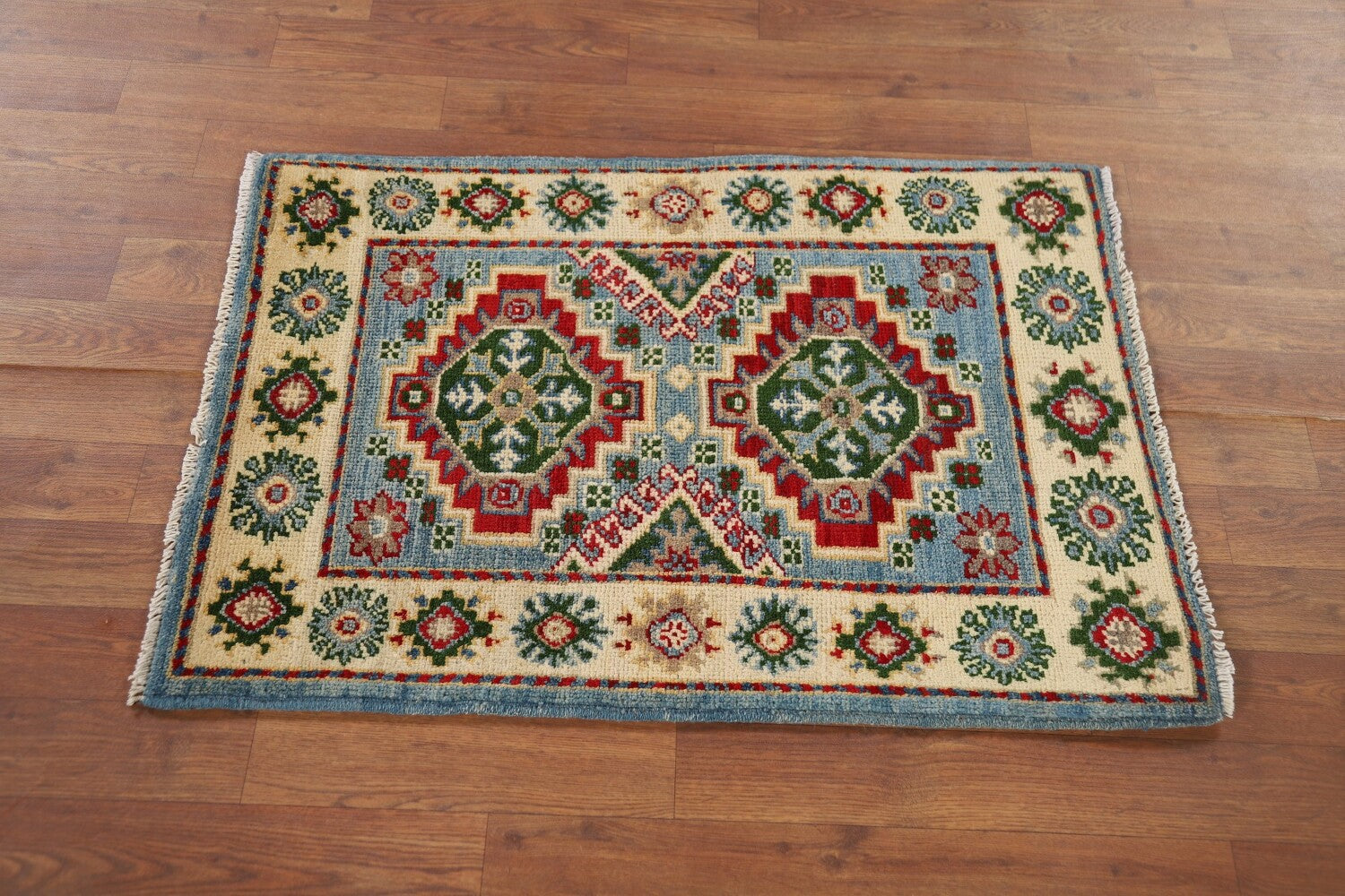 A Beautiful Genuine Pakistan Kazak rug is Hand Knotted by skillful weavers in Pakistan with 100% Wool Material. This rug is in New, First Quality condition. dimensions are 3' 0'' X 2' 1'' in foot and 91 X 64 in centimeter. the primary color is Navy Blue & Blues.