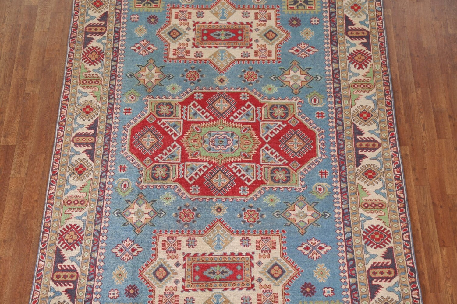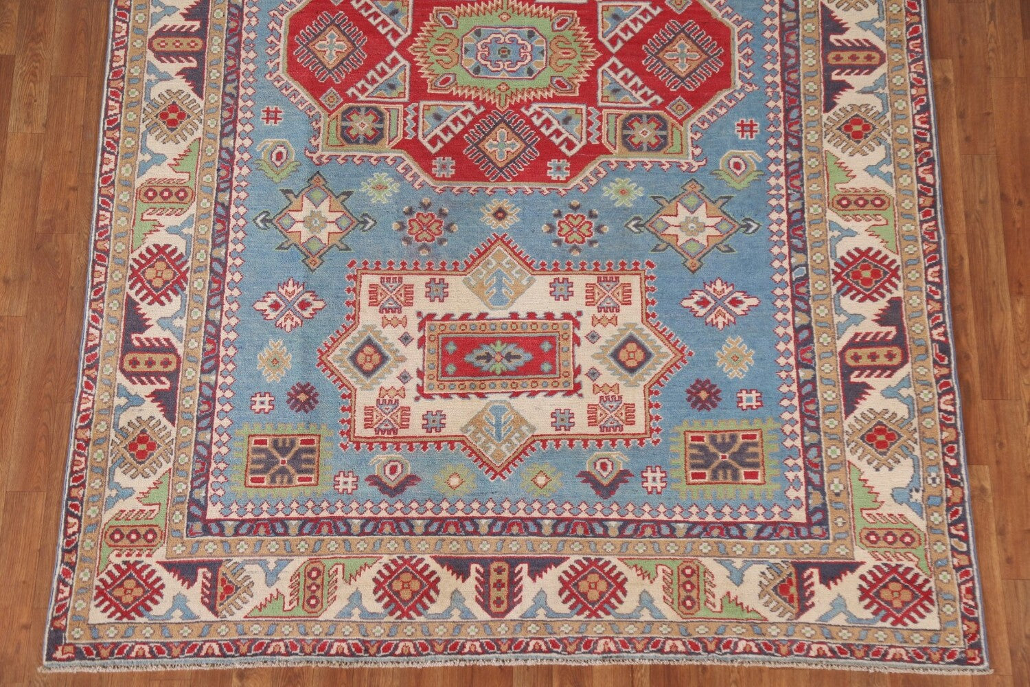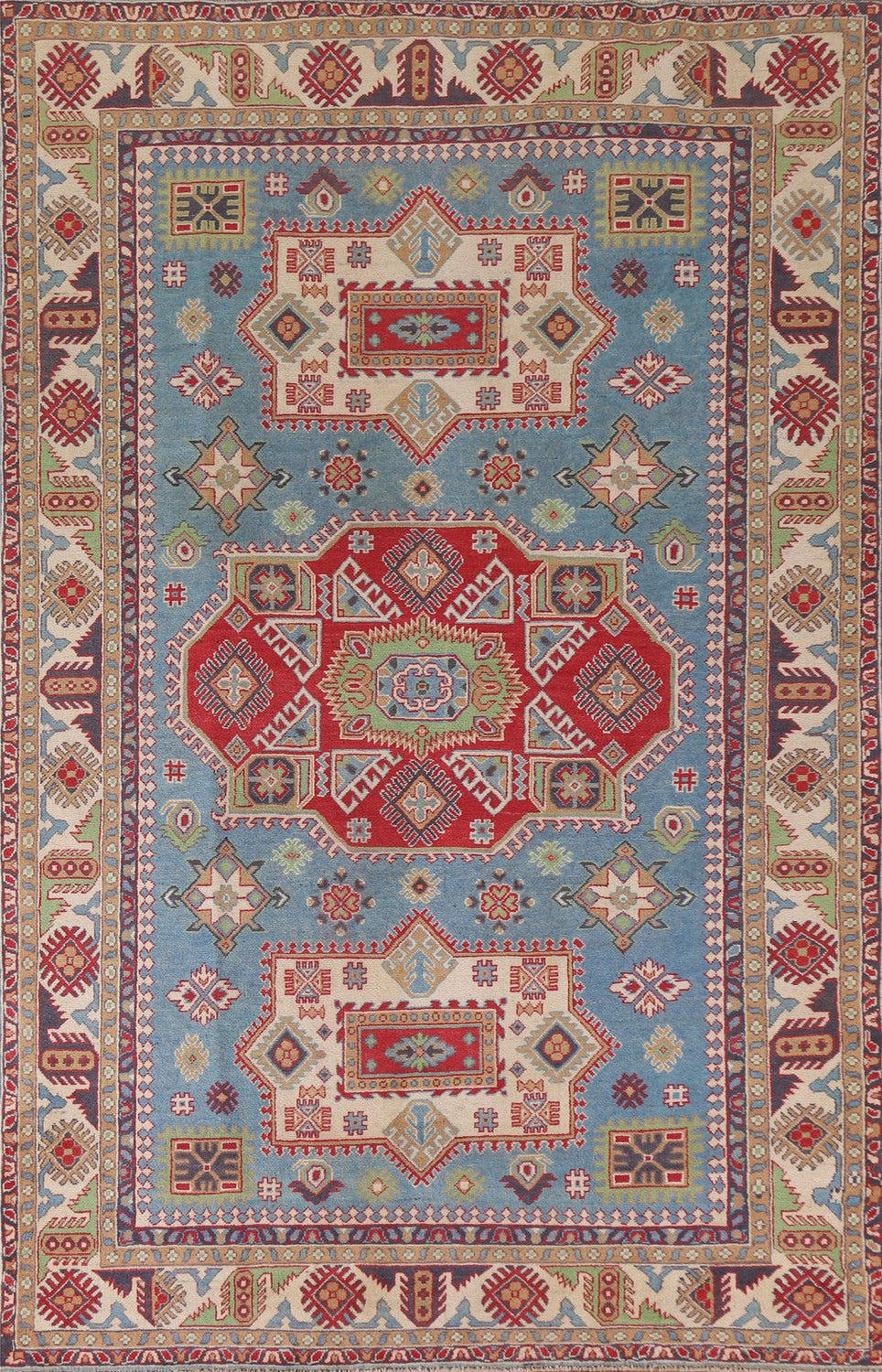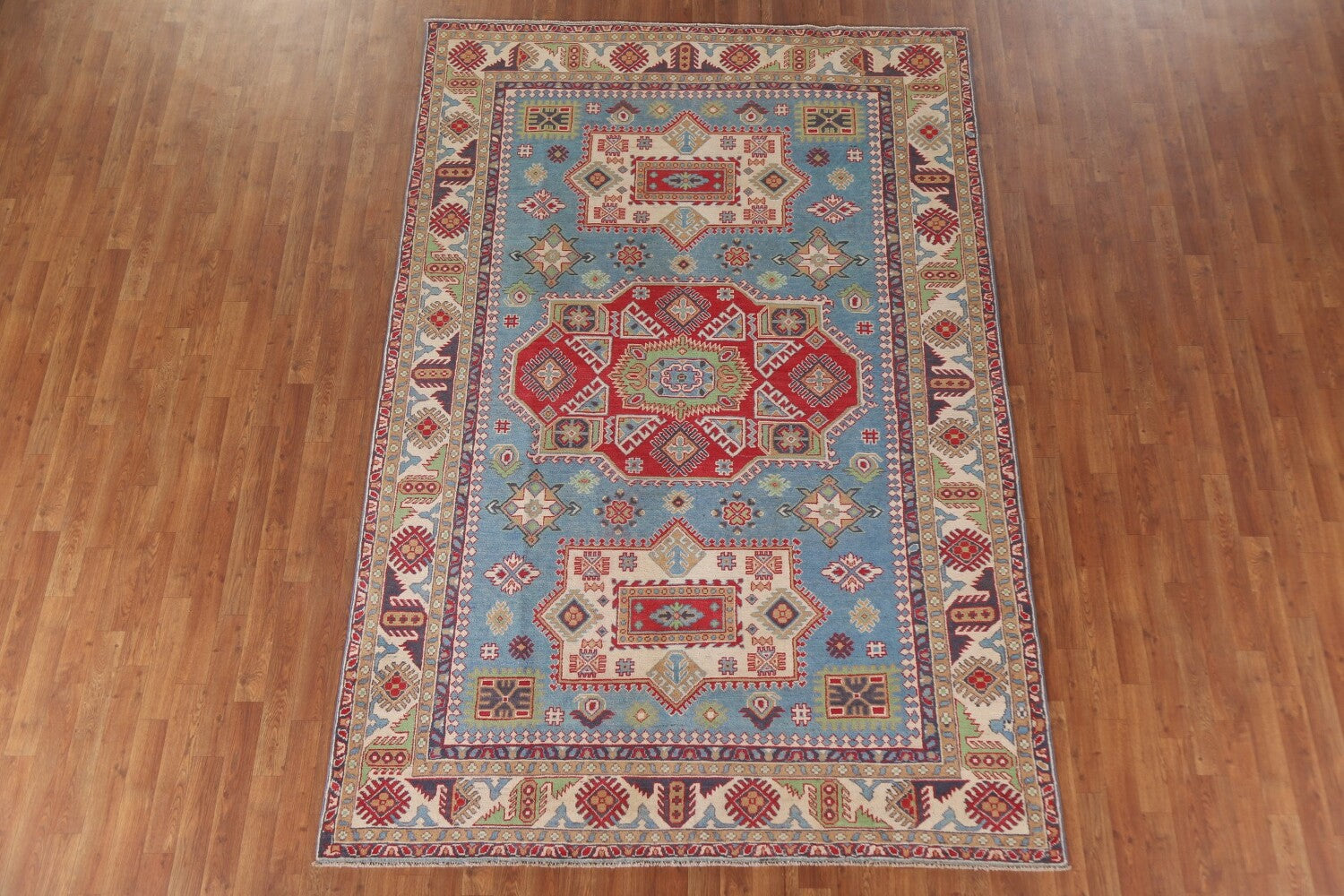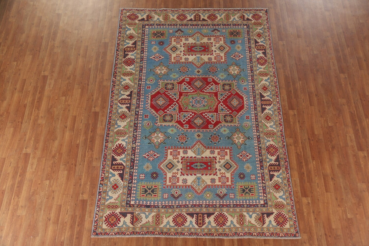 A Beautiful Genuine Pakistan Kazak rug is Hand Knotted by skillful weavers in Pakistan with 100% Wool Material. This rug is in New, First Quality condition. dimensions are 9' 7'' X 6' 5'' in foot and 292 X 196 in centimeter. the primary color is Navy Blue & Blues.