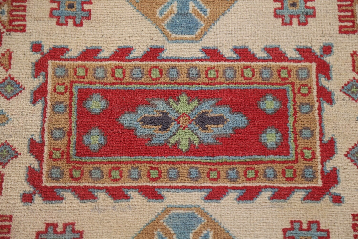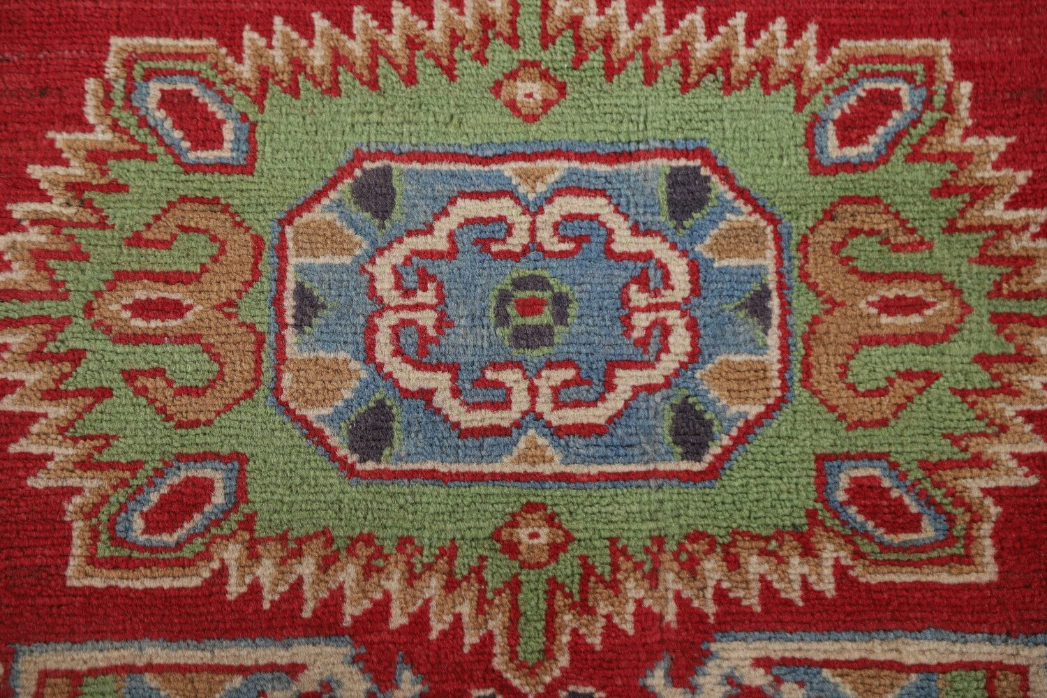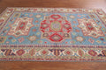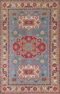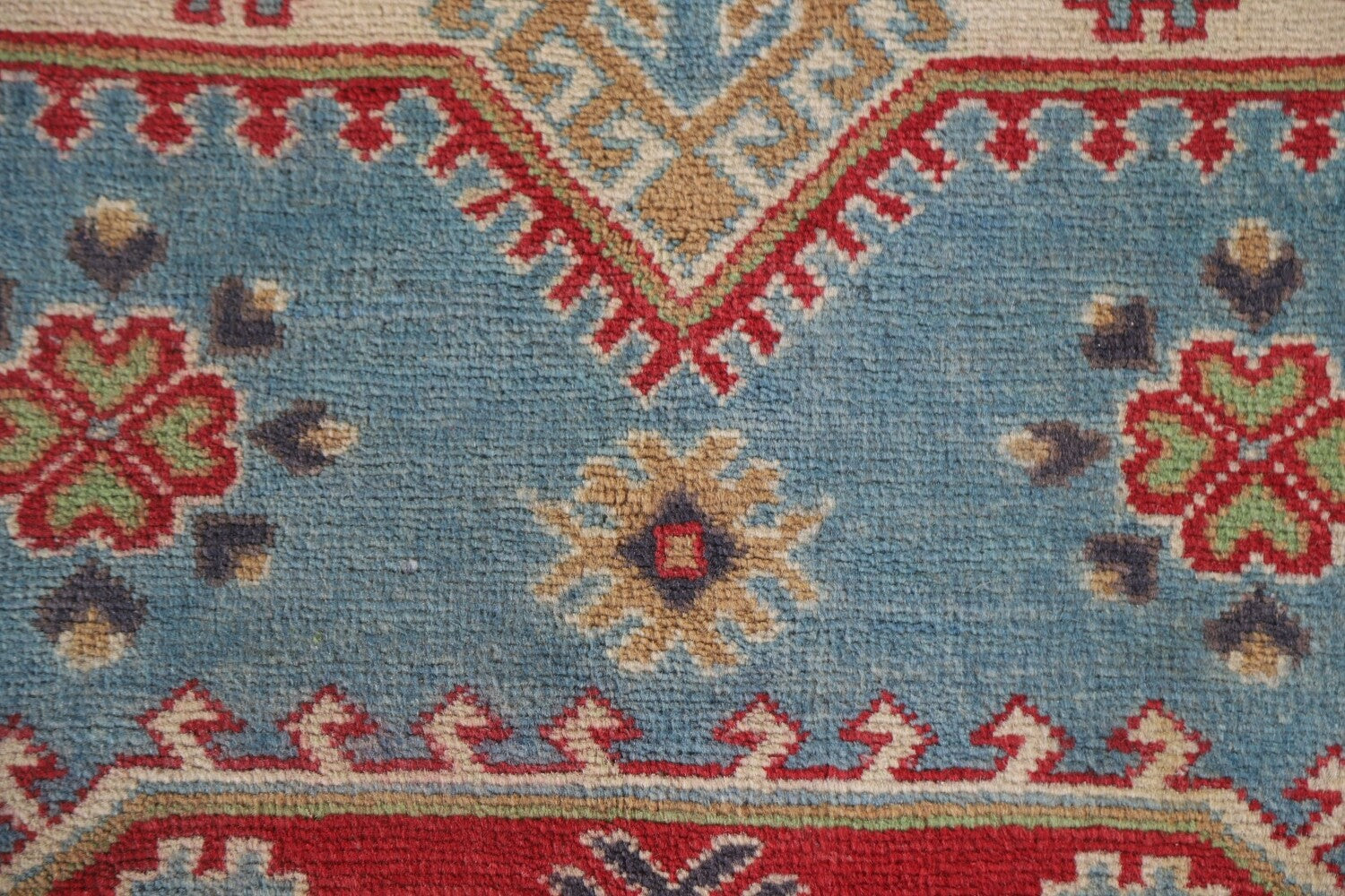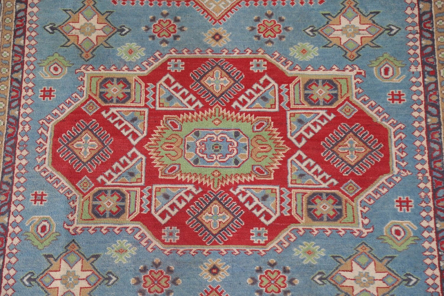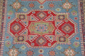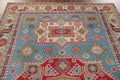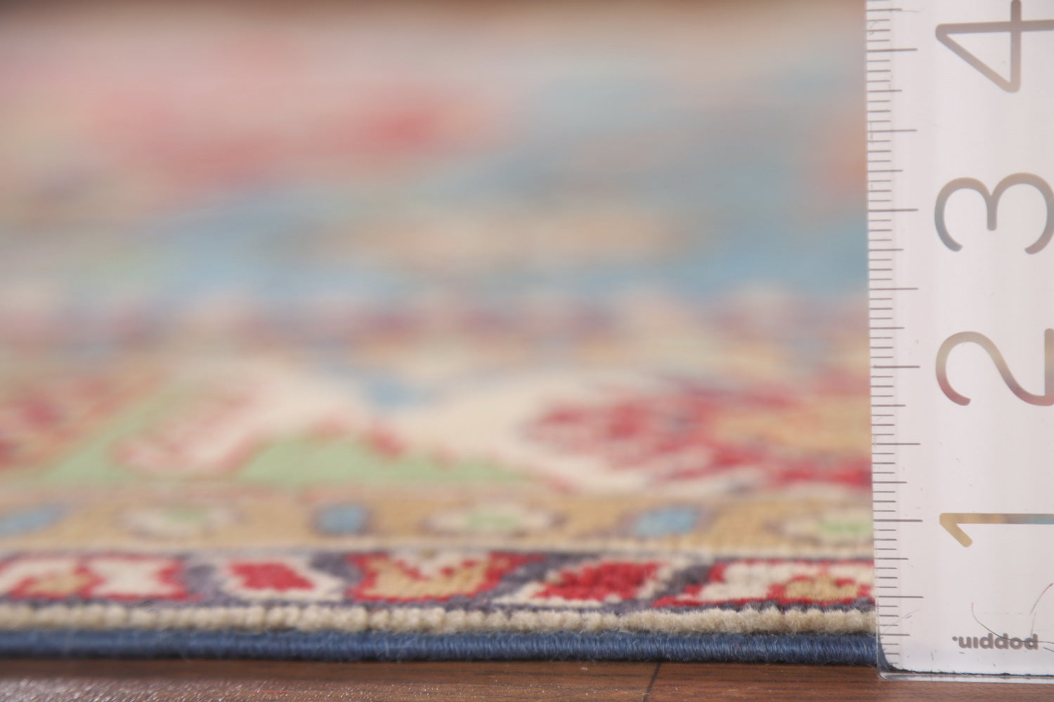A Beautiful Genuine Pakistan Kazak rug is Hand Knotted by skillful weavers in Pakistan with 100% Wool Material. This rug is in New, First Quality condition. dimensions are 9' 7'' X 6' 5'' in foot and 292 X 196 in centimeter. the primary color is Navy Blue & Blues.