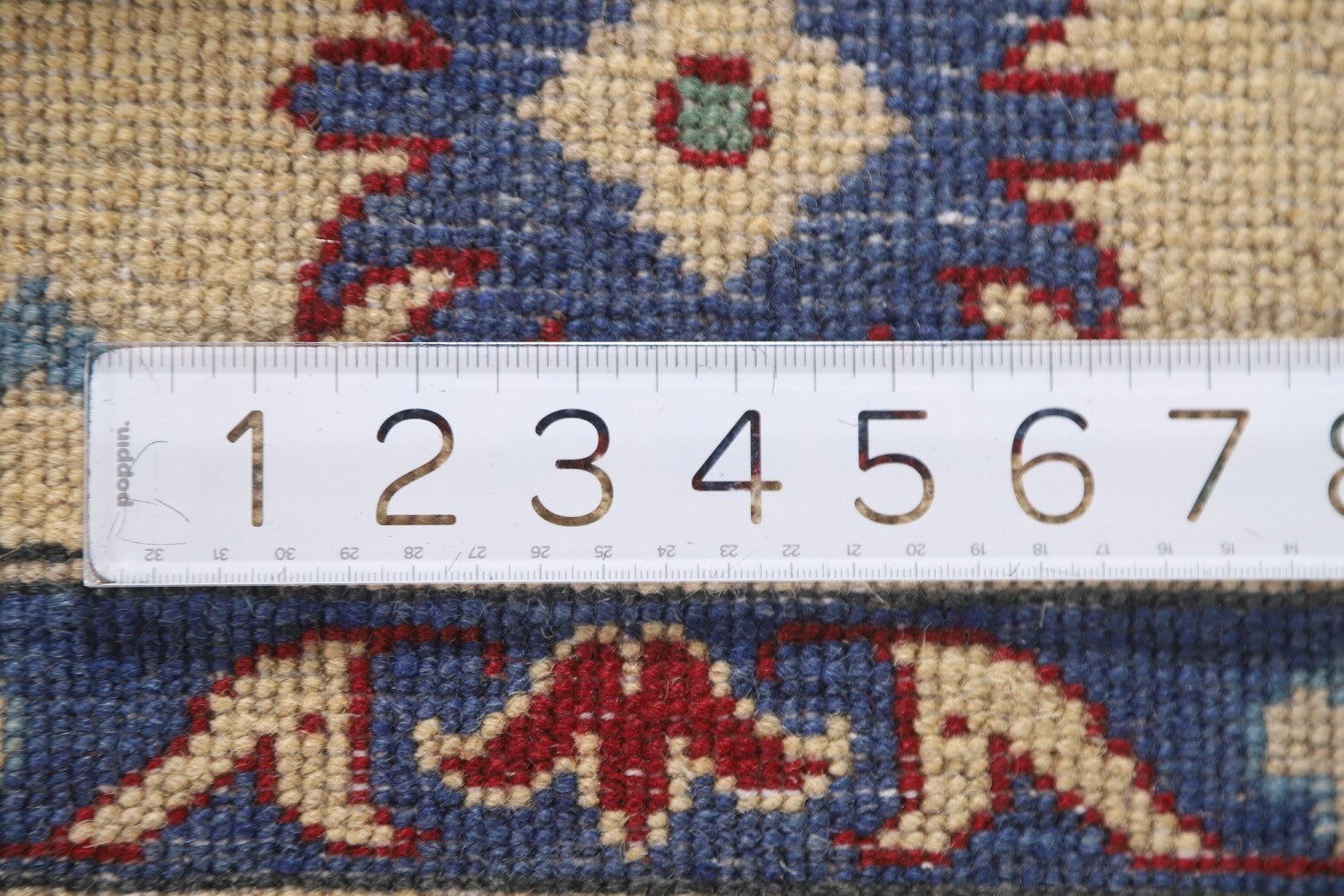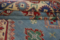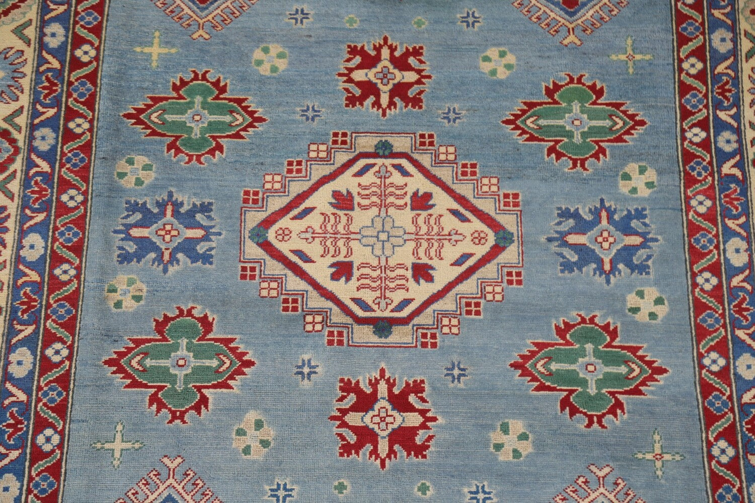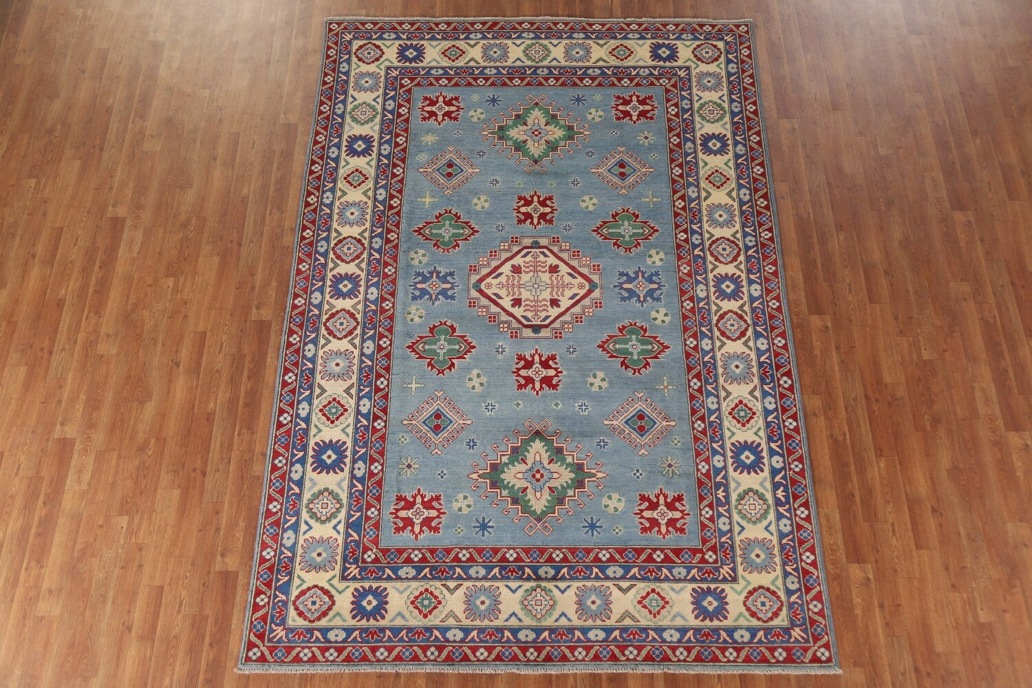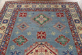 A Beautiful Genuine Pakistan Kazak rug is Hand Knotted by skillful weavers in Pakistan with 100% Wool Material. This rug is in New, First Quality condition. dimensions are 9' 8'' X 6' 7'' in foot and 295 X 201 in centimeter. the primary color is Navy Blue & Blues.