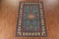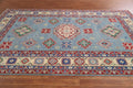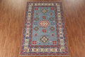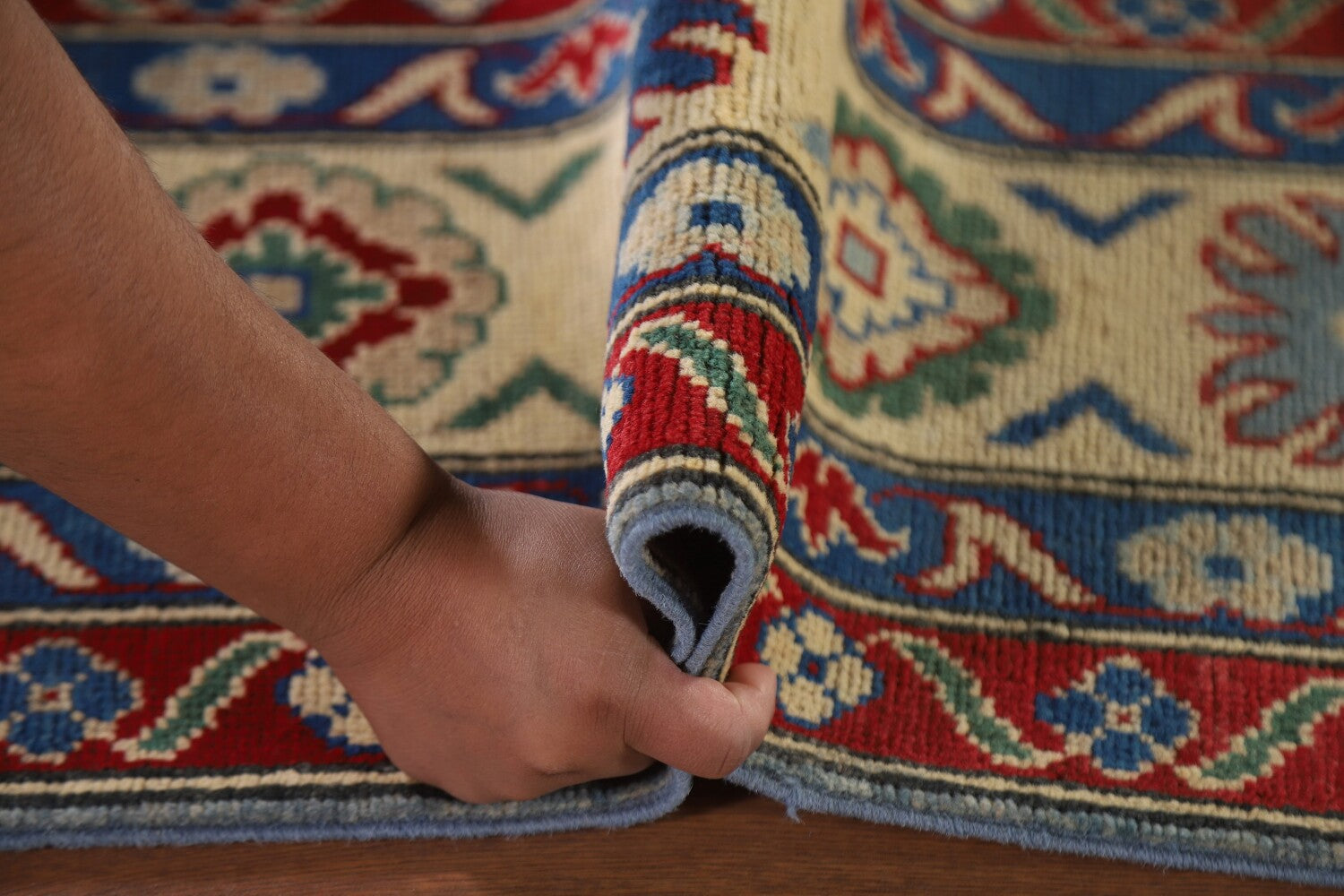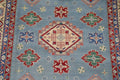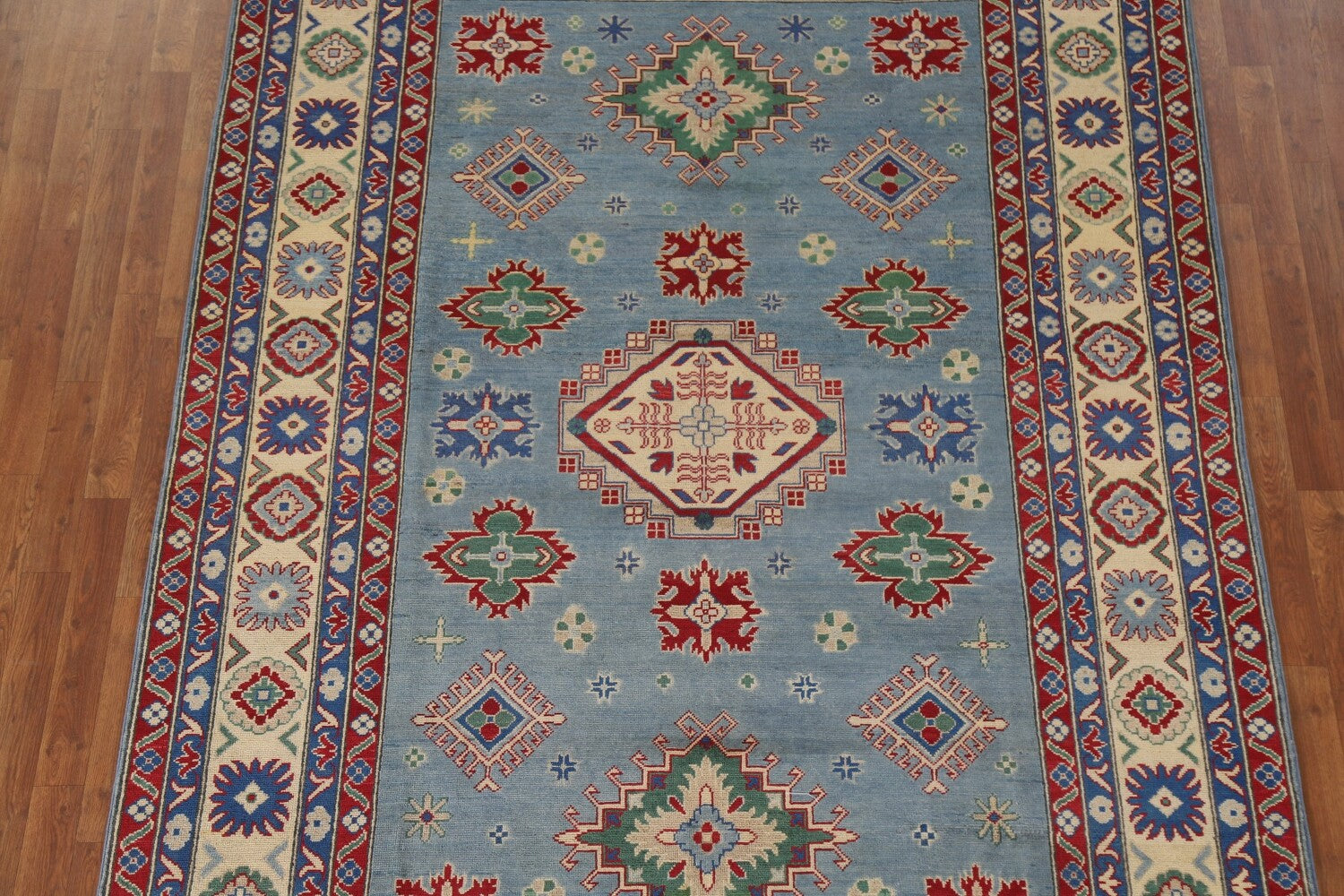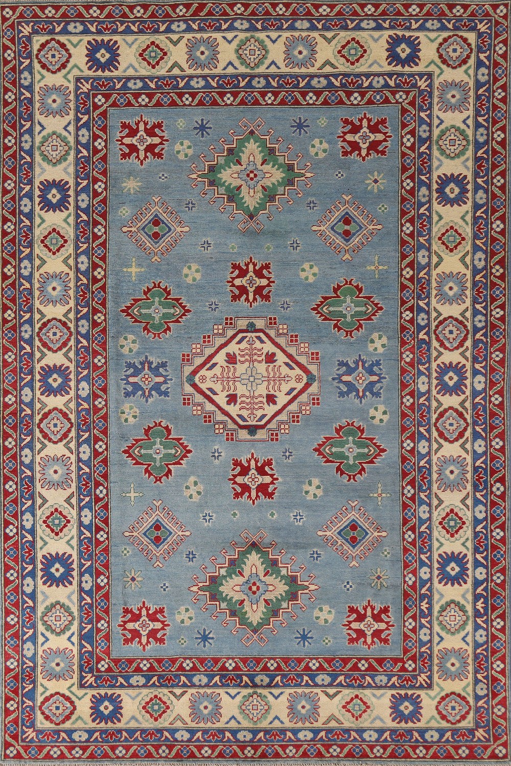 A Beautiful Genuine Pakistan Kazak rug is Hand Knotted by skillful weavers in Pakistan with 100% Wool Material. This rug is in New, First Quality condition. dimensions are 9' 8'' X 6' 7'' in foot and 295 X 201 in centimeter. the primary color is Navy Blue & Blues.