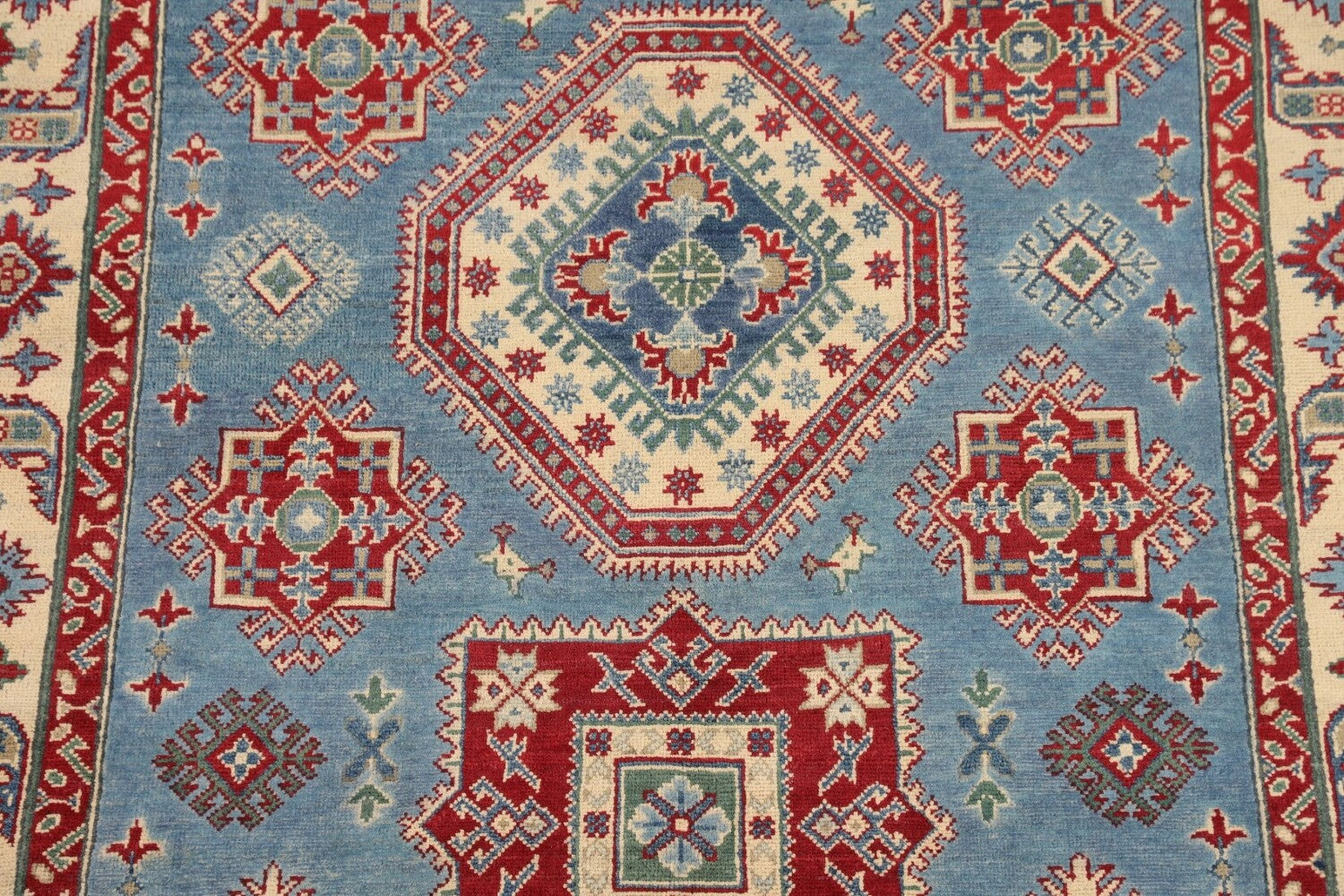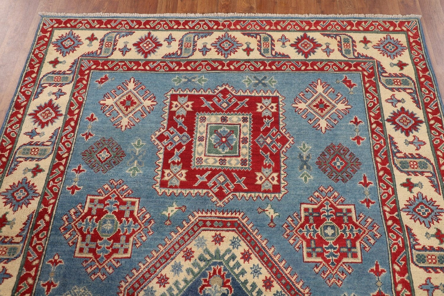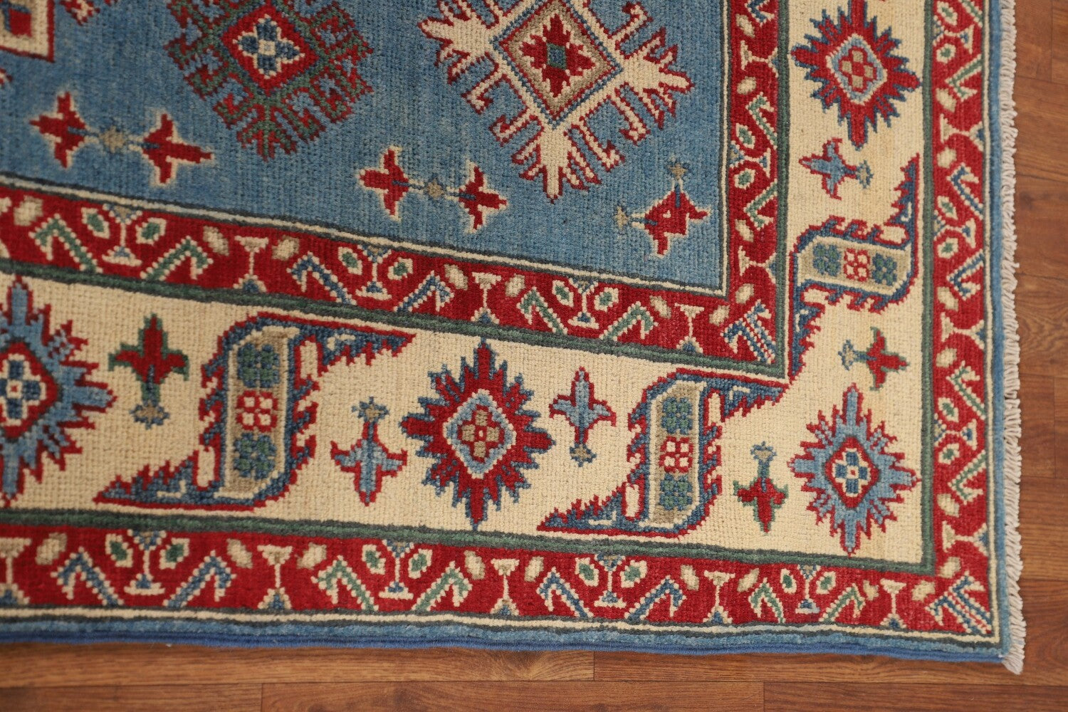 A Beautiful Genuine Pakistan Kazak rug is Hand Knotted by skillful weavers in Pakistan with 100% Wool Material. This rug is in New, First Quality condition. dimensions are 7' 4'' X 5' 0'' in foot and 224 X 152 in centimeter. the primary color is Navy Blue & Blues.