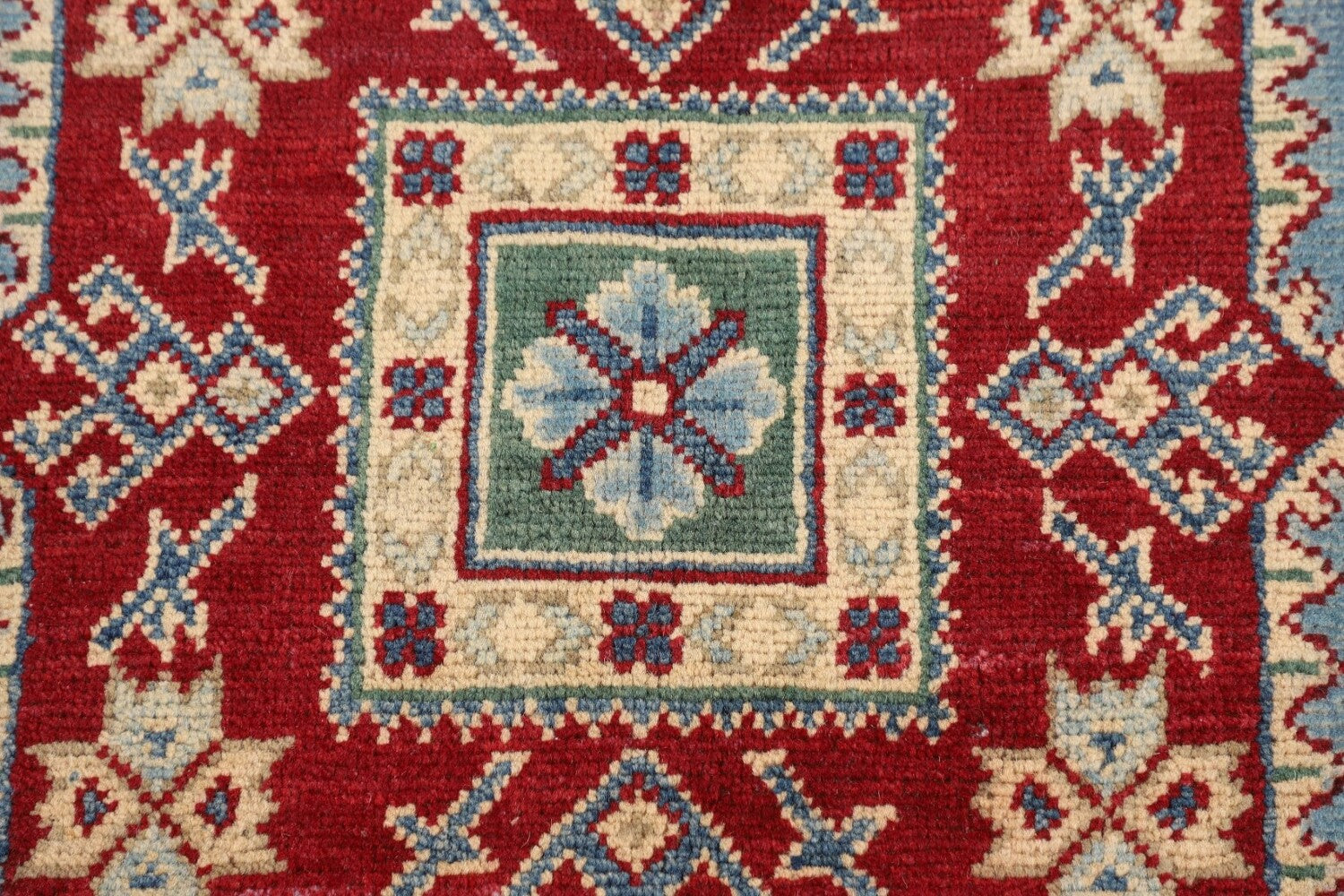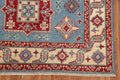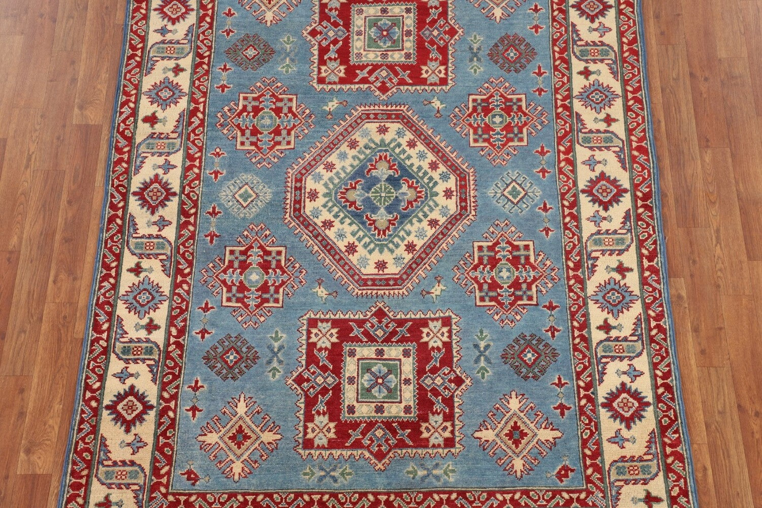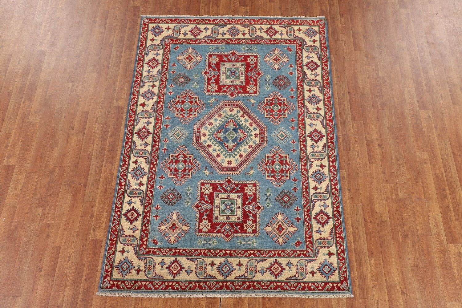 A Beautiful Genuine Pakistan Kazak rug is Hand Knotted by skillful weavers in Pakistan with 100% Wool Material. This rug is in New, First Quality condition. dimensions are 7' 4'' X 5' 0'' in foot and 224 X 152 in centimeter. the primary color is Navy Blue & Blues.