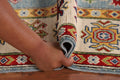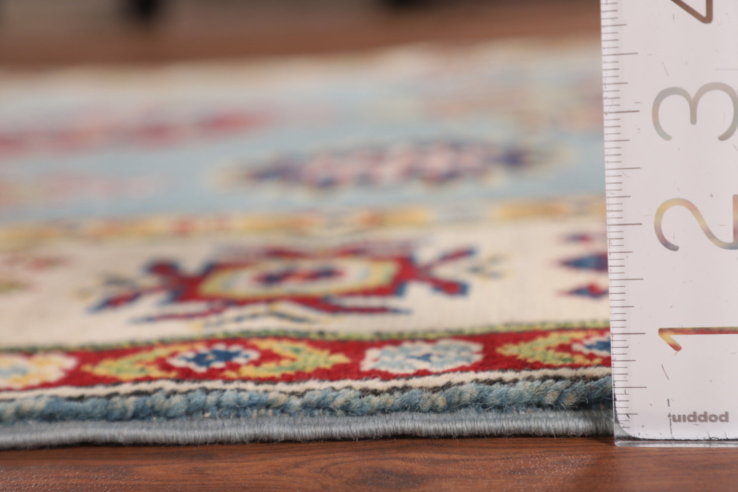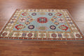 A Beautiful Genuine Pakistan Kazak rug is Hand Knotted by skillful weavers in Pakistan with 100% Wool Material. This rug is in New, First Quality condition. dimensions are 6' 11'' X 5' 1'' in foot and 211 X 155 in centimeter. the primary color is Navy Blue & Blues.