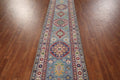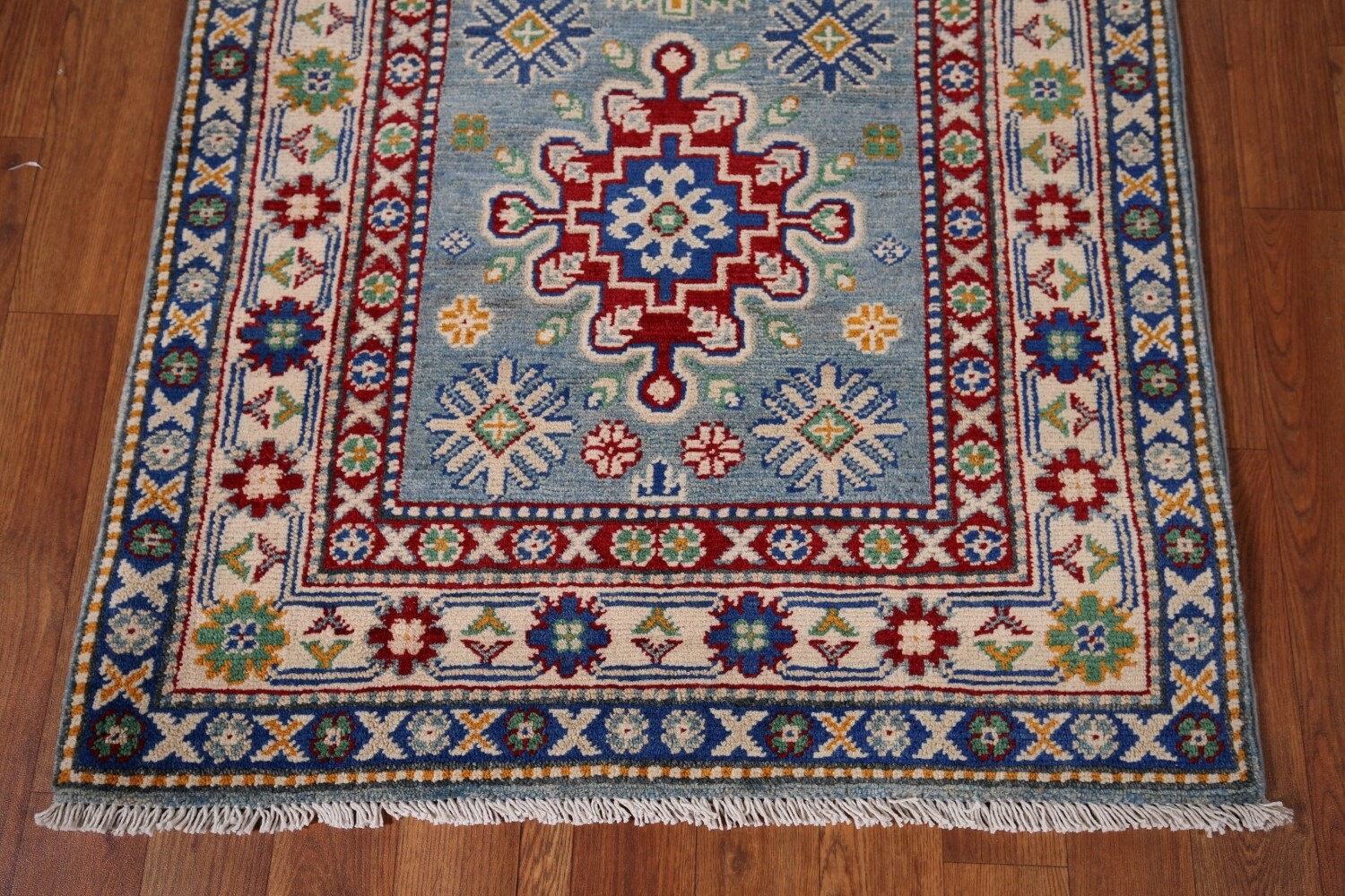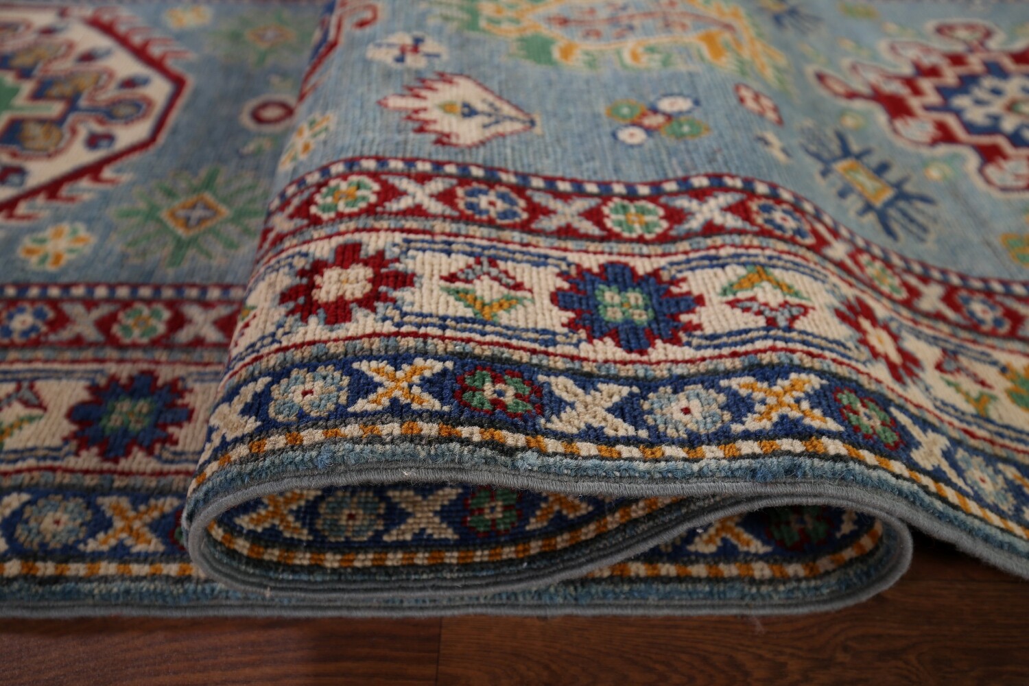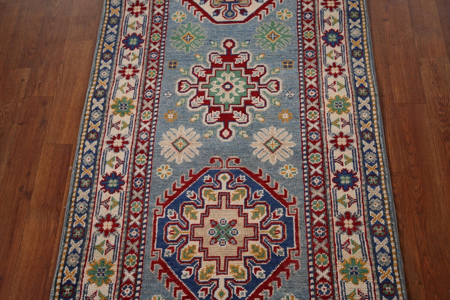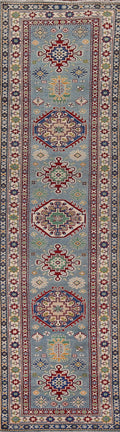 A Beautiful Genuine Pakistan Kazak rug is Hand Knotted by skillful weavers in Pakistan with 100% Wool Material. This rug is in New, First Quality condition. dimensions are 12' 7'' X 2' 7'' in foot and 384 X 79 in centimeter. the primary color is Navy Blue & Blues.