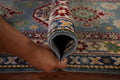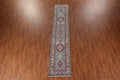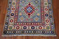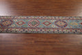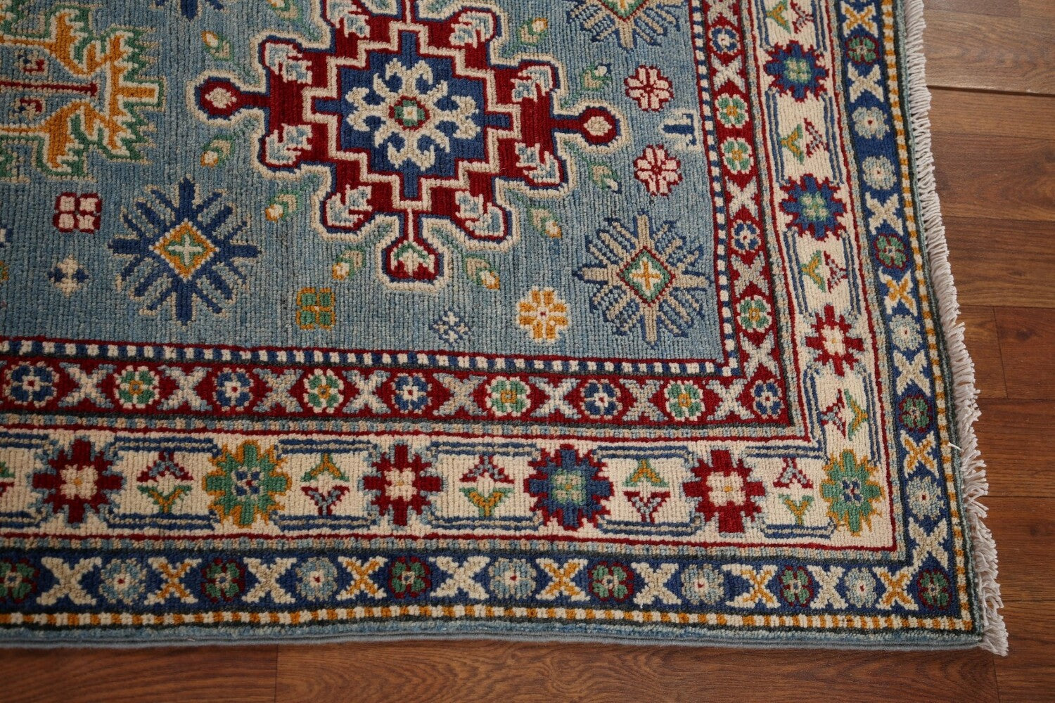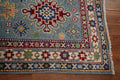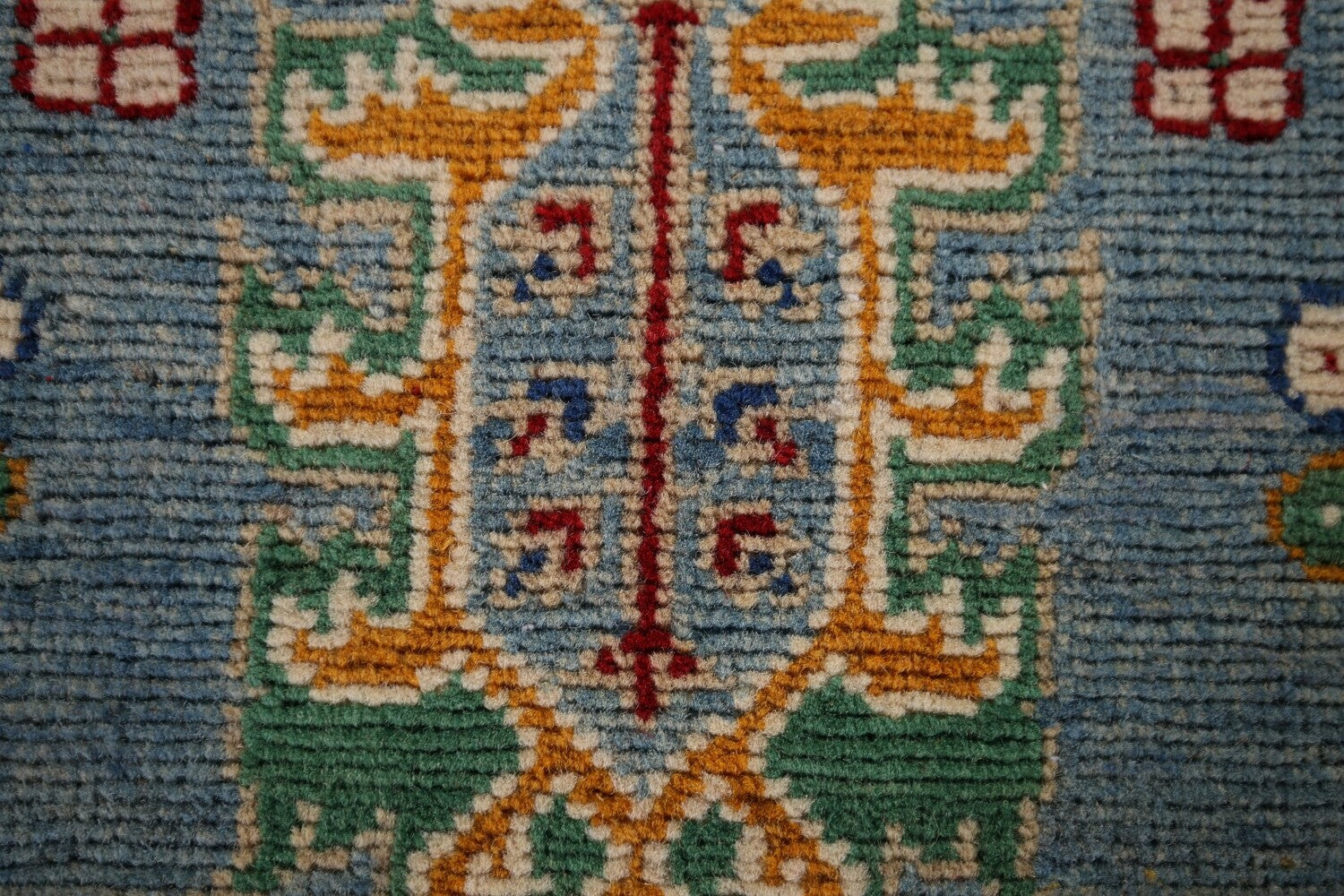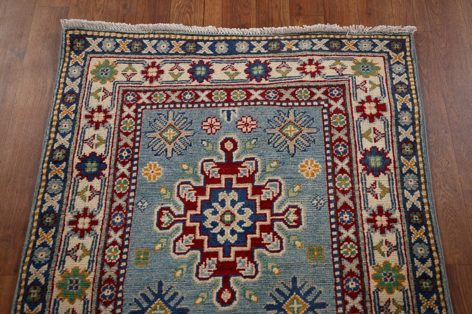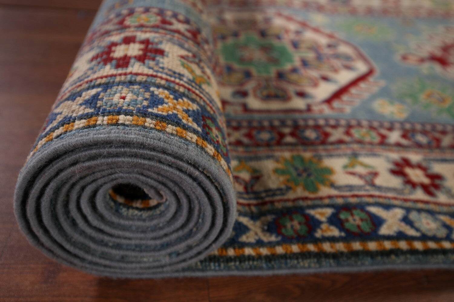 A Beautiful Genuine Pakistan Kazak rug is Hand Knotted by skillful weavers in Pakistan with 100% Wool Material. This rug is in New, First Quality condition. dimensions are 12' 7'' X 2' 7'' in foot and 384 X 79 in centimeter. the primary color is Navy Blue & Blues.