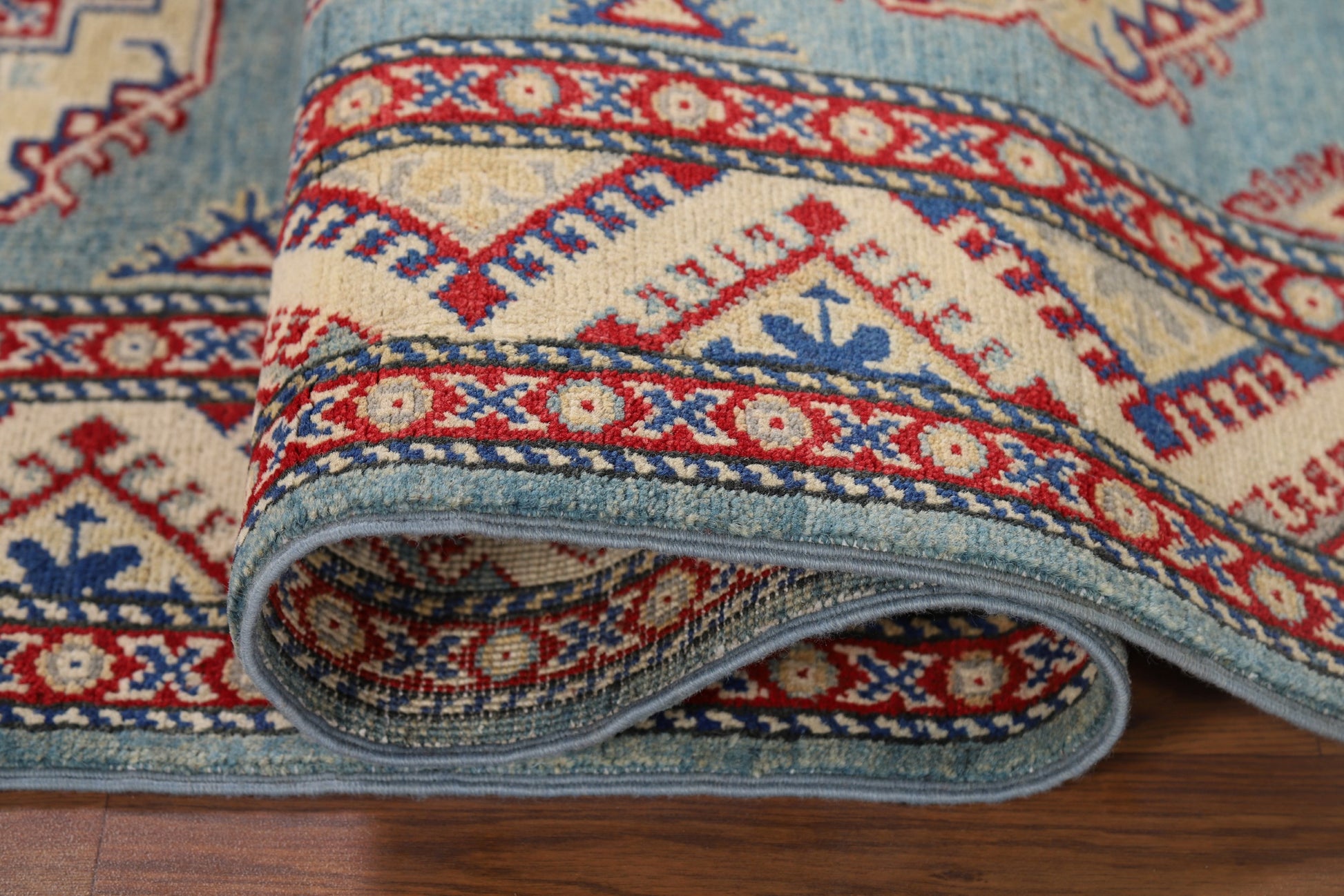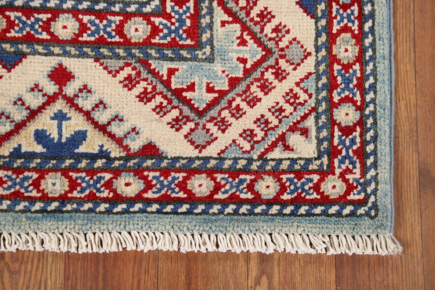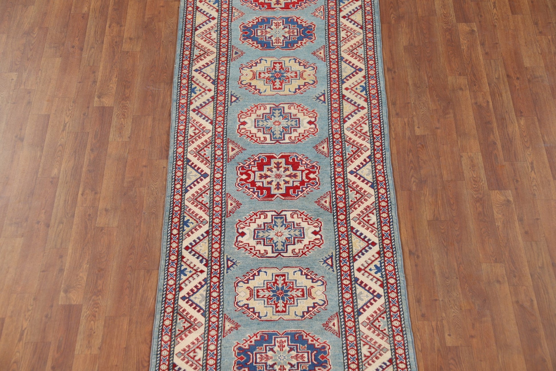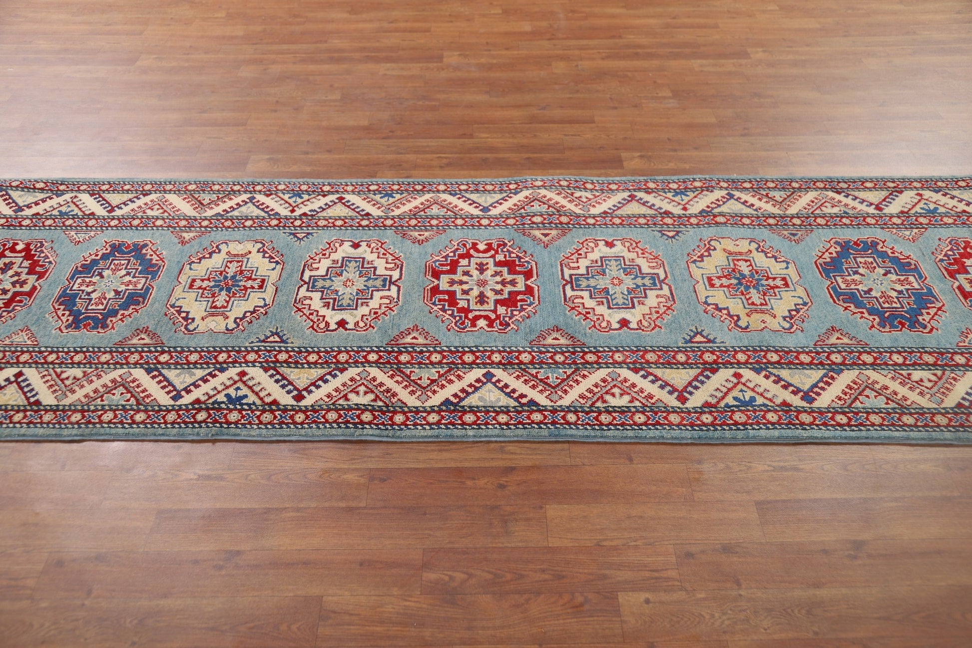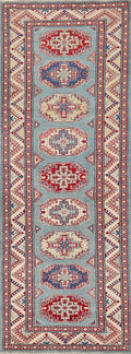 A Beautiful Genuine Pakistan Kazak rug is Hand Knotted by skillful weavers in Pakistan with 100% Wool Material. This rug is in New, First Quality condition. dimensions are 9' 7'' X 2' 11'' in foot and 292 X 89 in centimeter. the primary color is Navy Blue & Blues.