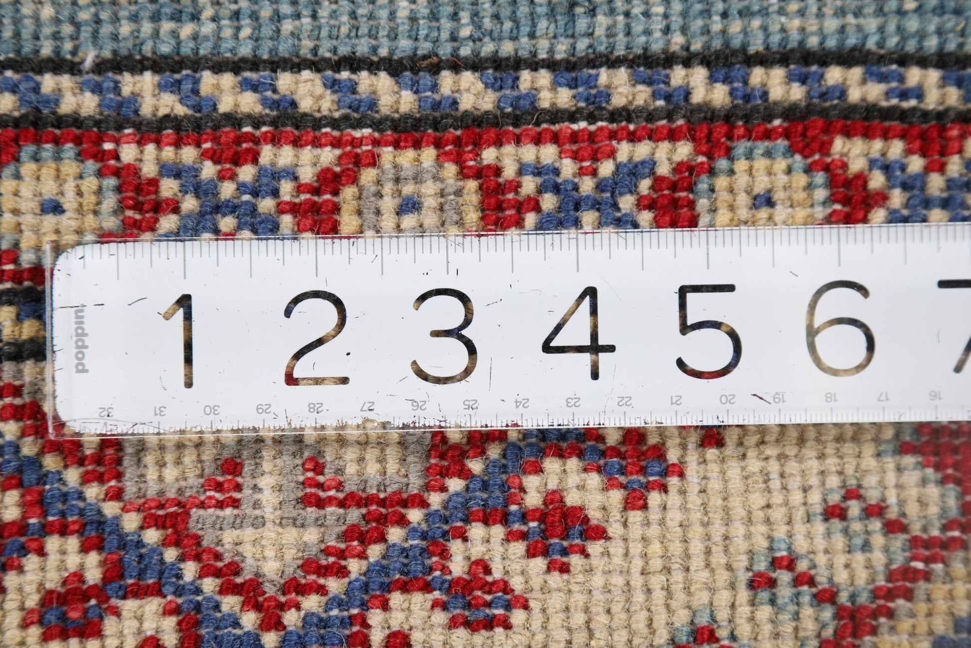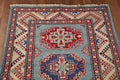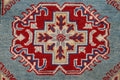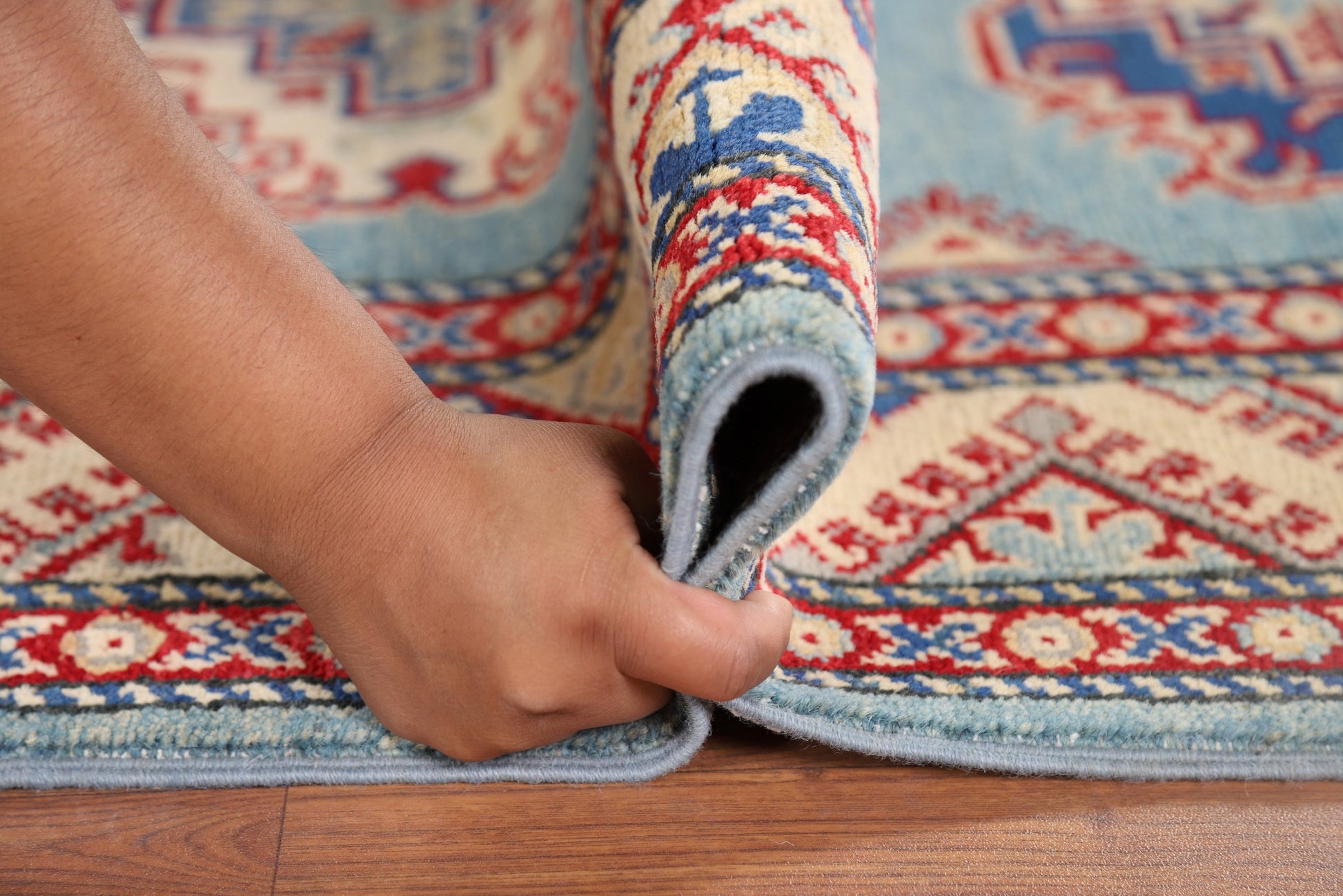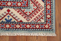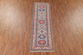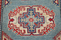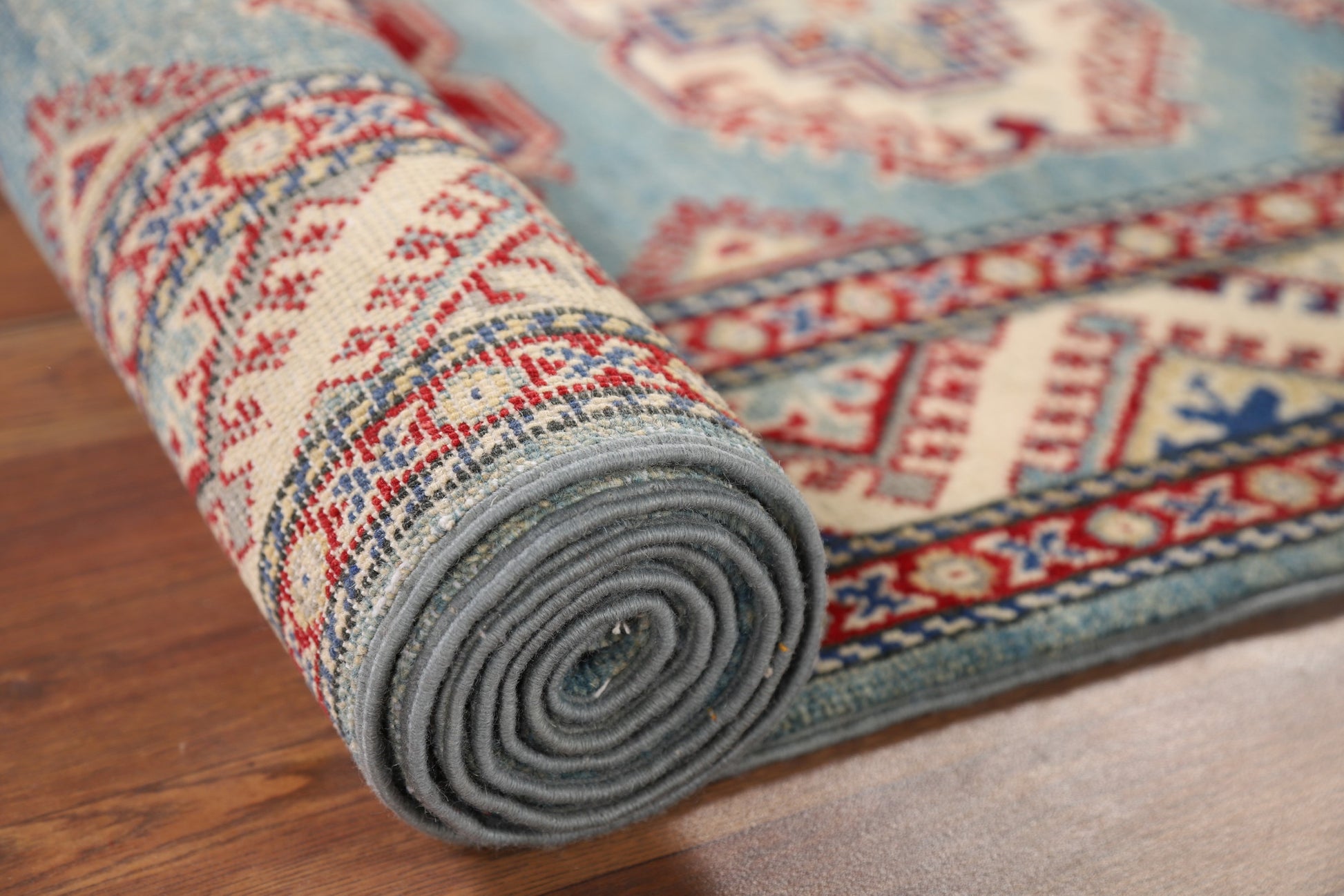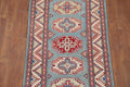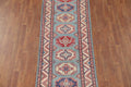 A Beautiful Genuine Pakistan Kazak rug is Hand Knotted by skillful weavers in Pakistan with 100% Wool Material. This rug is in New, First Quality condition. dimensions are 9' 7'' X 2' 11'' in foot and 292 X 89 in centimeter. the primary color is Navy Blue & Blues.