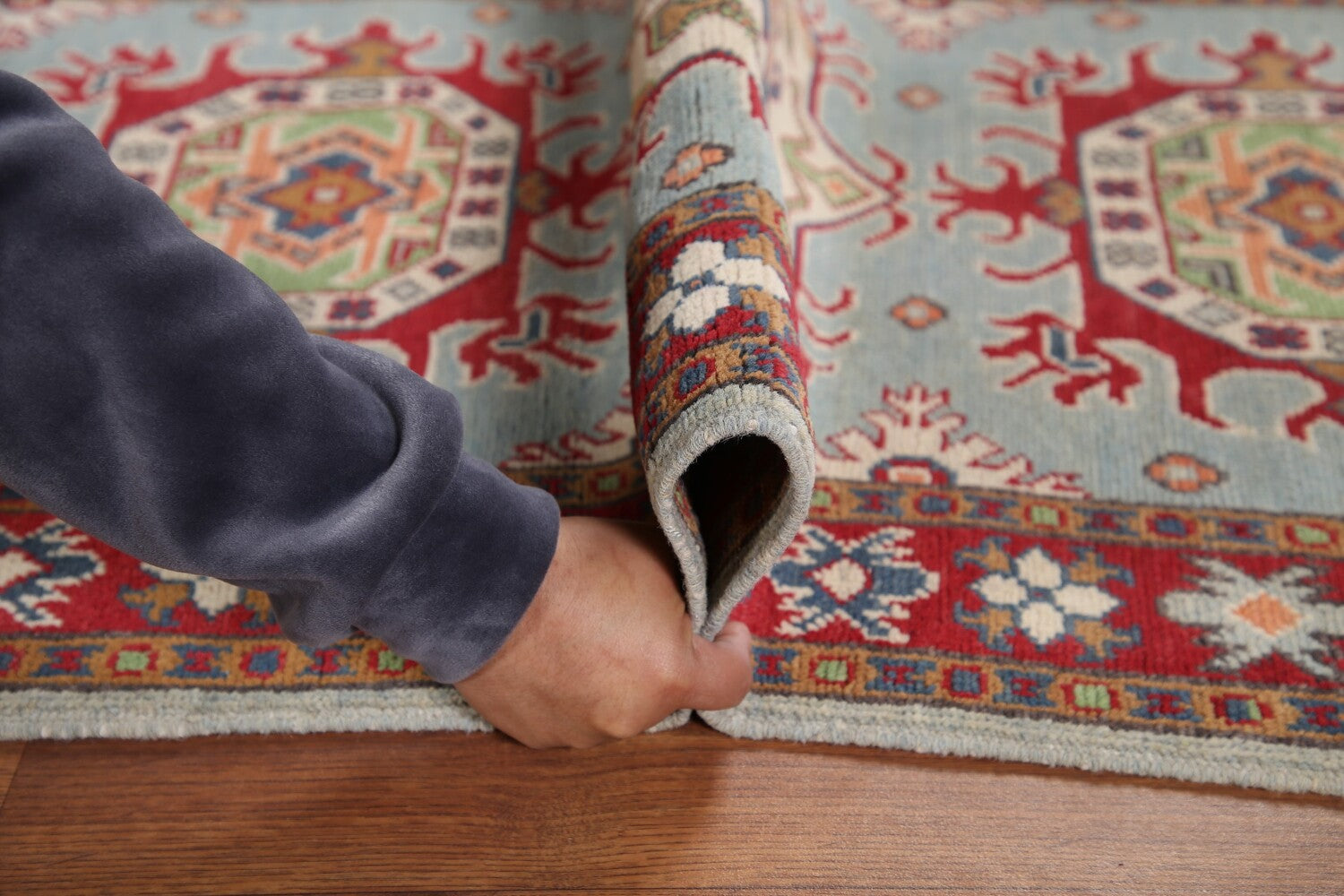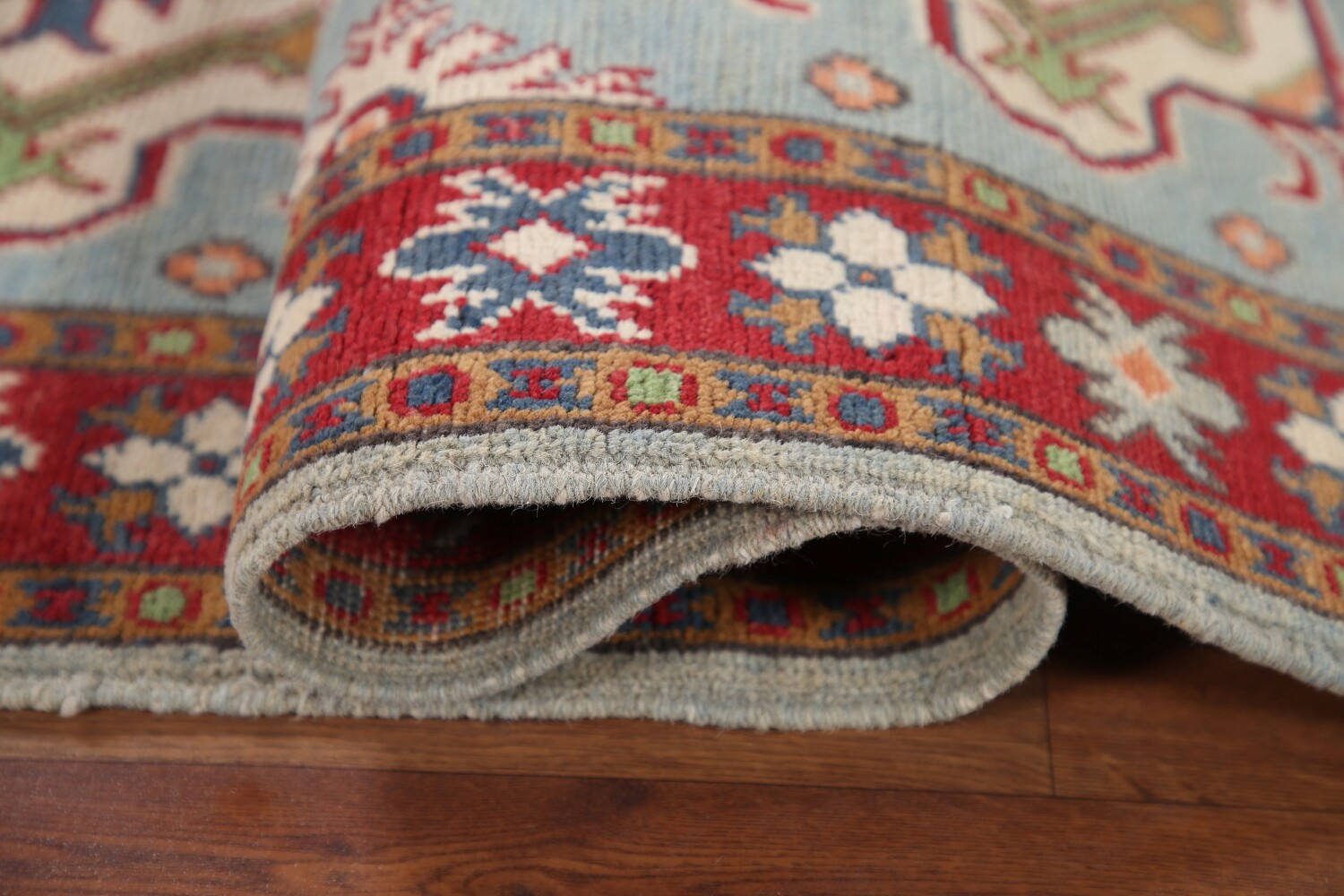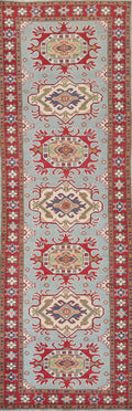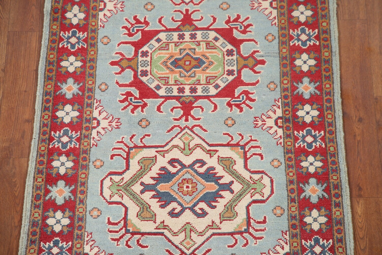 A Beautiful Genuine Pakistan Kazak rug is Hand Knotted by skillful weavers in Pakistan with 100% Wool Material. This rug is in New, First Quality condition. dimensions are 9' 10'' X 2' 8'' in foot and 300 X 81 in centimeter. the primary color is Navy Blue & Blues.