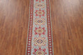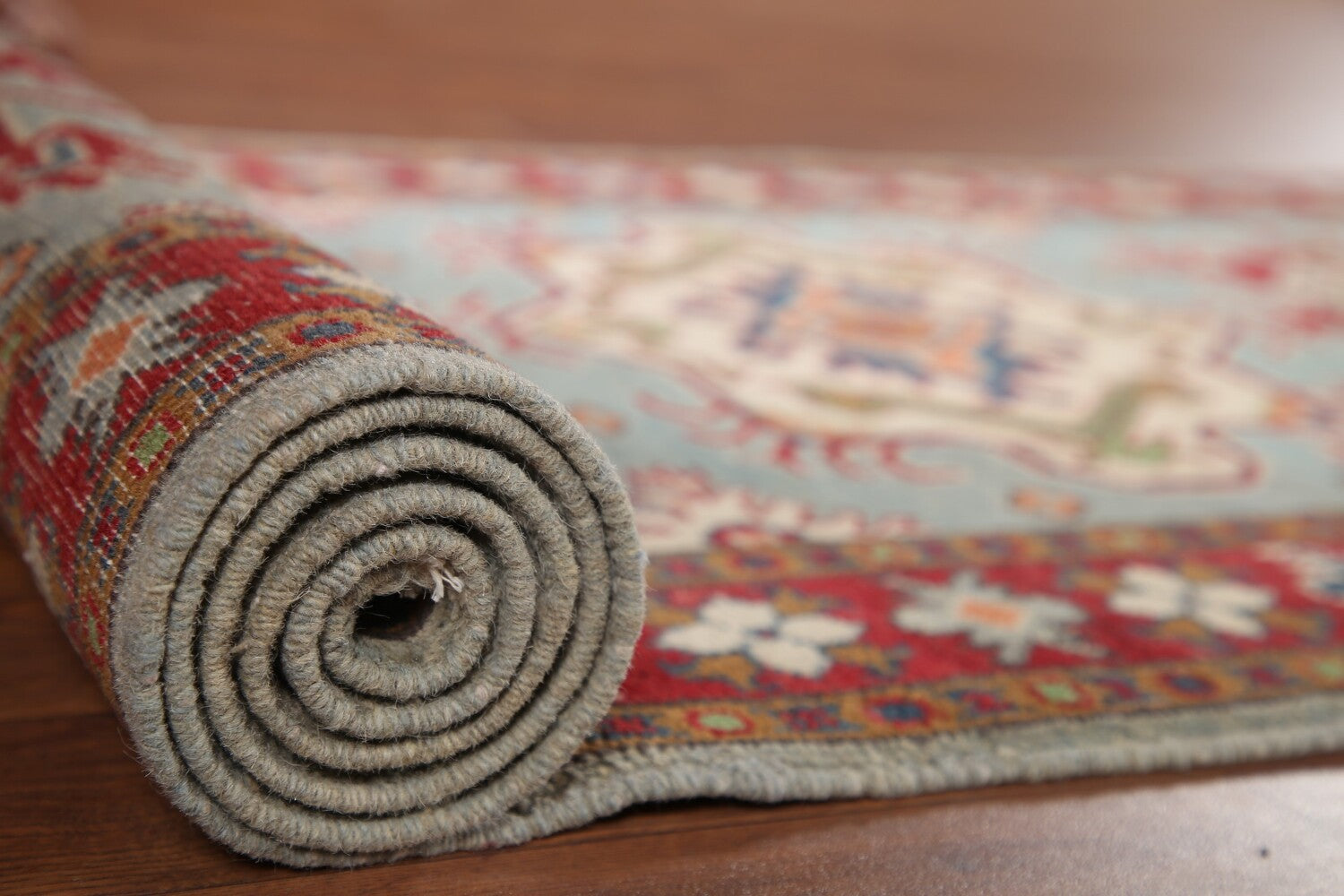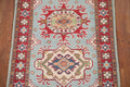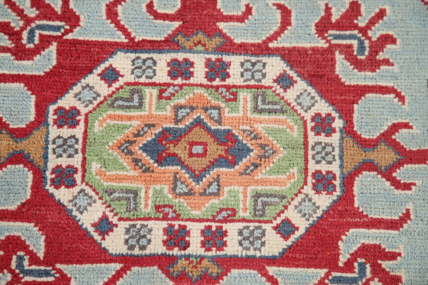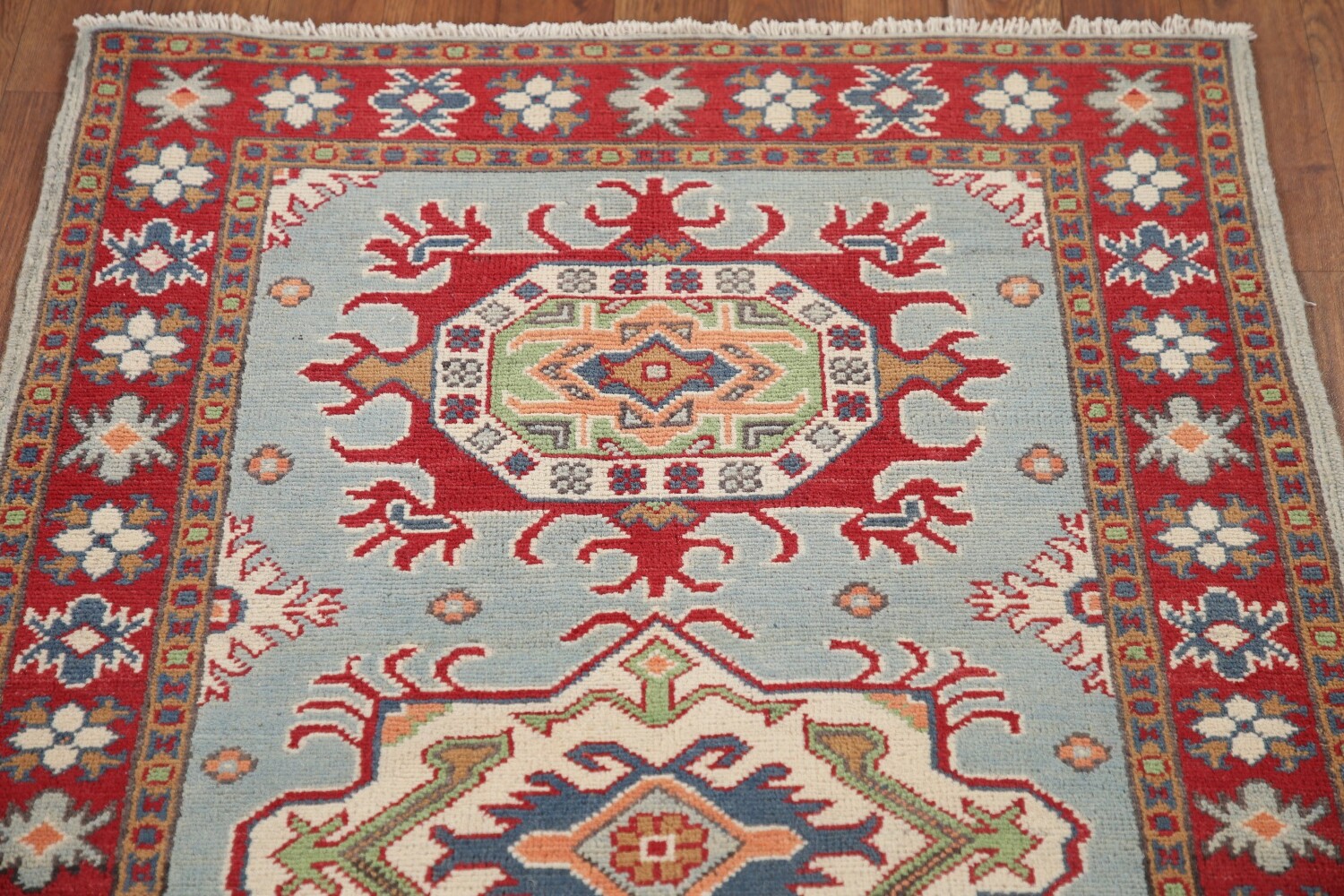 A Beautiful Genuine Pakistan Kazak rug is Hand Knotted by skillful weavers in Pakistan with 100% Wool Material. This rug is in New, First Quality condition. dimensions are 9' 10'' X 2' 8'' in foot and 300 X 81 in centimeter. the primary color is Navy Blue & Blues.