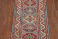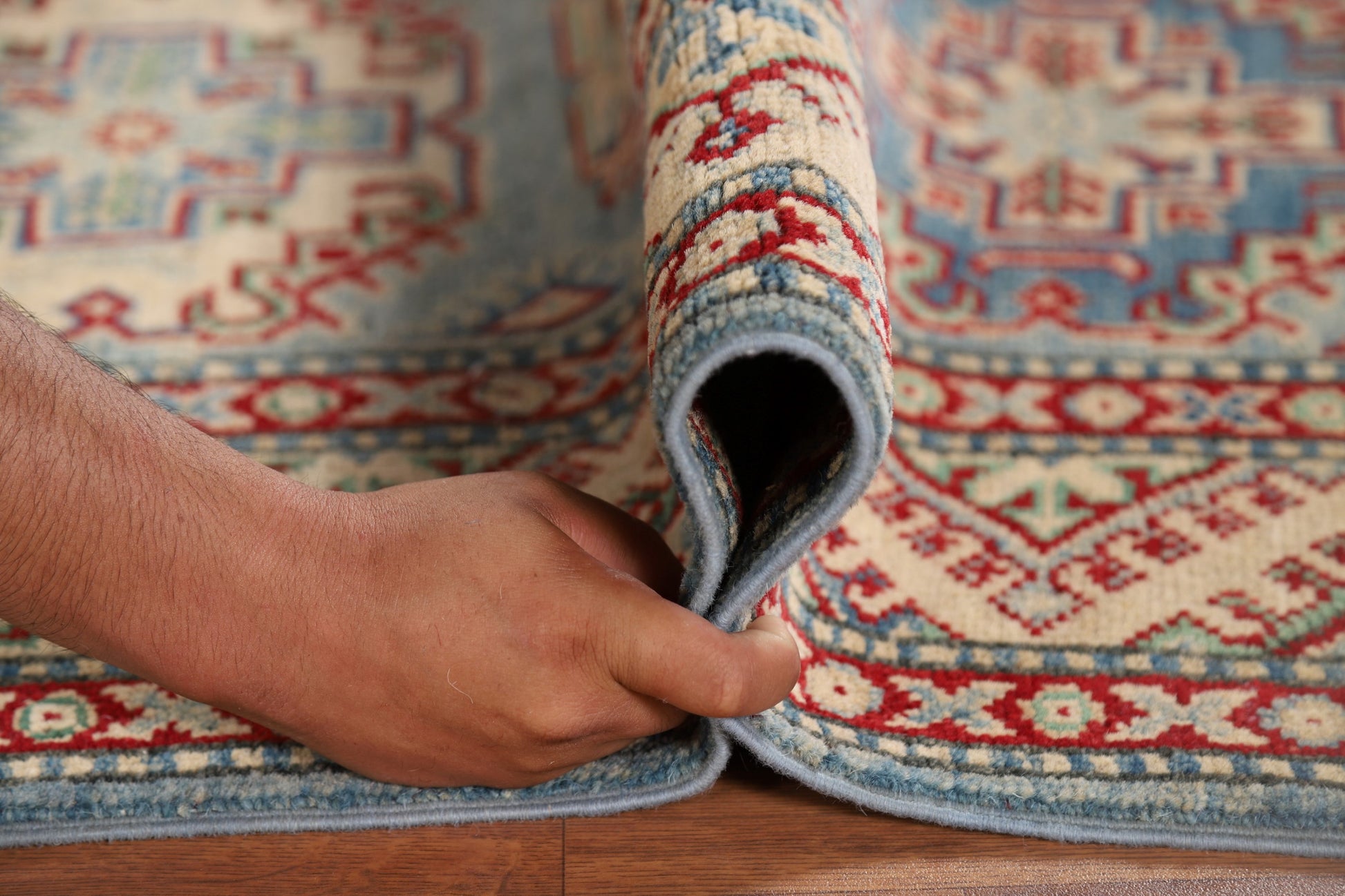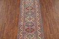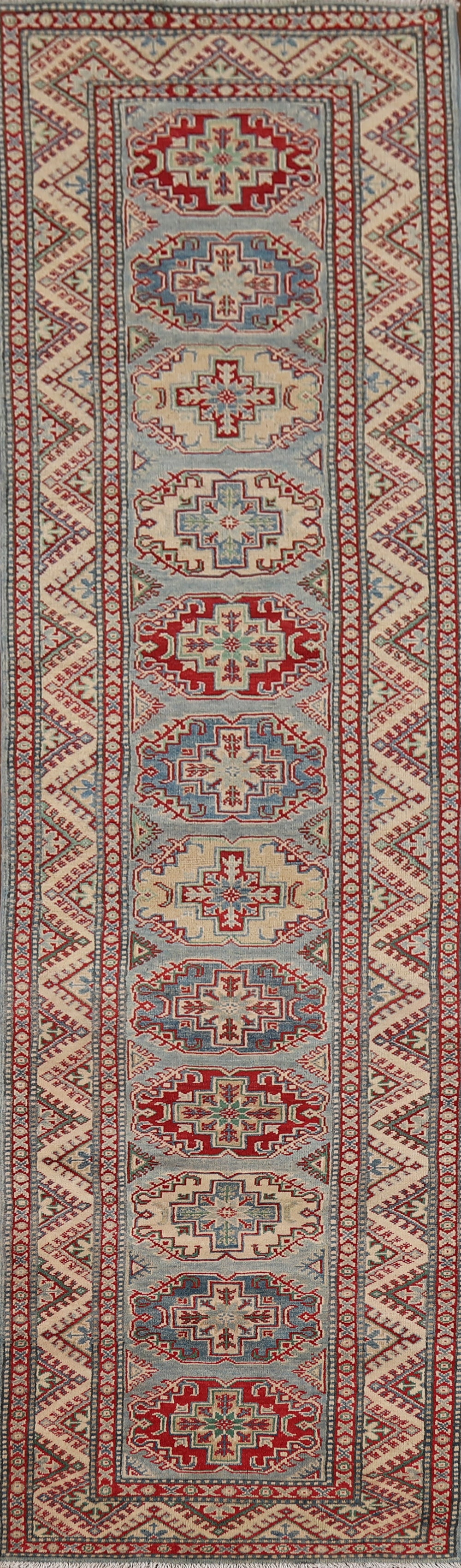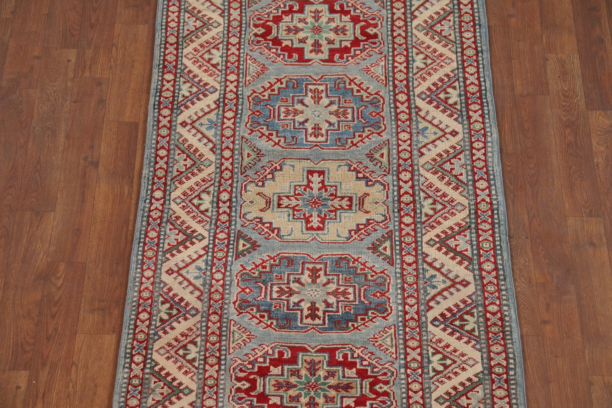 A Beautiful Genuine Pakistan Kazak rug is Hand Knotted by skillful weavers in Pakistan with 100% Wool Material. This rug is in New, First Quality condition. dimensions are 12' 3'' X 2' 9'' in foot and 373 X 84 in centimeter. the primary color is Navy Blue & Blues.