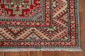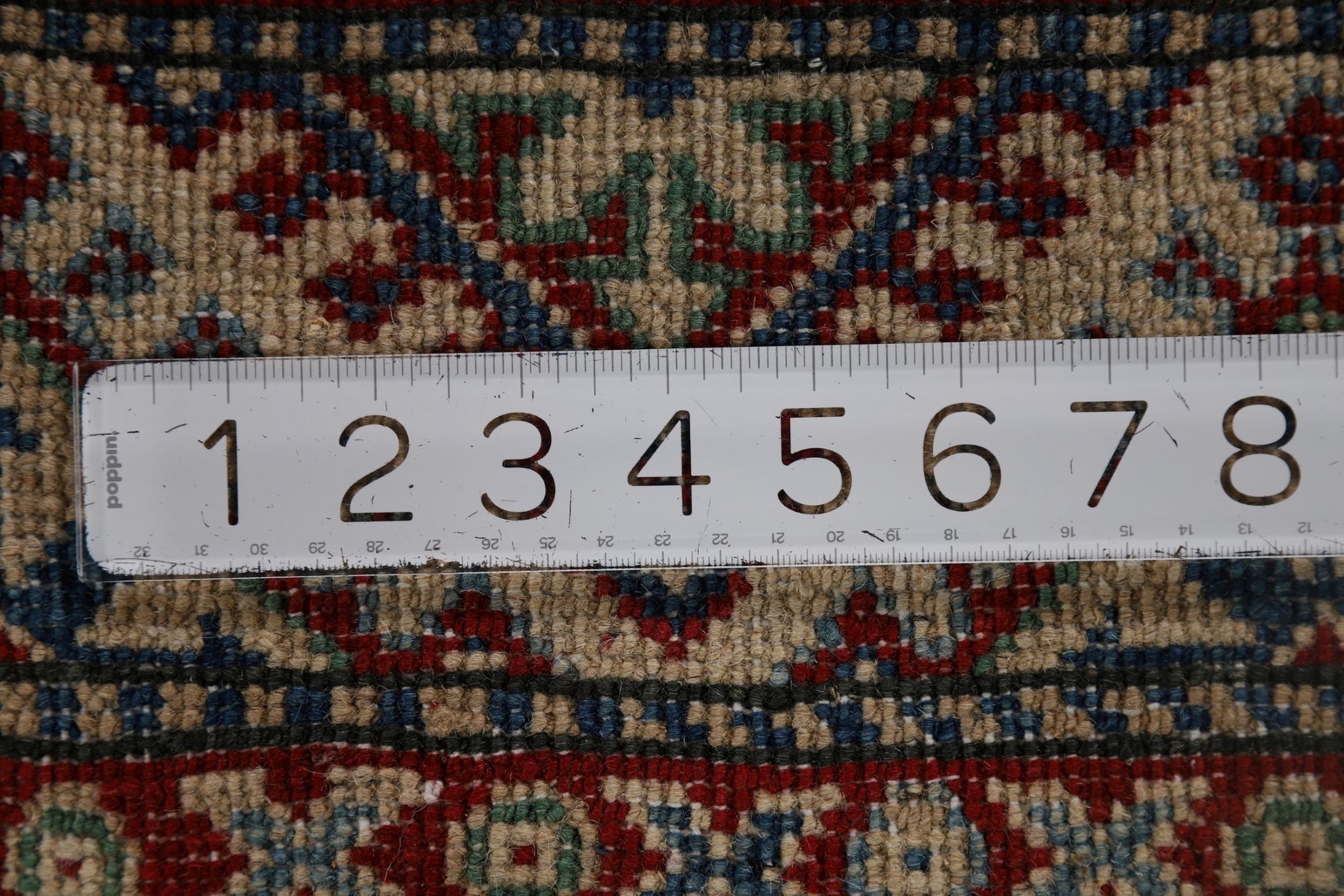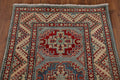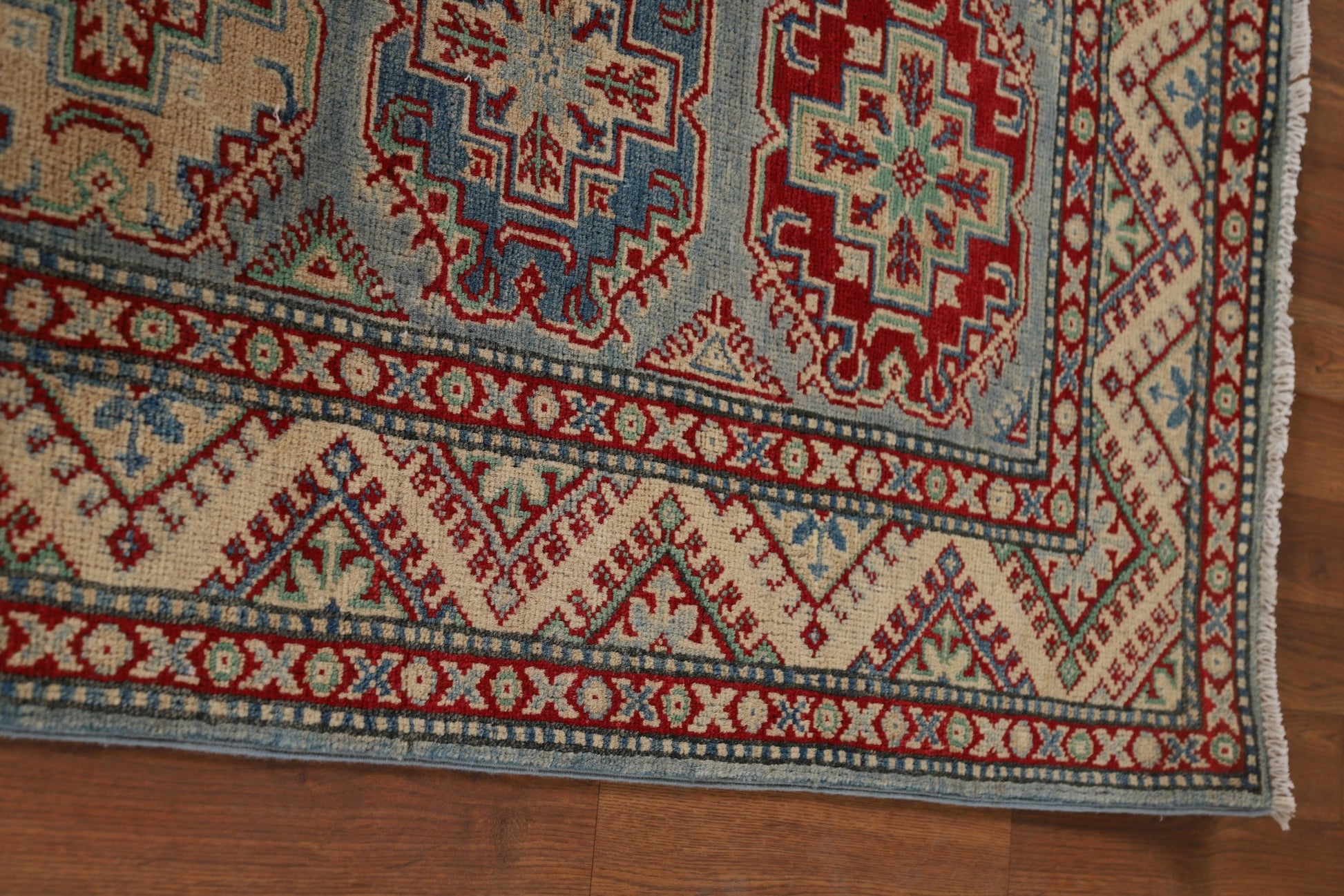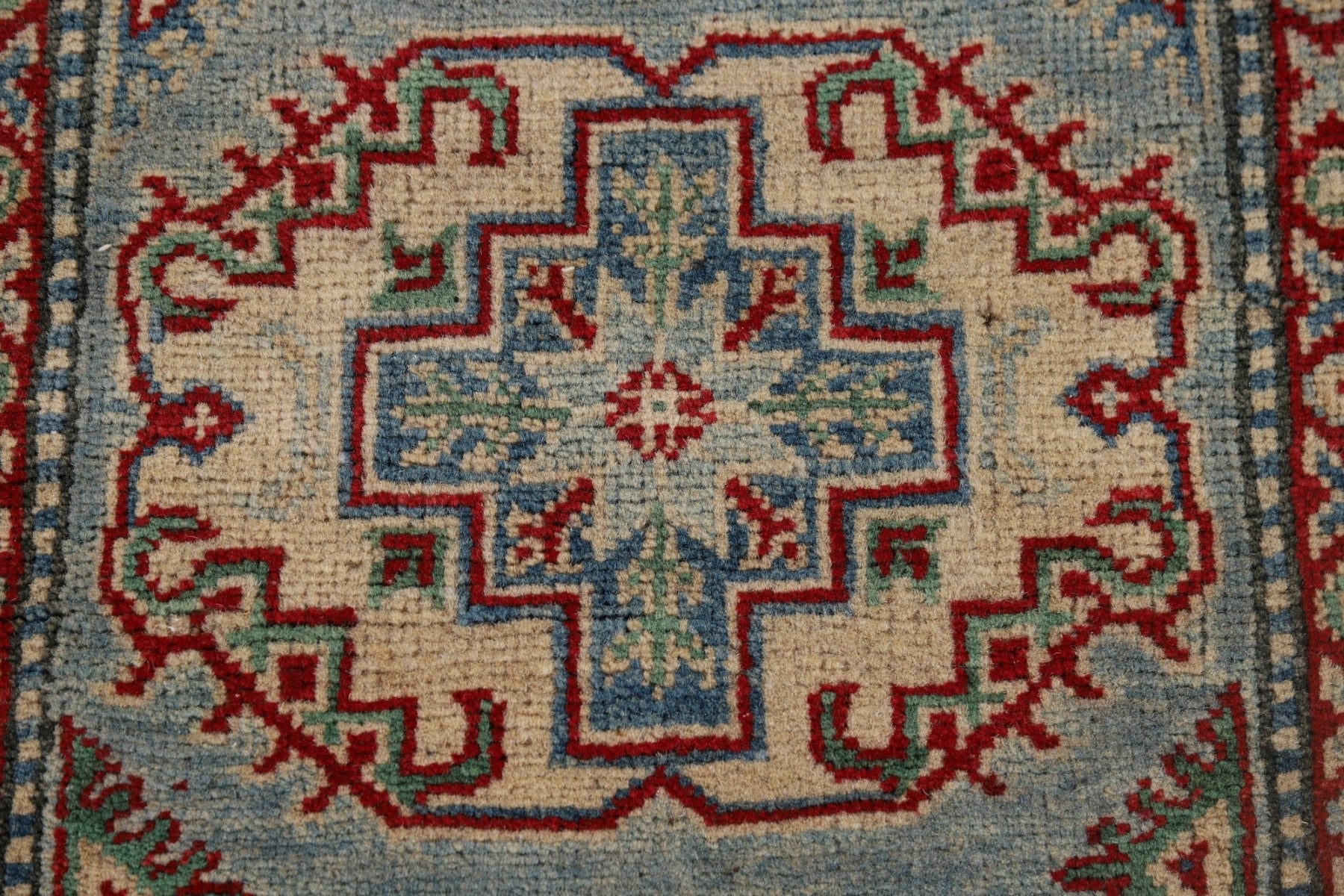 A Beautiful Genuine Pakistan Kazak rug is Hand Knotted by skillful weavers in Pakistan with 100% Wool Material. This rug is in New, First Quality condition. dimensions are 12' 3'' X 2' 9'' in foot and 373 X 84 in centimeter. the primary color is Navy Blue & Blues.