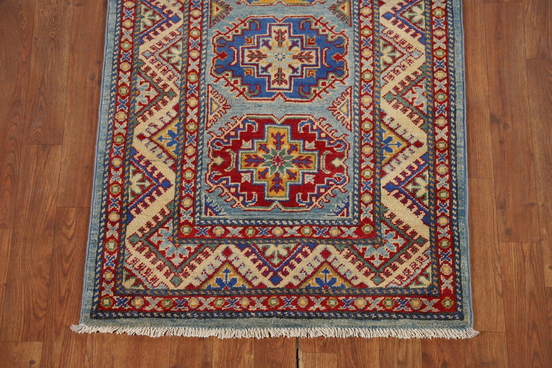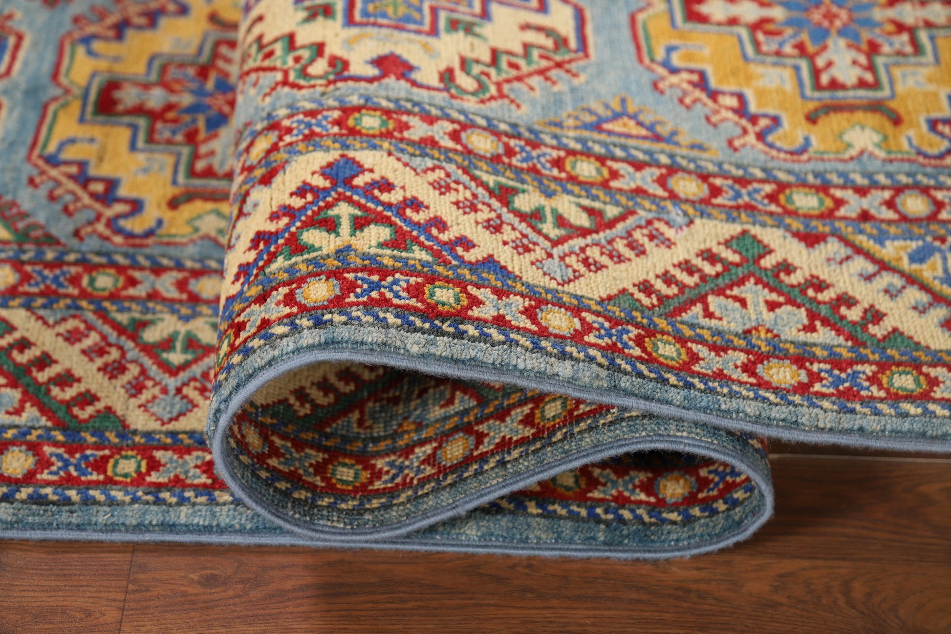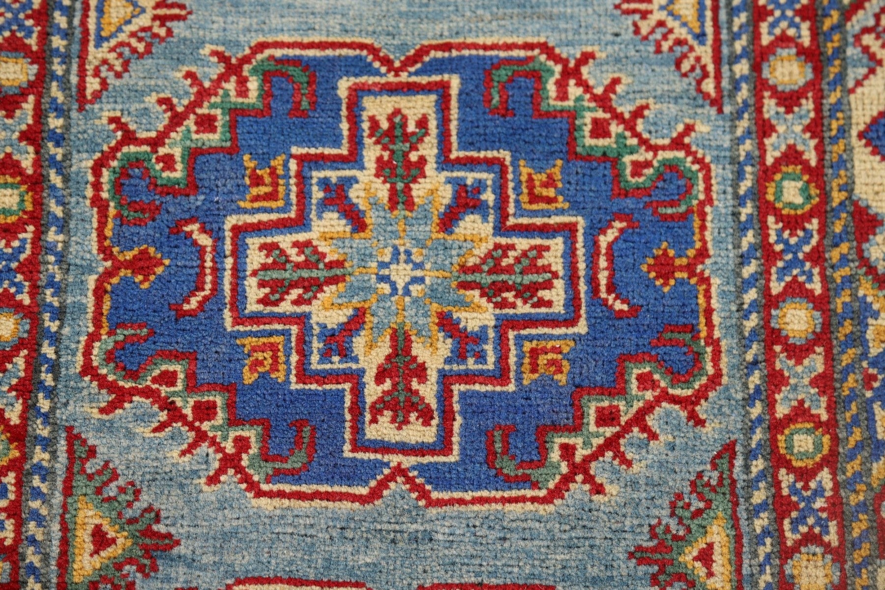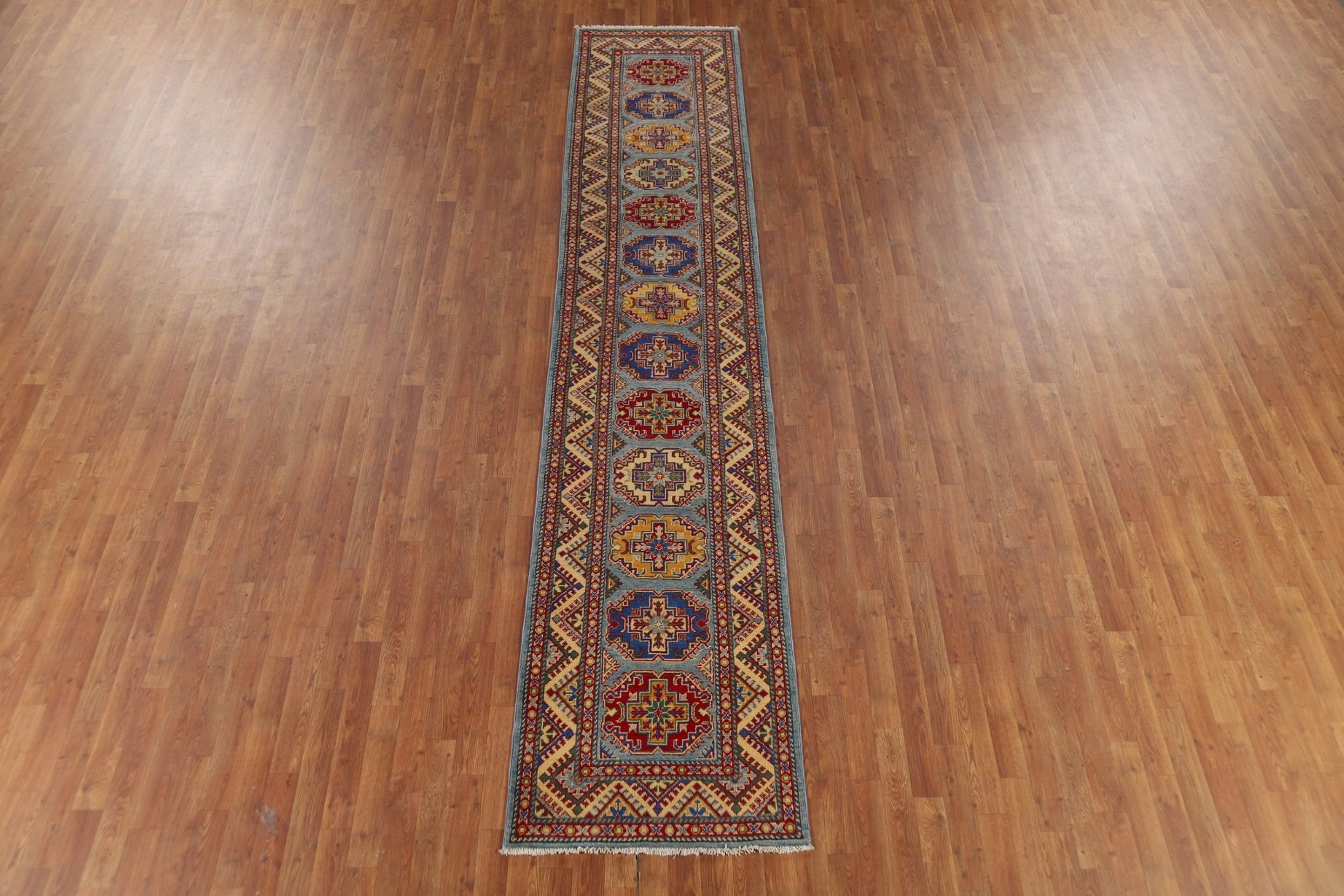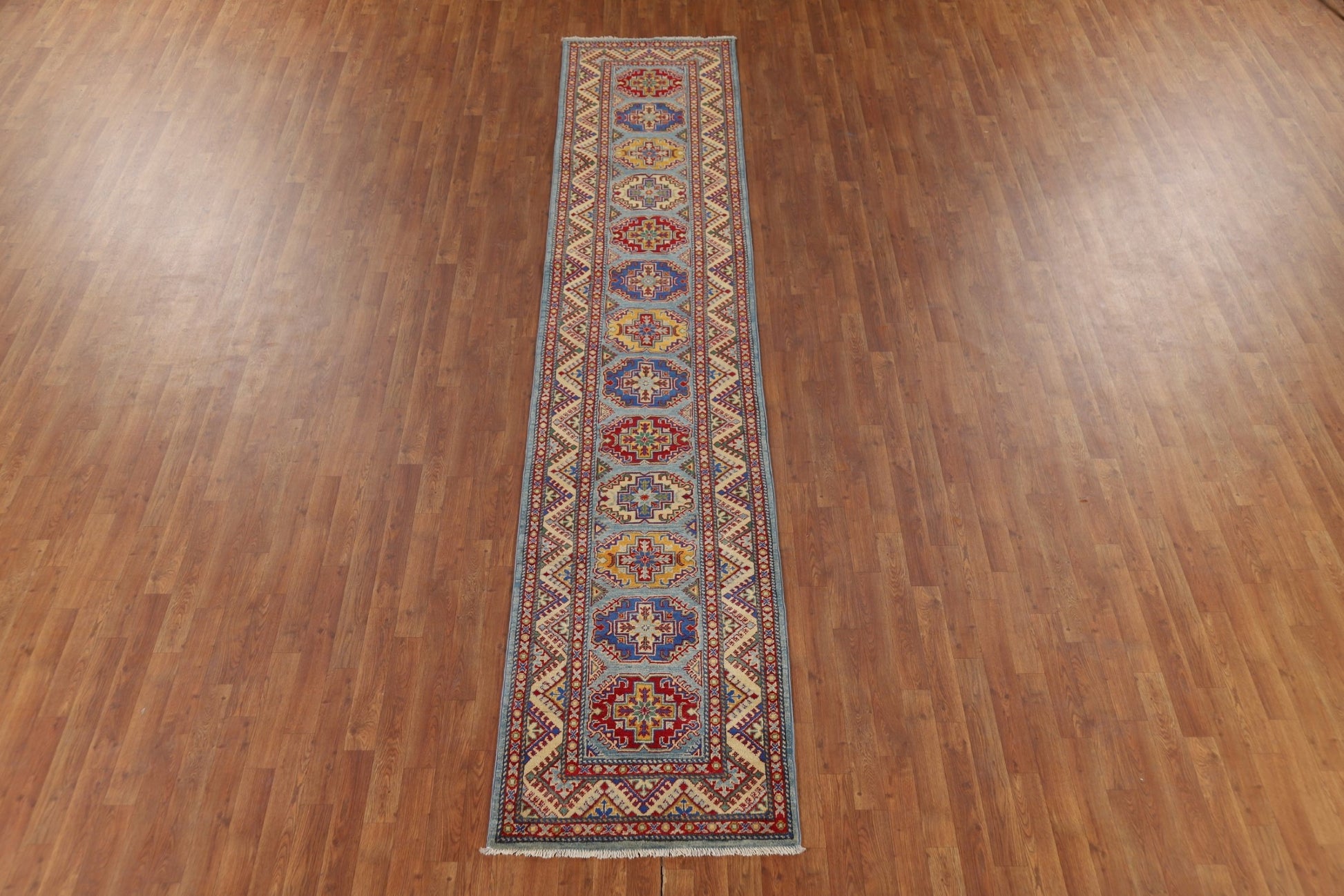 A Beautiful Genuine Pakistan Kazak rug is Hand Knotted by skillful weavers in Pakistan with 100% Wool Material. This rug is in New, First Quality condition. dimensions are 12' 9'' X 2' 7'' in foot and 389 X 79 in centimeter. the primary color is Navy Blue & Blues.