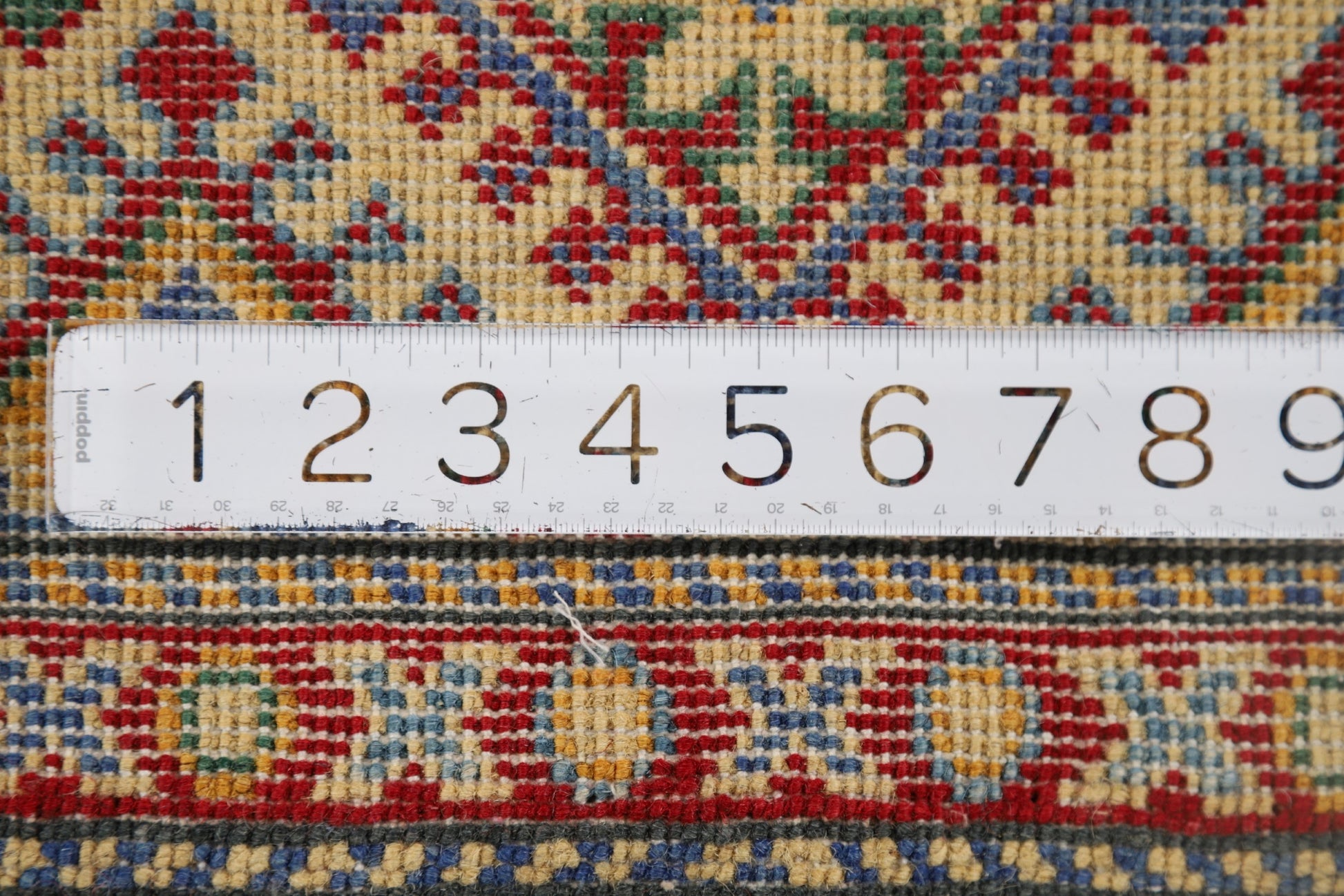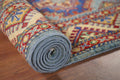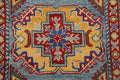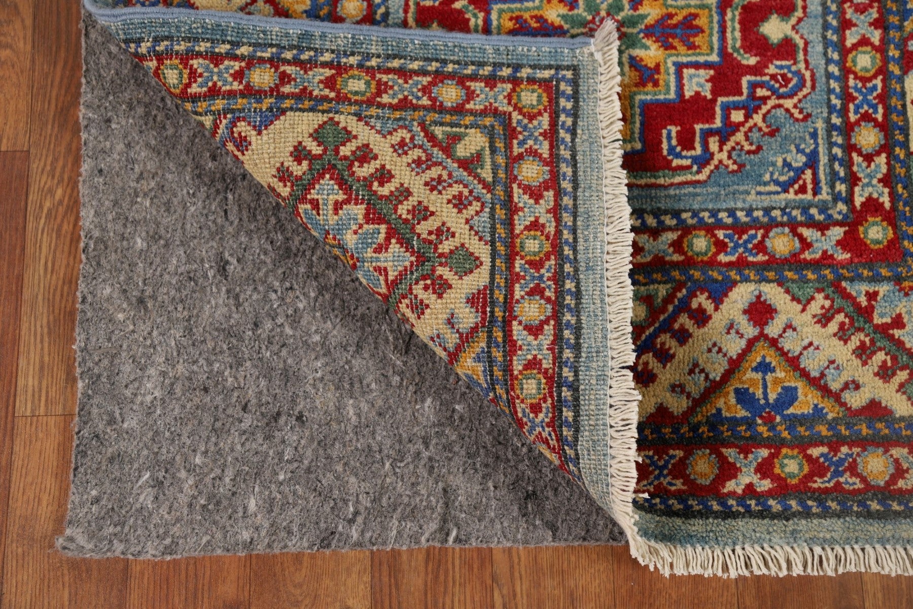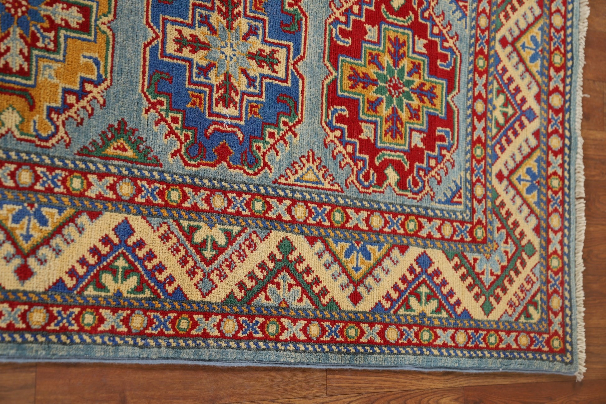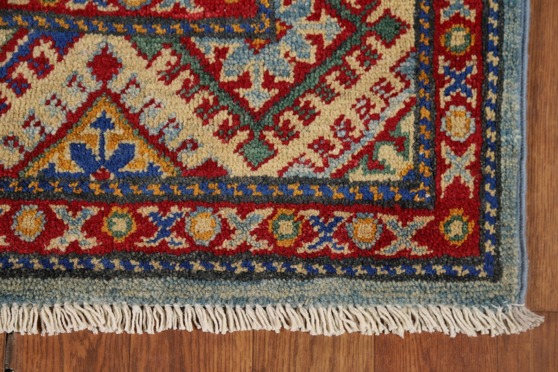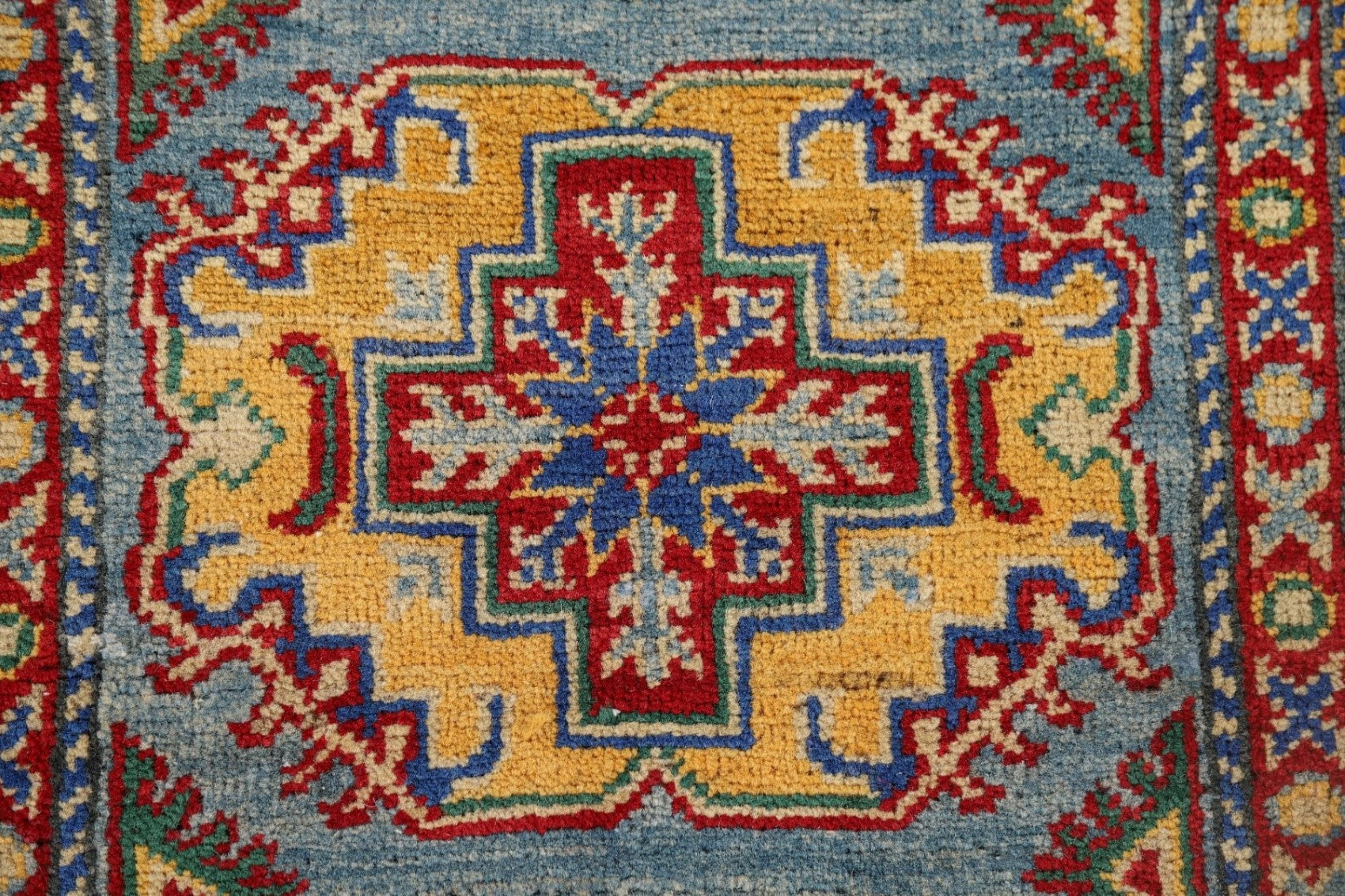 A Beautiful Genuine Pakistan Kazak rug is Hand Knotted by skillful weavers in Pakistan with 100% Wool Material. This rug is in New, First Quality condition. dimensions are 12' 9'' X 2' 7'' in foot and 389 X 79 in centimeter. the primary color is Navy Blue & Blues.