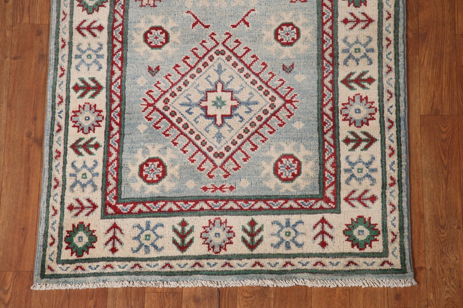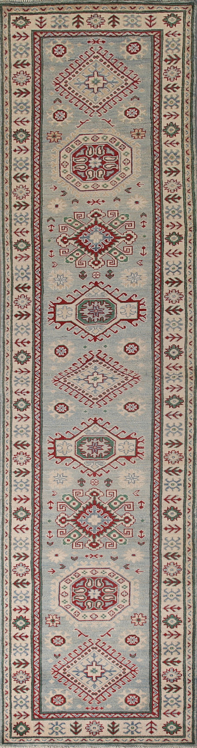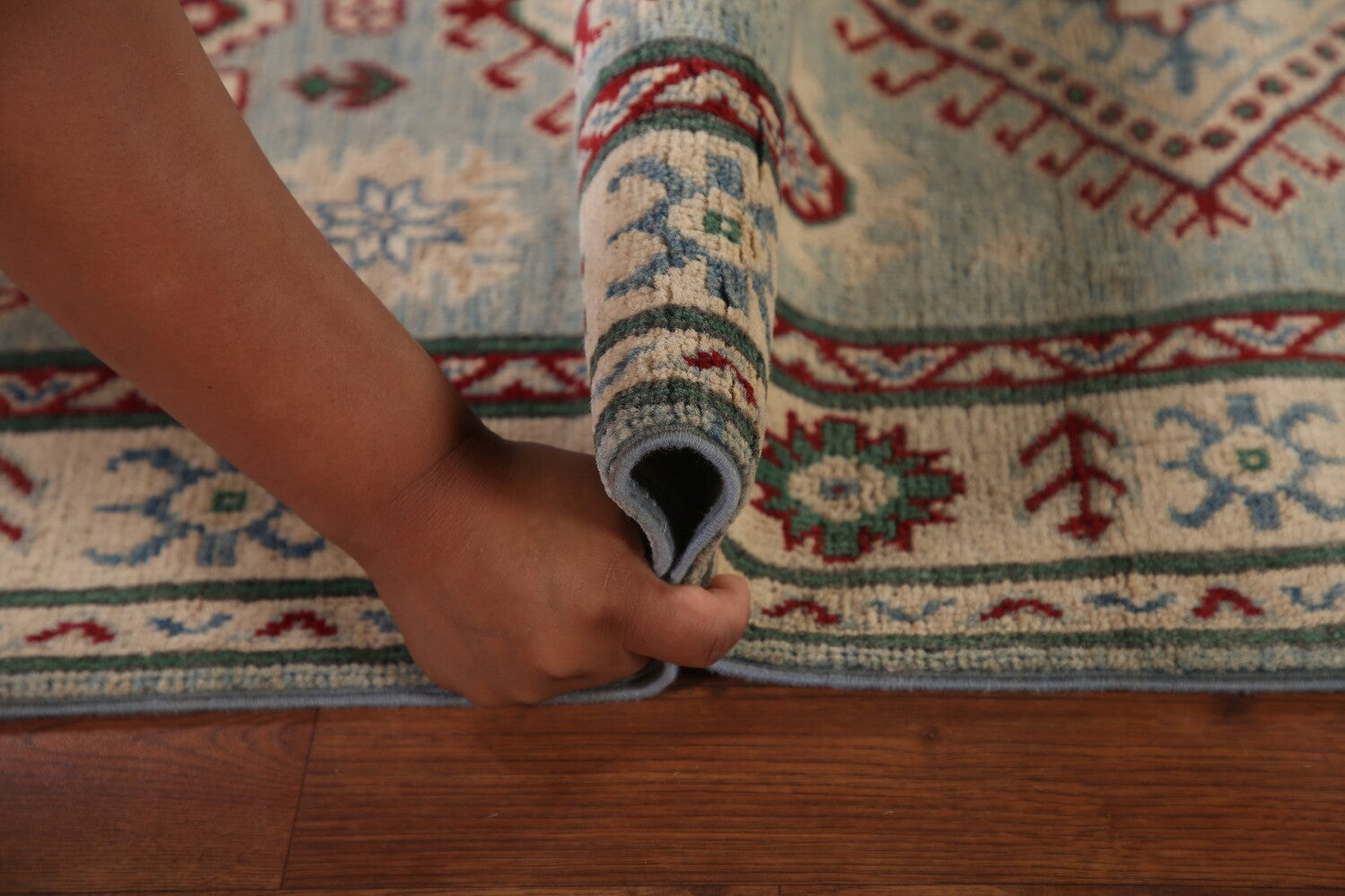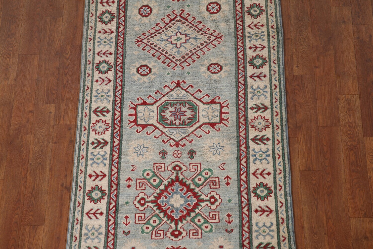 A Beautiful Genuine Pakistan Kazak rug is Hand Knotted by skillful weavers in Pakistan with 100% Wool Material. This rug is in New, First Quality condition. dimensions are 13' 4'' X 2' 8'' in foot and 406 X 81 in centimeter. the primary color is Navy Blue & Blues.