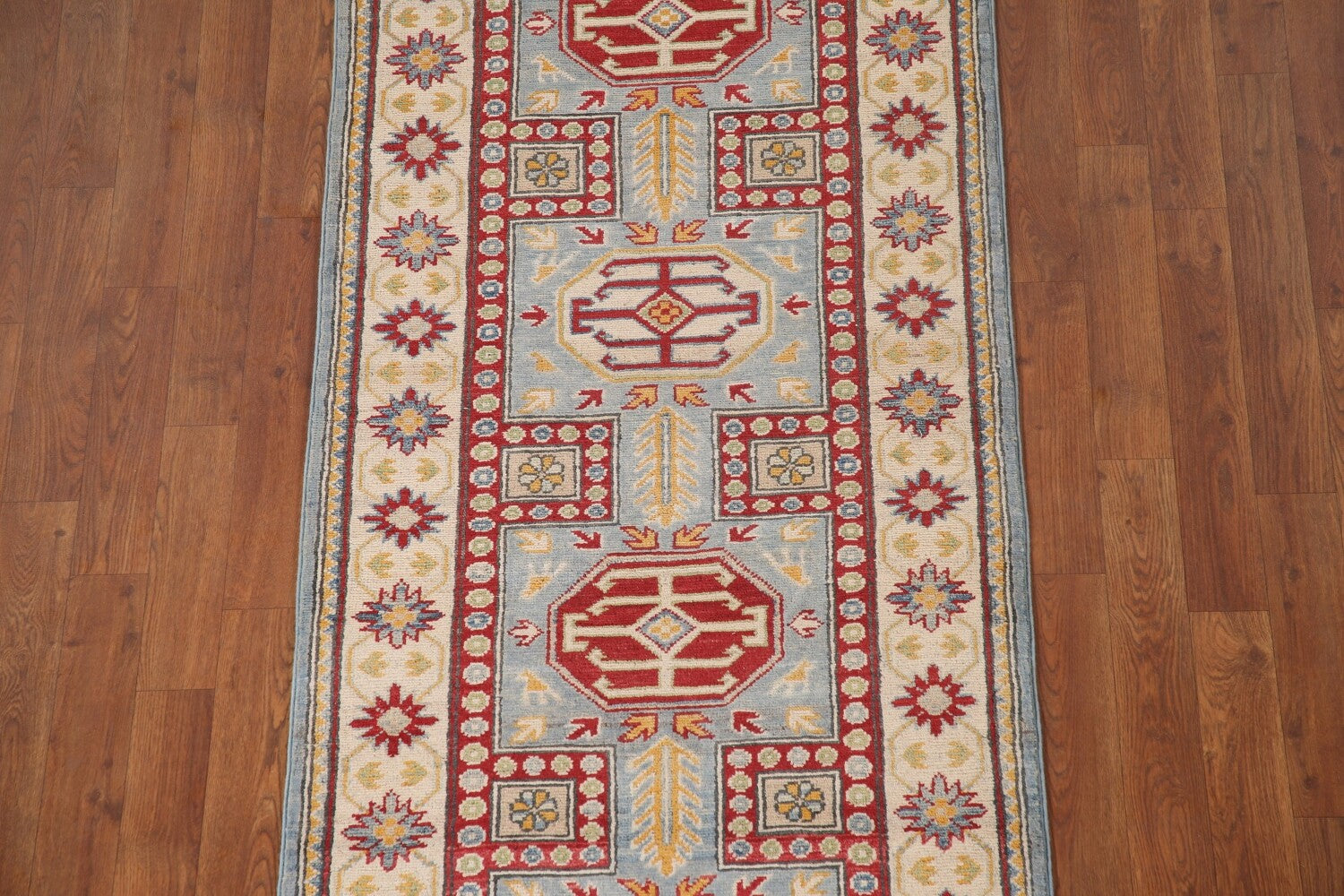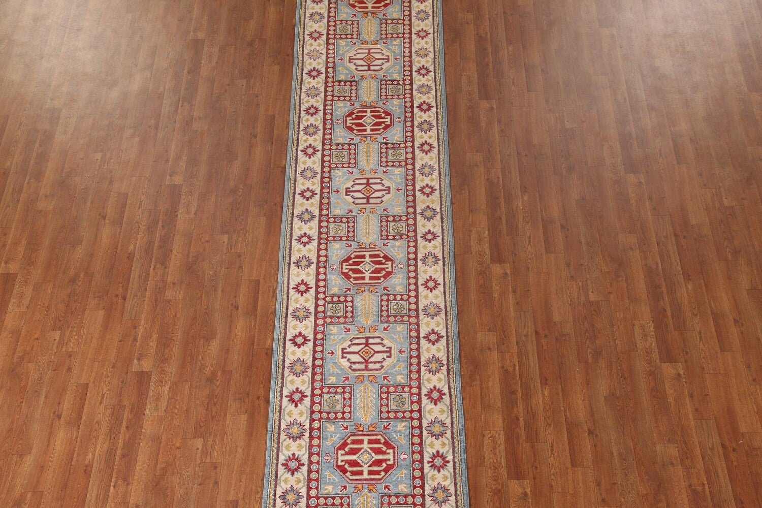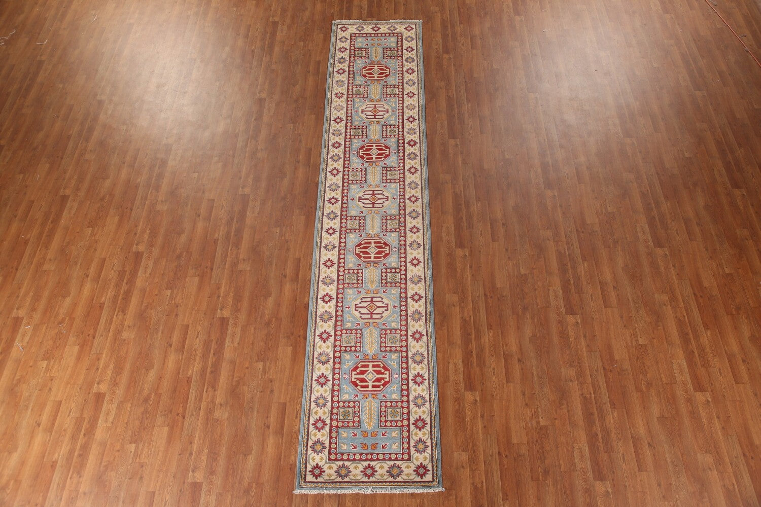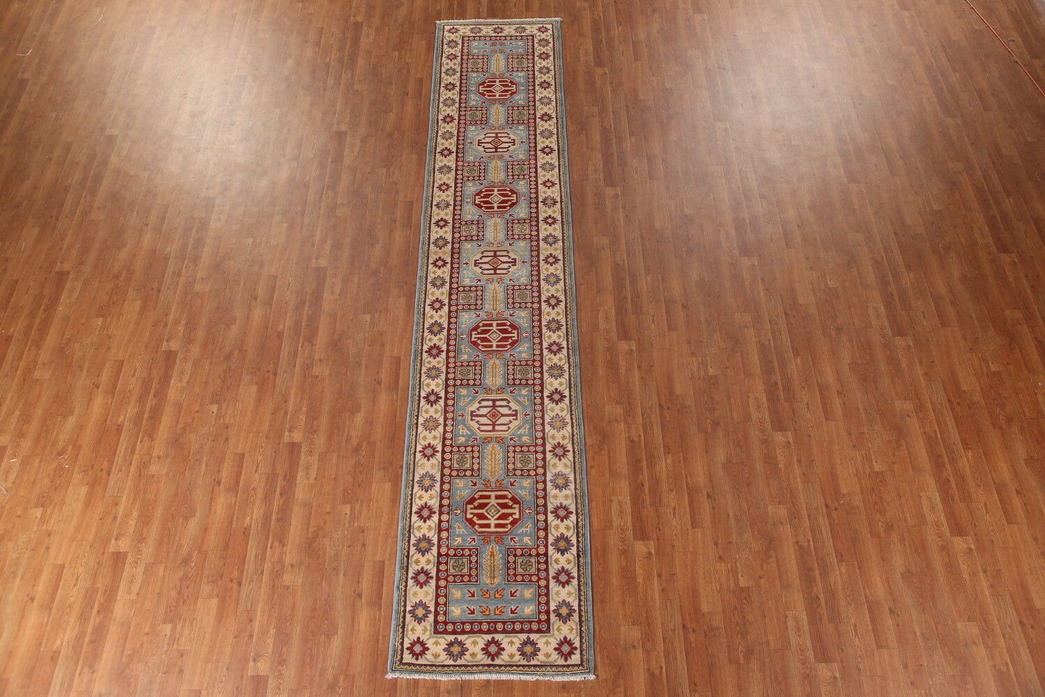 A Beautiful Genuine Pakistan Kazak rug is Hand Knotted by skillful weavers in Pakistan with 100% Wool Material. This rug is in New, First Quality condition. dimensions are 13' 0'' X 2' 7'' in foot and 396 X 79 in centimeter. the primary color is Navy Blue & Blues.