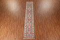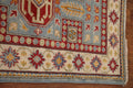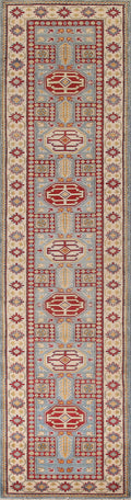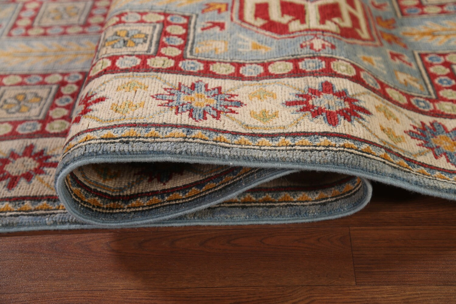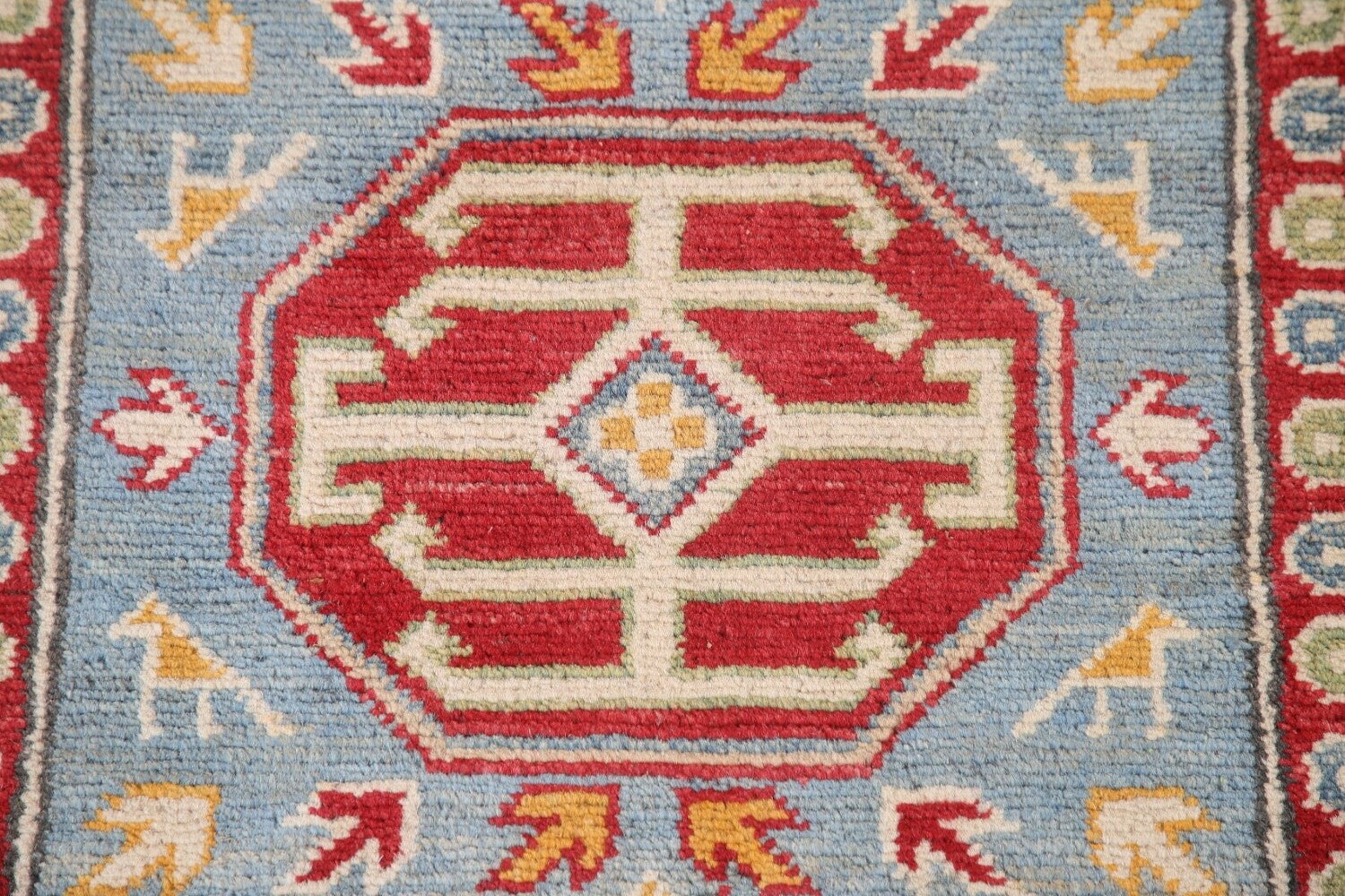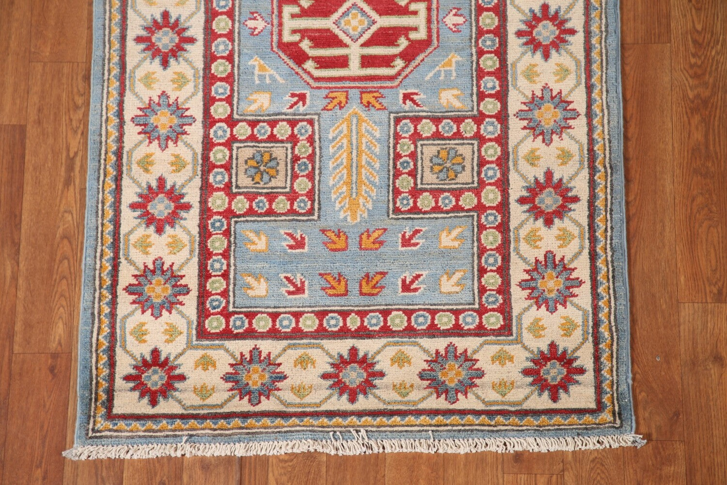 A Beautiful Genuine Pakistan Kazak rug is Hand Knotted by skillful weavers in Pakistan with 100% Wool Material. This rug is in New, First Quality condition. dimensions are 13' 0'' X 2' 7'' in foot and 396 X 79 in centimeter. the primary color is Navy Blue & Blues.