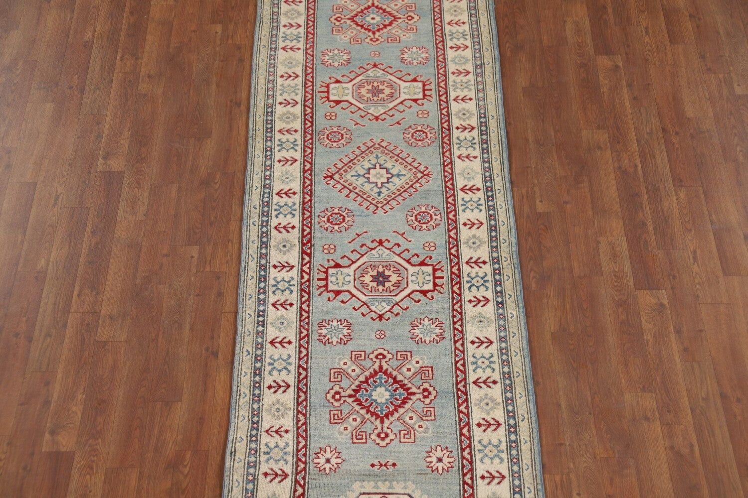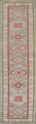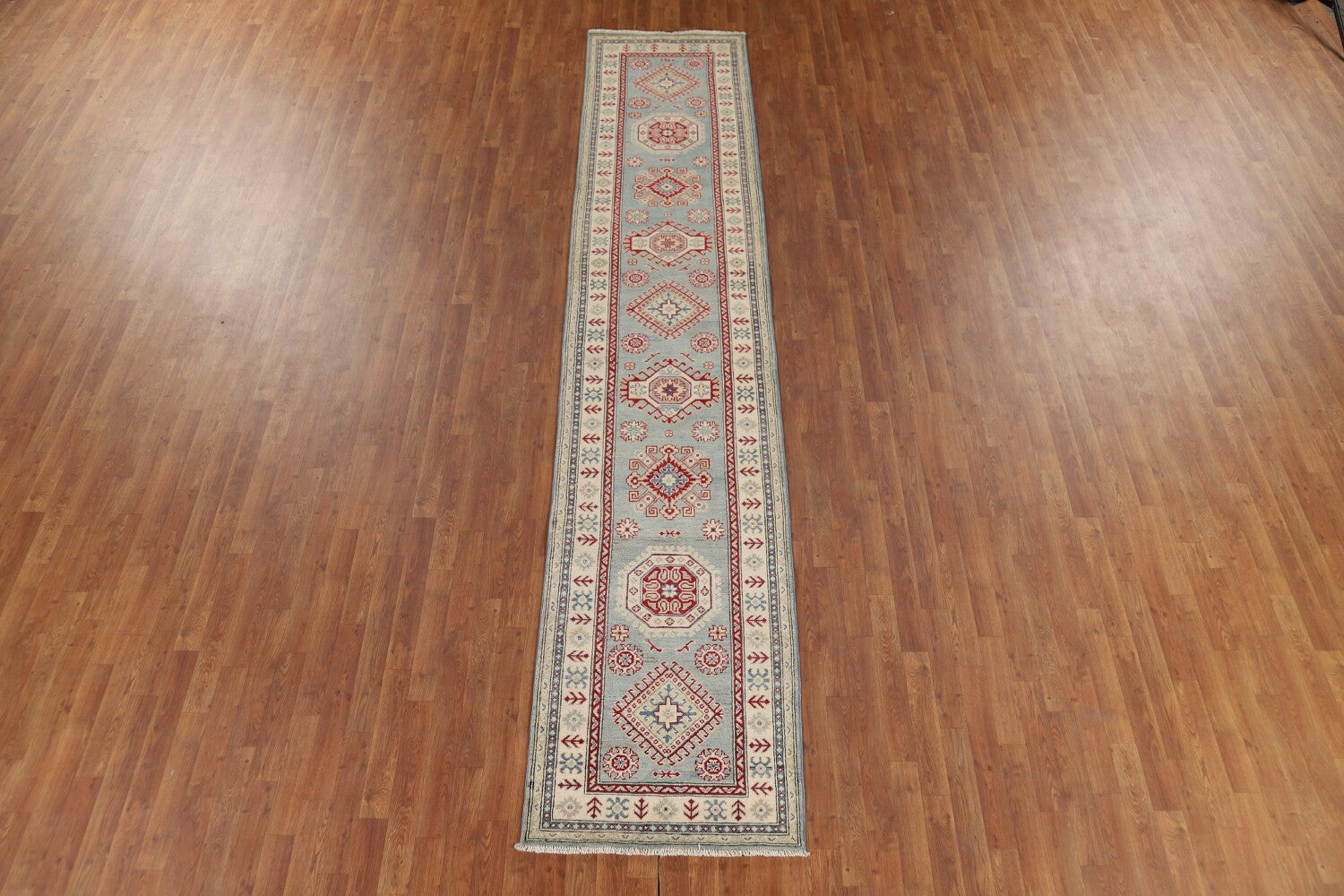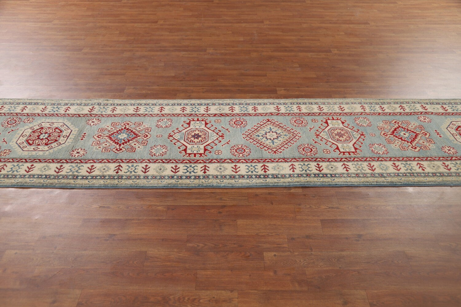 A Beautiful Genuine Pakistan Kazak rug is Hand Knotted by skillful weavers in Pakistan with 100% Wool Material. This rug is in New, First Quality condition. dimensions are 13' 1'' X 2' 7'' in foot and 399 X 79 in centimeter. the primary color is Navy Blue & Blues.