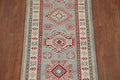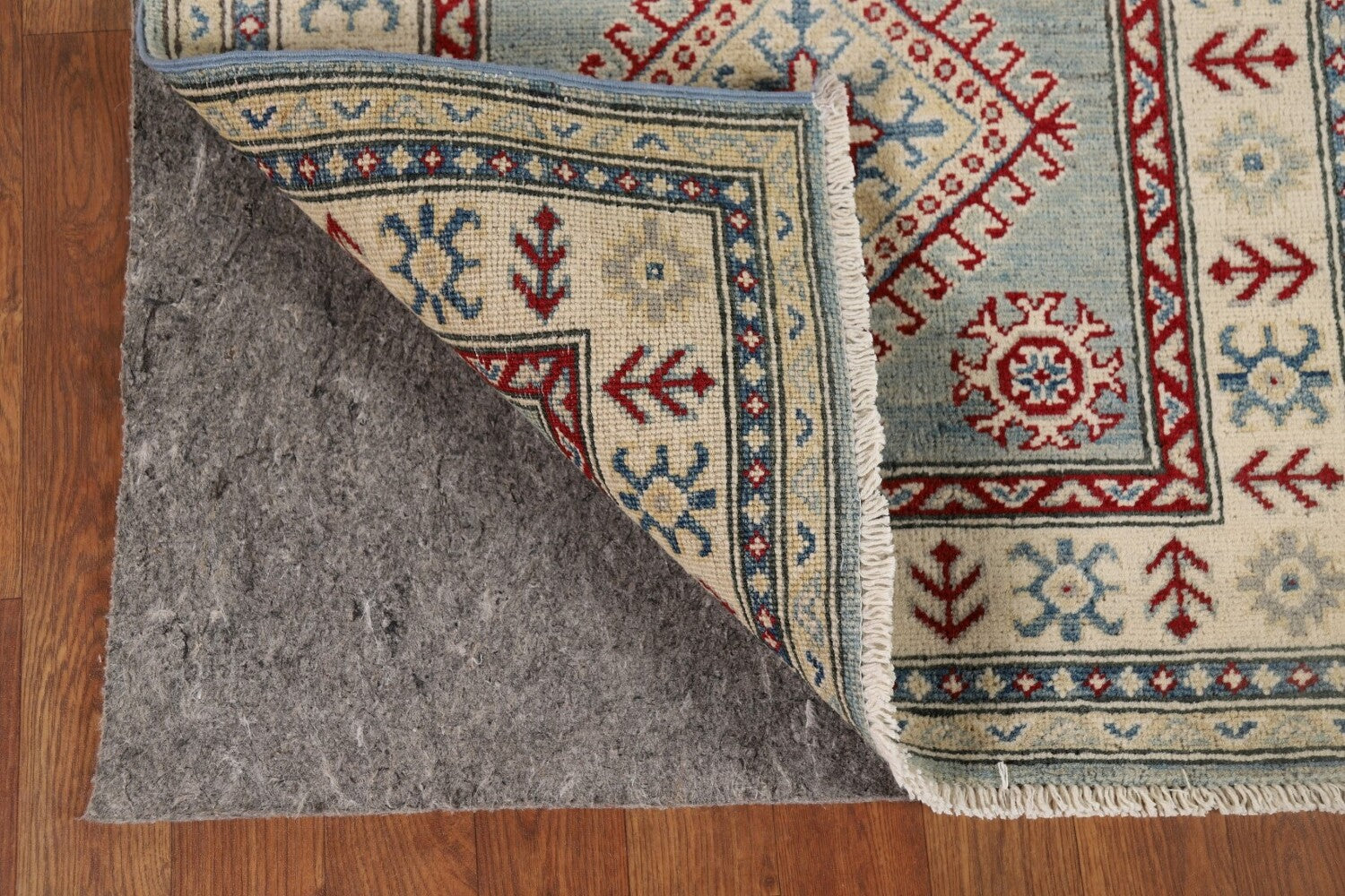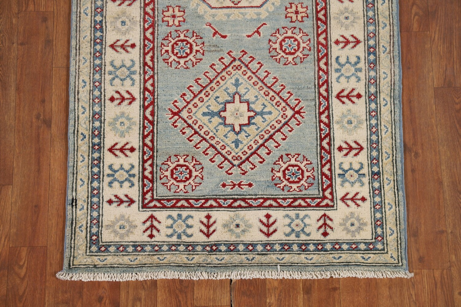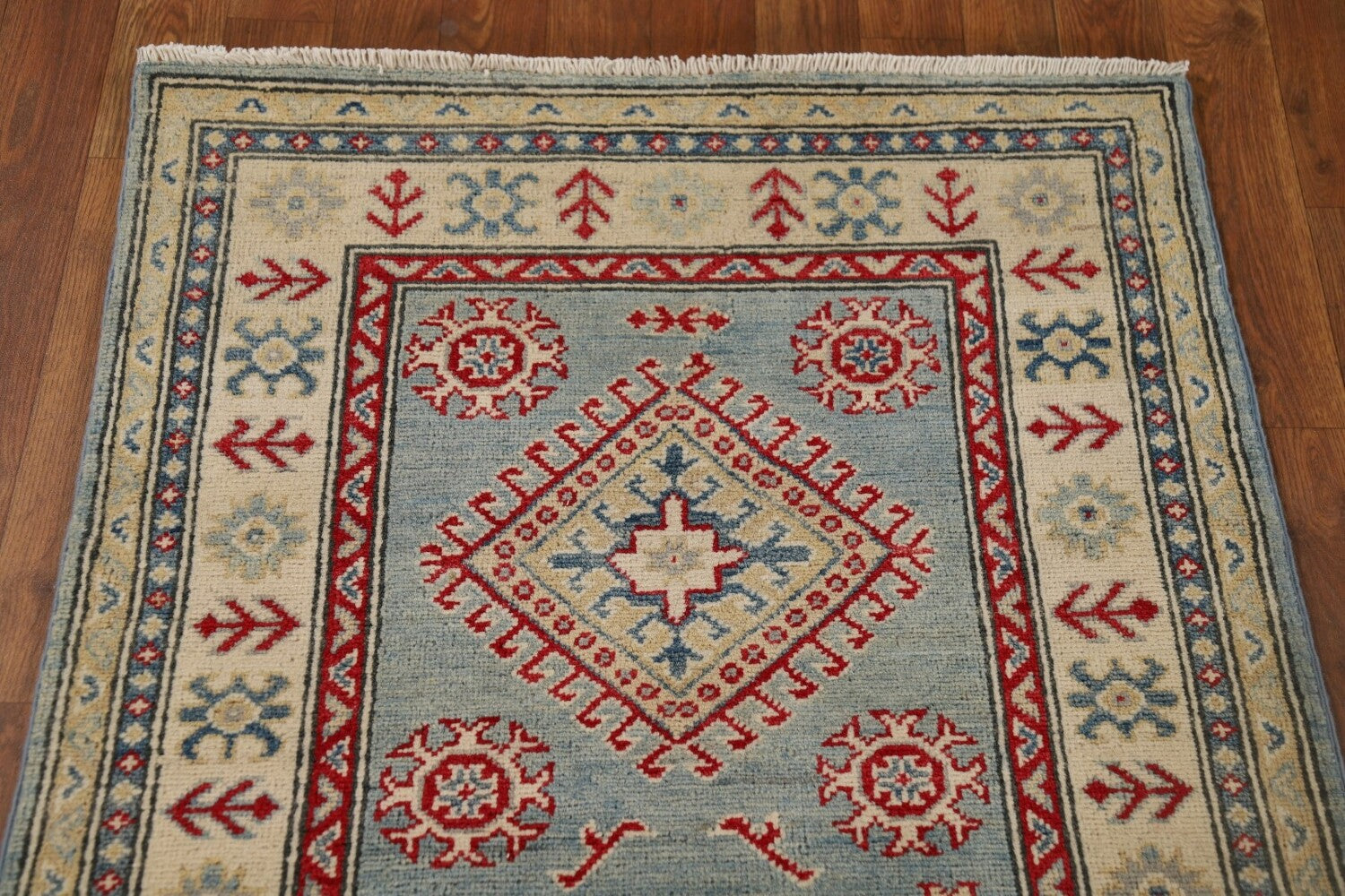 A Beautiful Genuine Pakistan Kazak rug is Hand Knotted by skillful weavers in Pakistan with 100% Wool Material. This rug is in New, First Quality condition. dimensions are 13' 1'' X 2' 7'' in foot and 399 X 79 in centimeter. the primary color is Navy Blue & Blues.