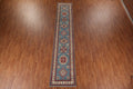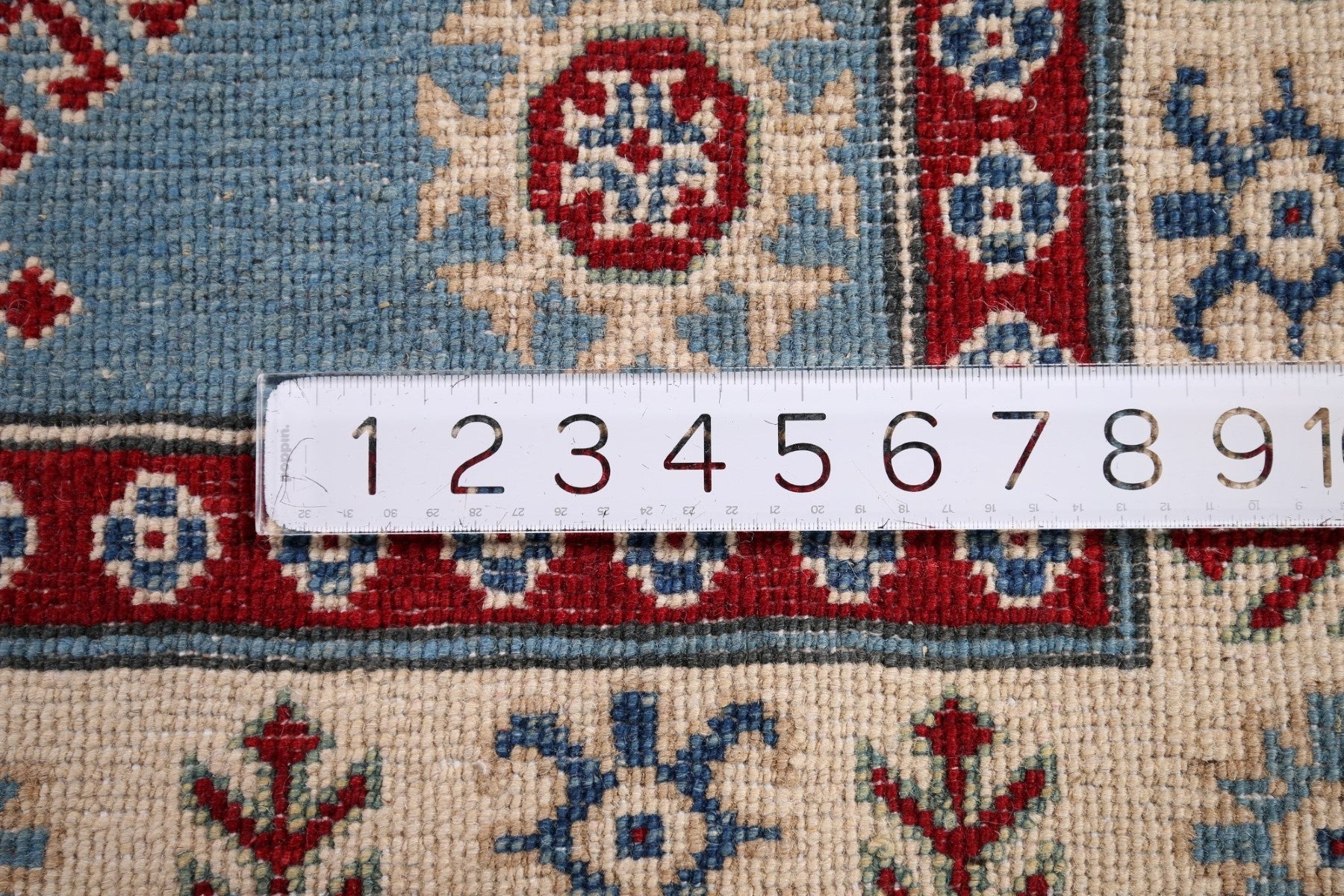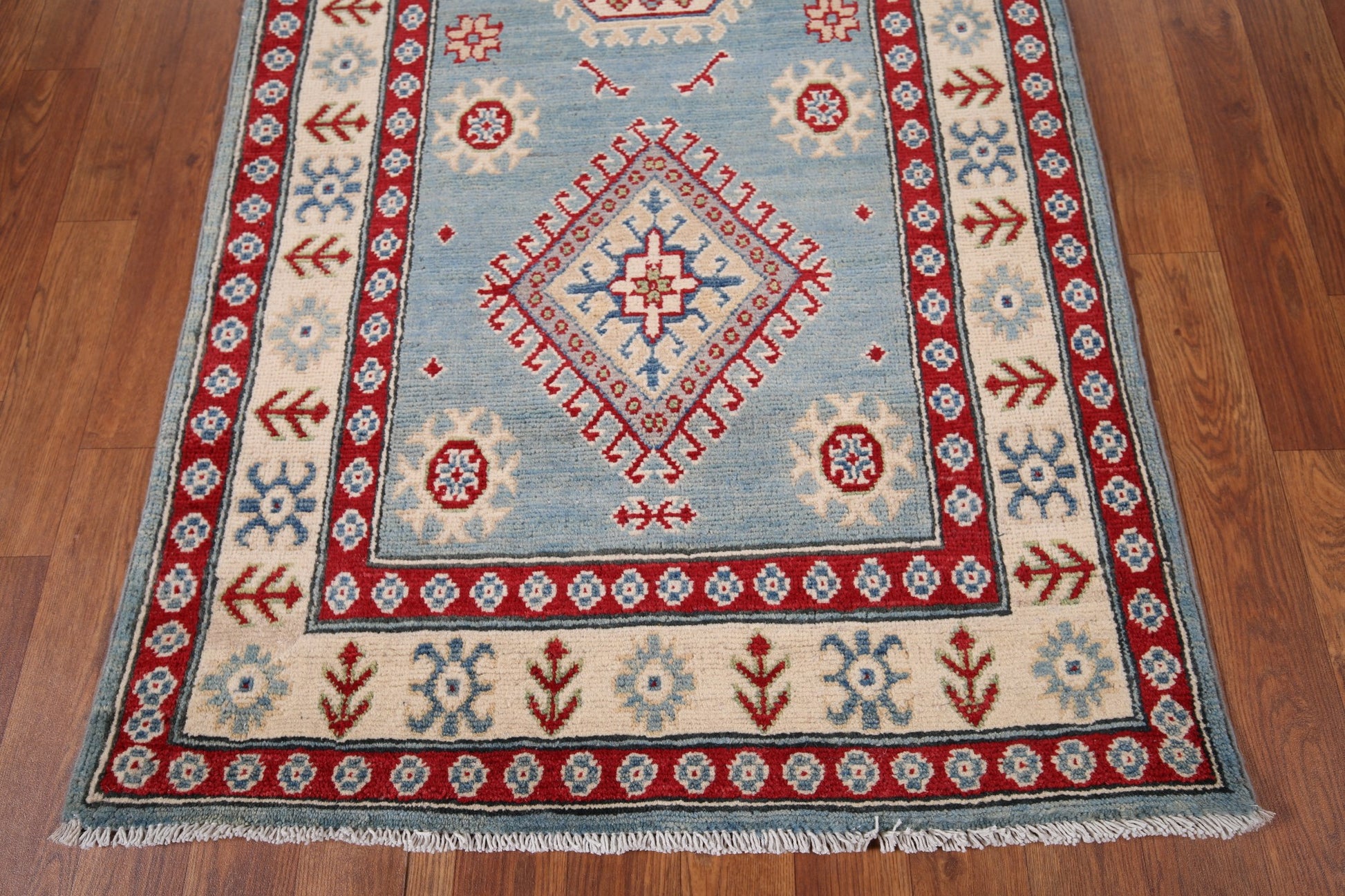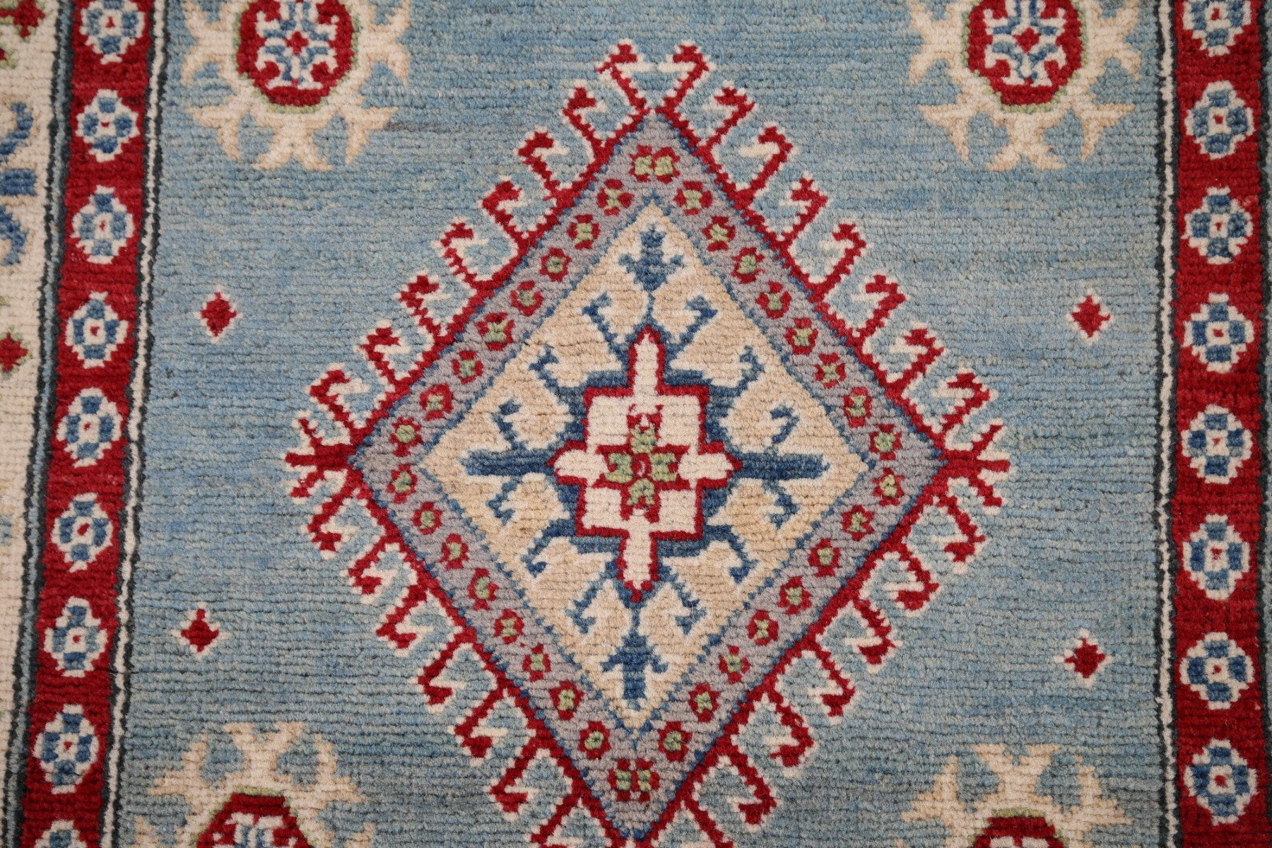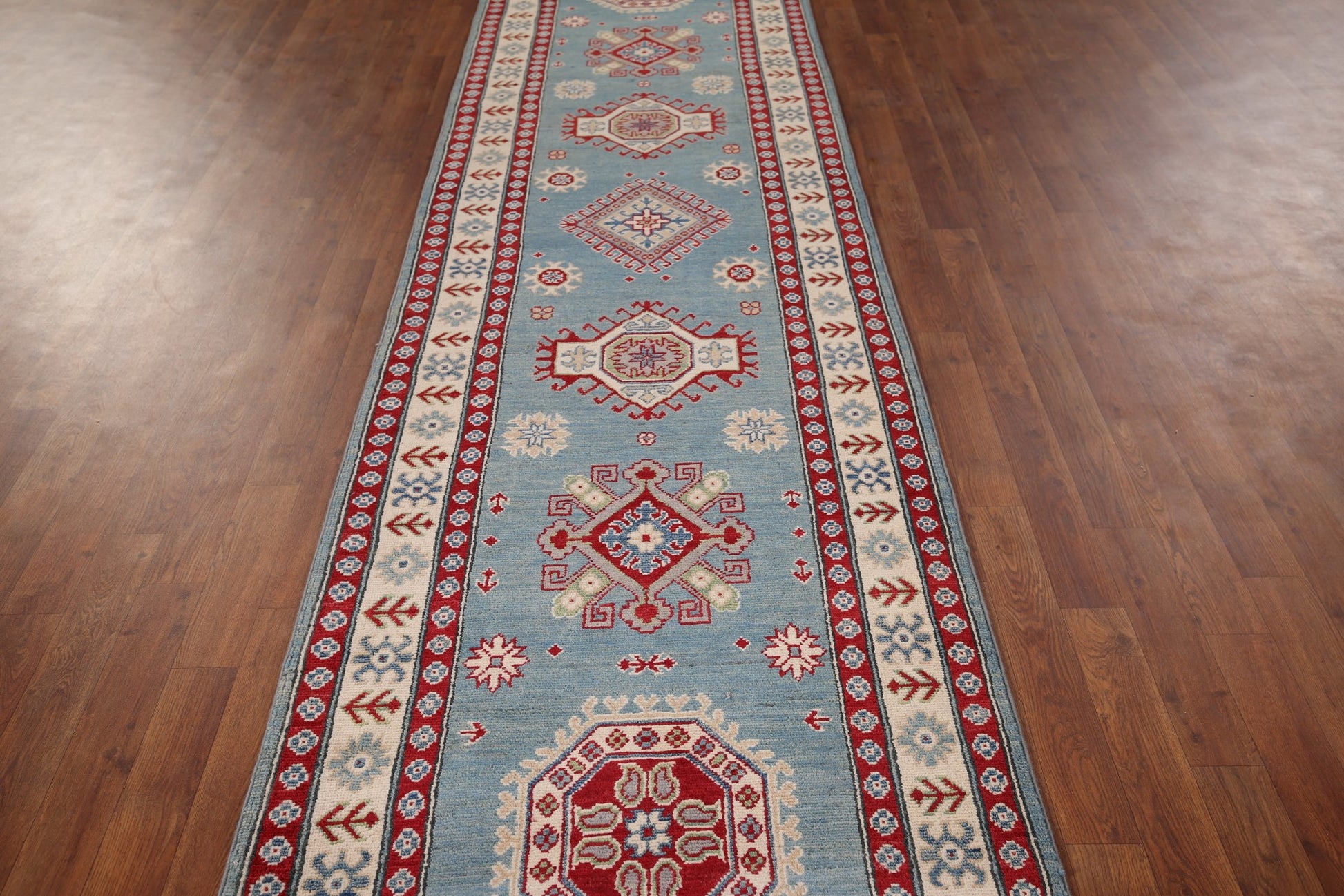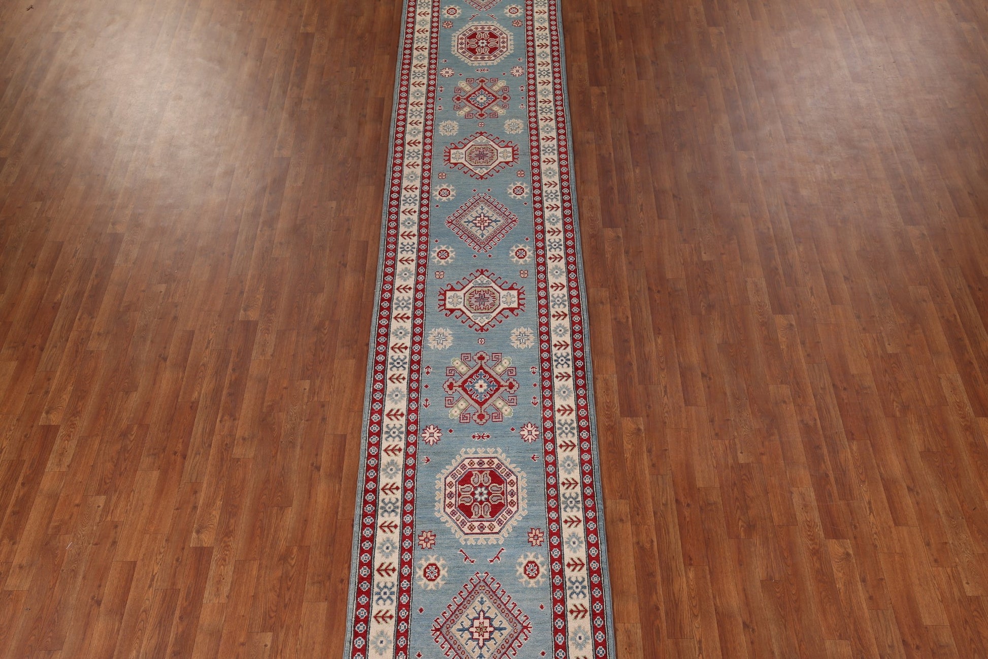 A Beautiful Genuine Pakistan Kazak rug is Hand Knotted by skillful weavers in Pakistan with 100% Wool Material. This rug is in New, First Quality condition. dimensions are 15' 0'' X 2' 10'' in foot and 457 X 86 in centimeter. the primary color is Navy Blue & Blues.