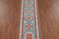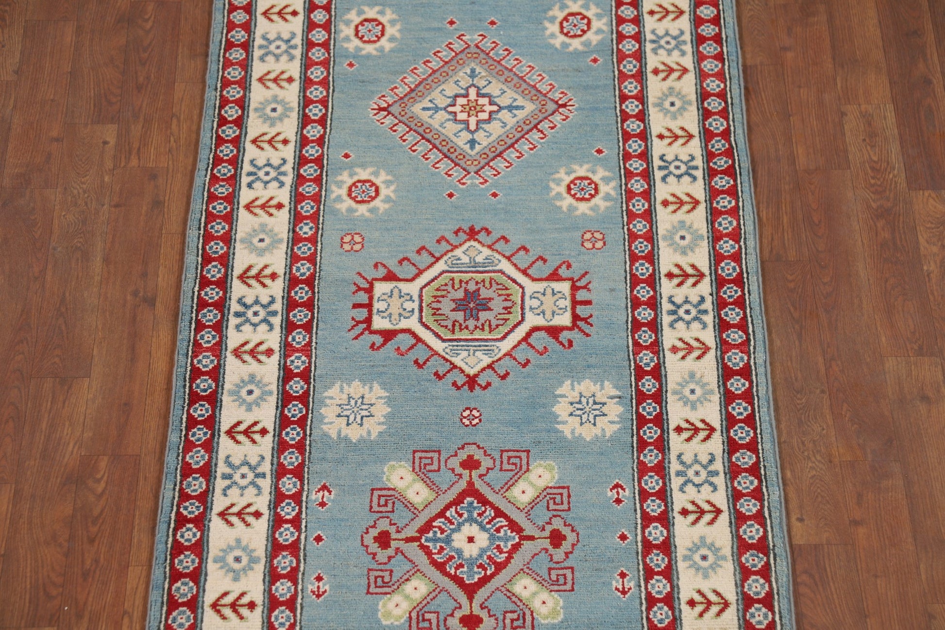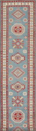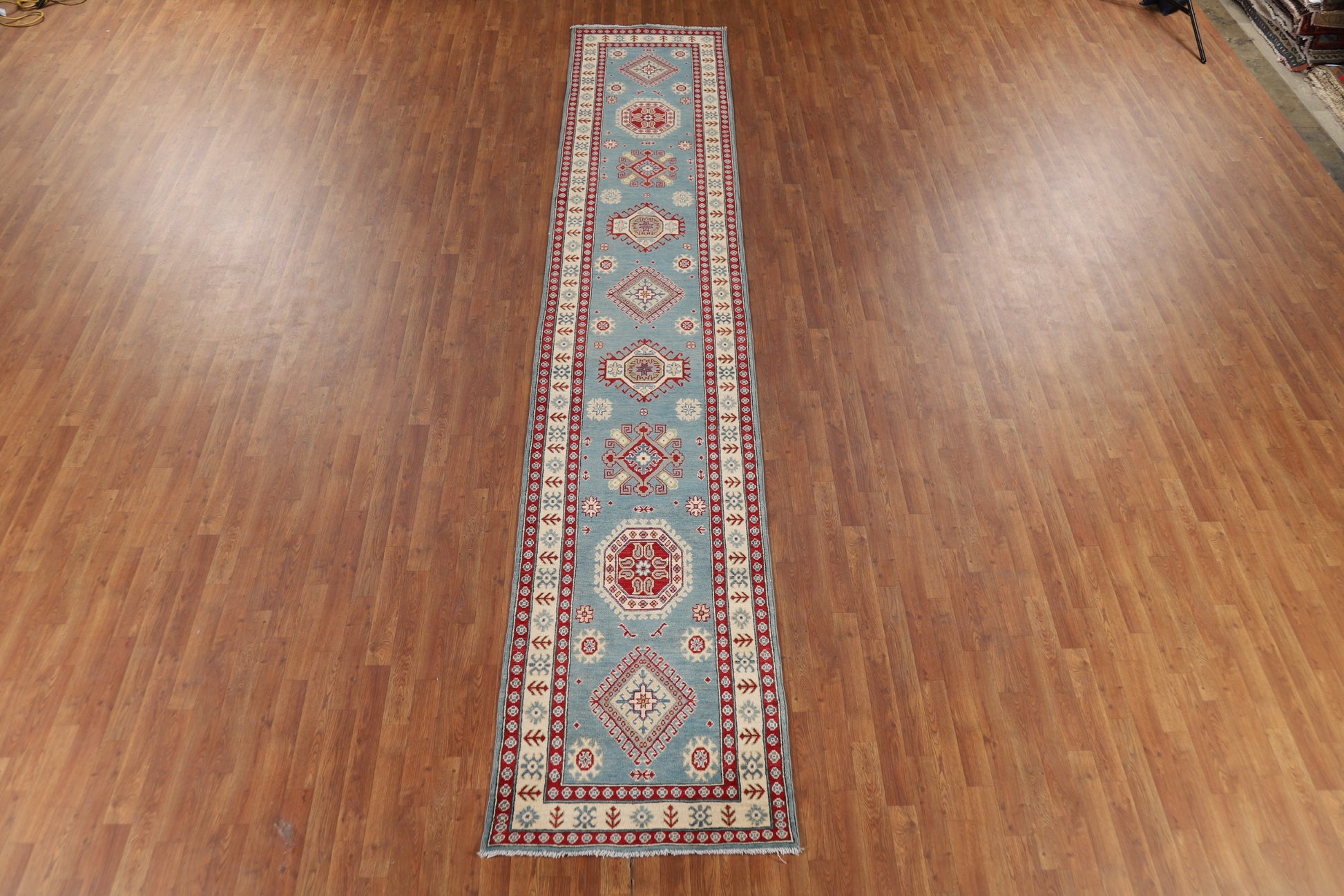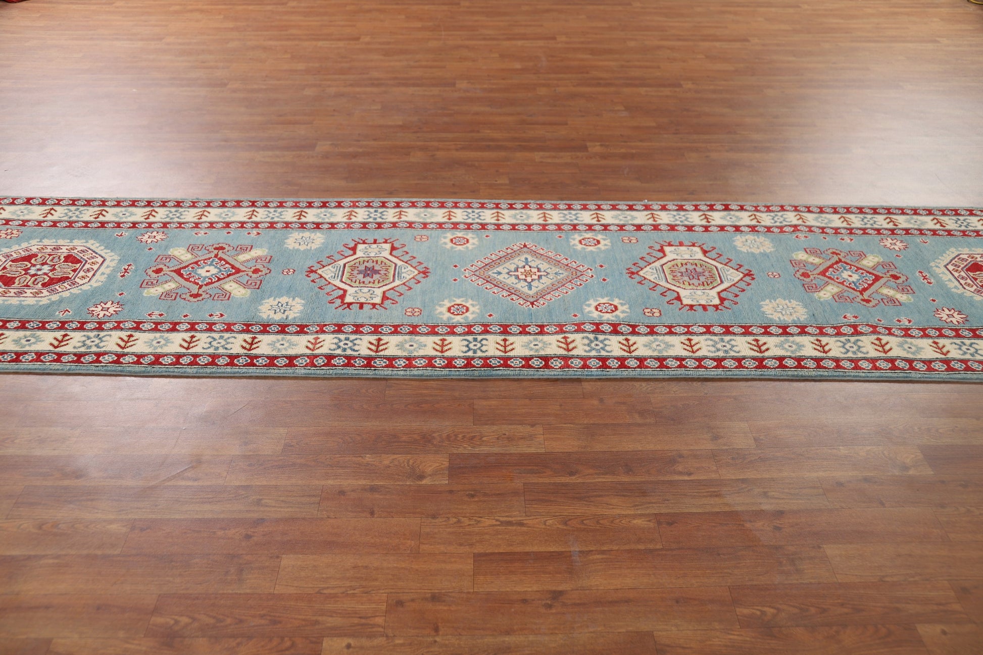 A Beautiful Genuine Pakistan Kazak rug is Hand Knotted by skillful weavers in Pakistan with 100% Wool Material. This rug is in New, First Quality condition. dimensions are 15' 2'' X 2' 10'' in foot and 462 X 86 in centimeter. the primary color is Navy Blue & Blues.