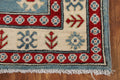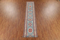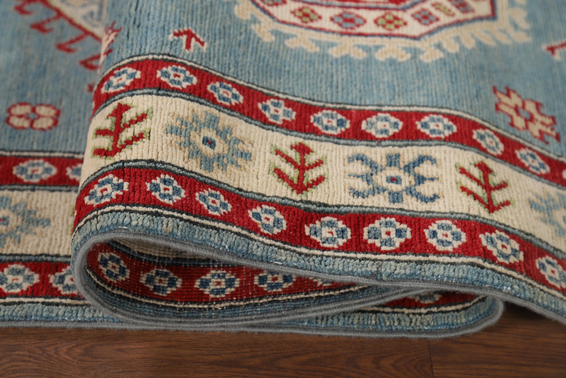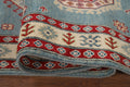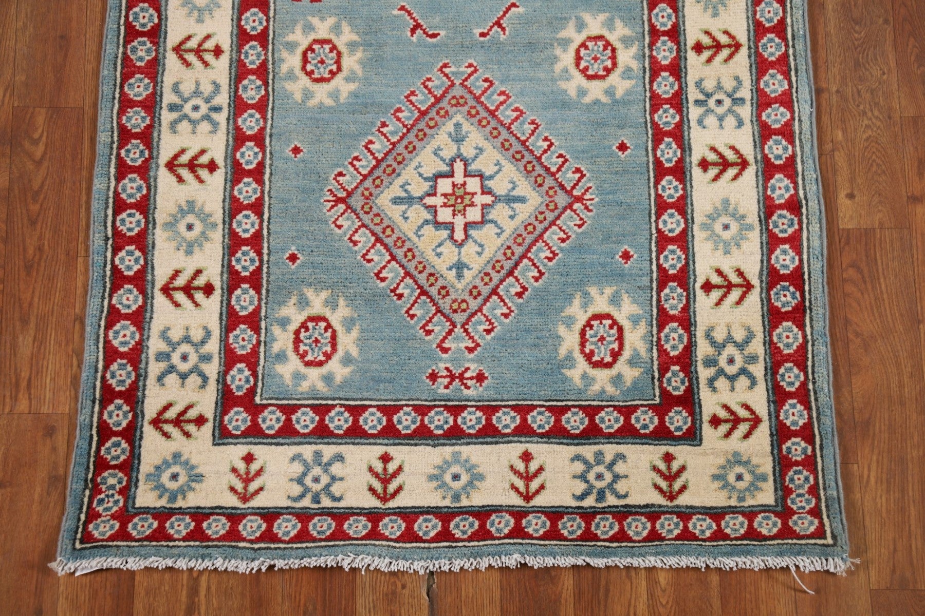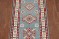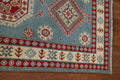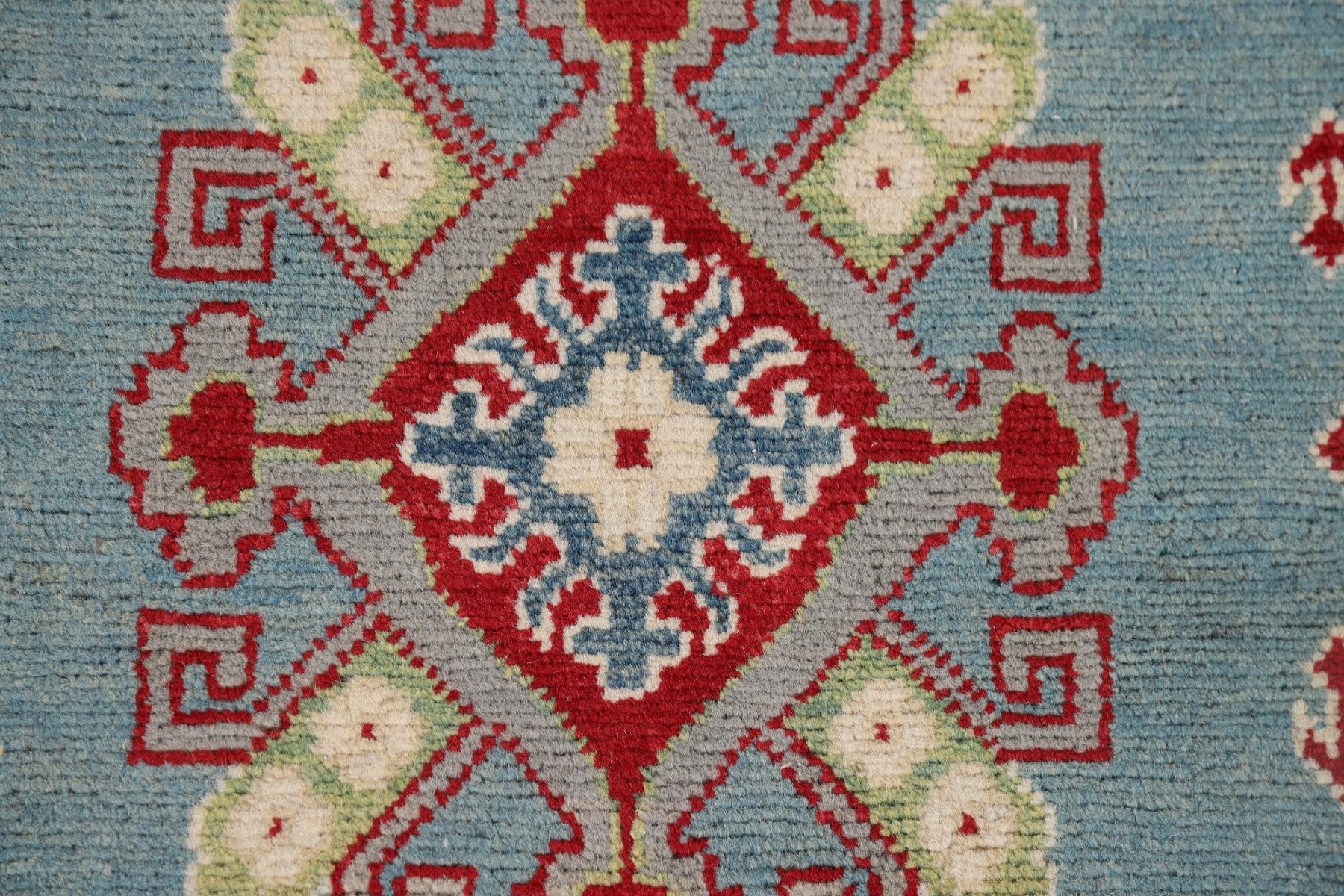 A Beautiful Genuine Pakistan Kazak rug is Hand Knotted by skillful weavers in Pakistan with 100% Wool Material. This rug is in New, First Quality condition. dimensions are 15' 2'' X 2' 10'' in foot and 462 X 86 in centimeter. the primary color is Navy Blue & Blues.