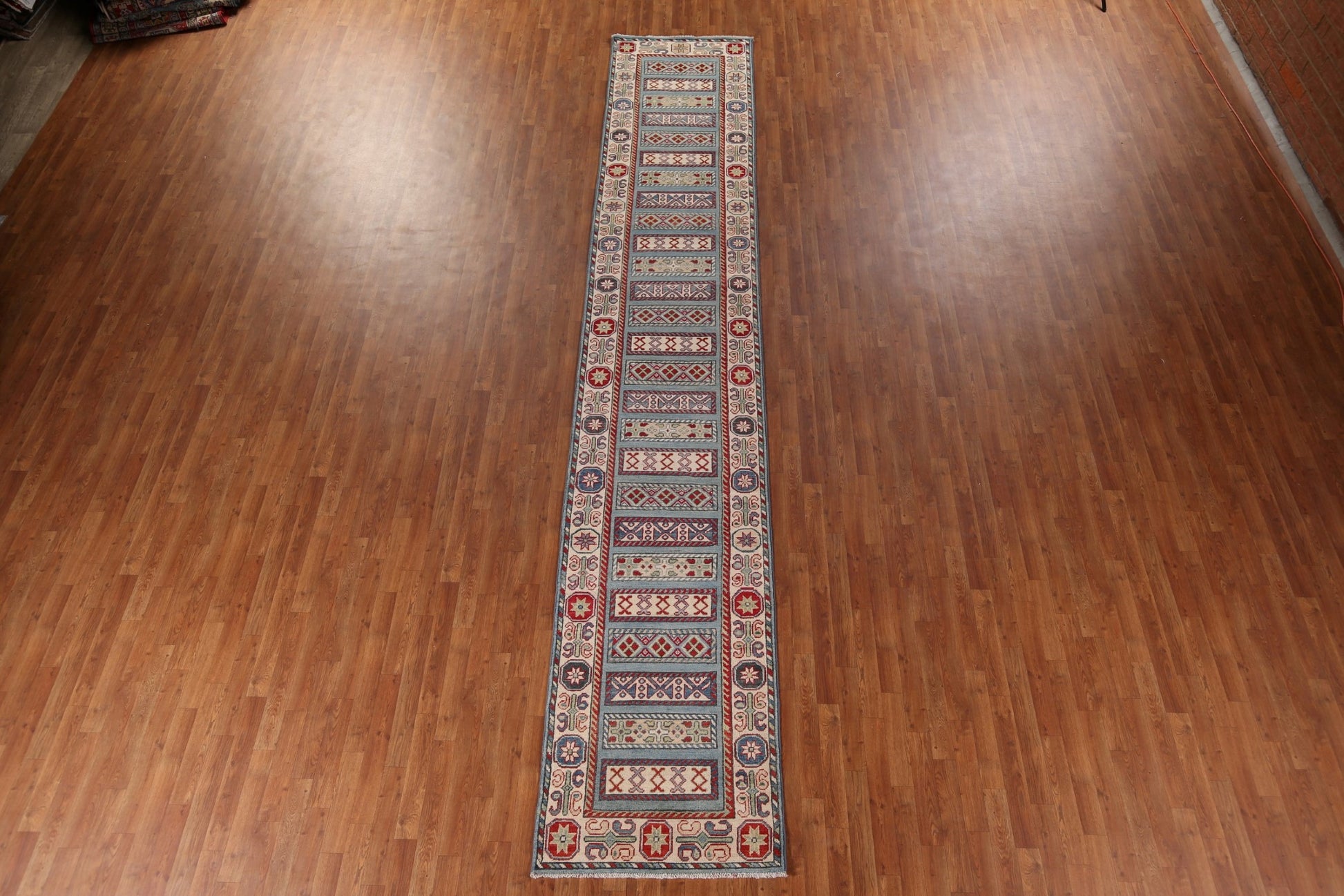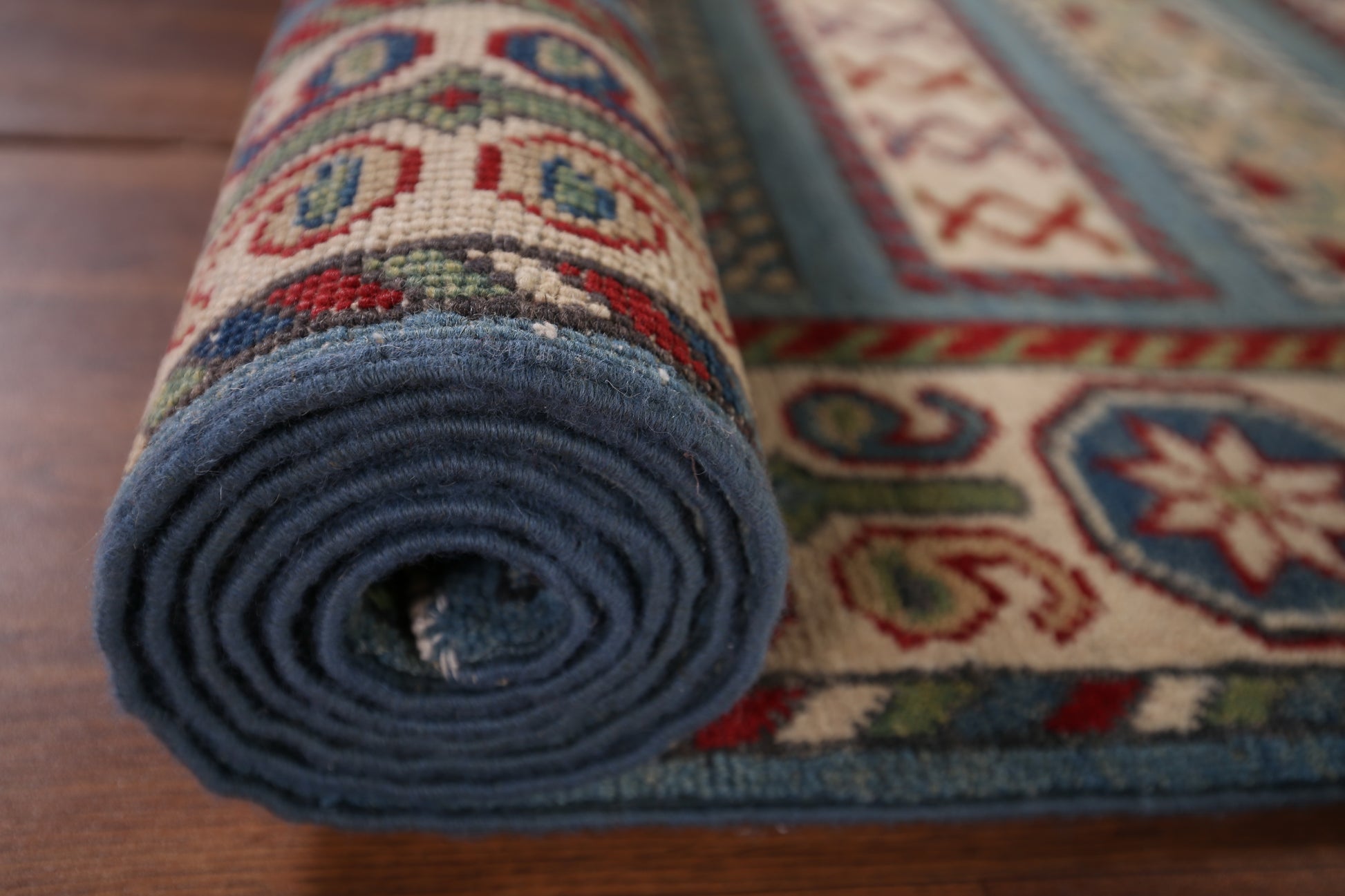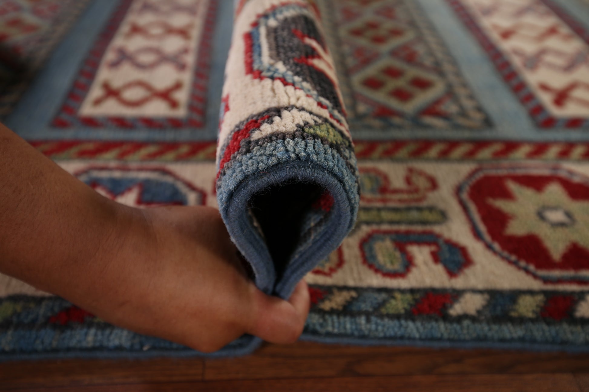 A Beautiful Genuine Pakistan Kazak rug is Hand Knotted by skillful weavers in Pakistan with 100% Wool Material. This rug is in New, First Quality condition. dimensions are 16' 5'' X 3' 0'' in foot and 500 X 91 in centimeter. the primary color is Navy Blue & Blues.