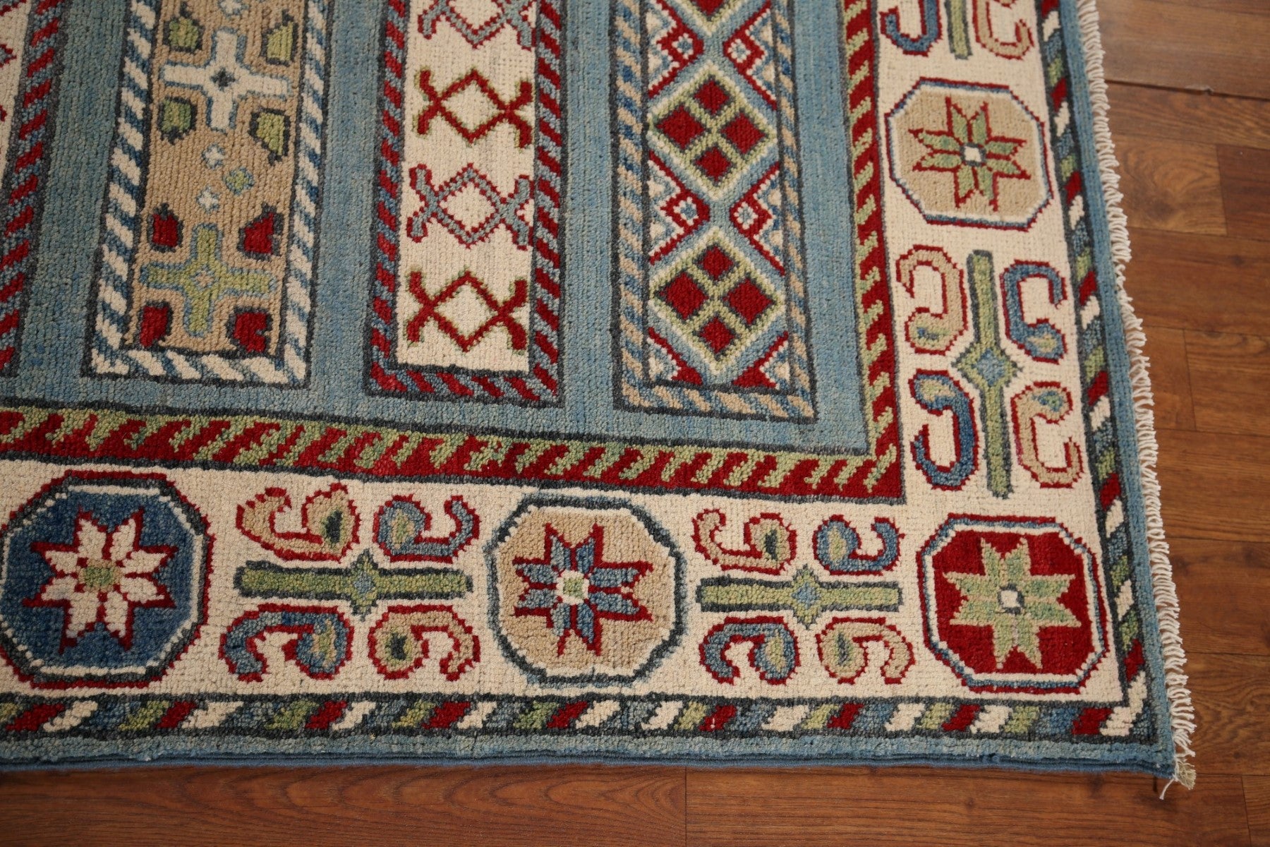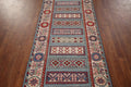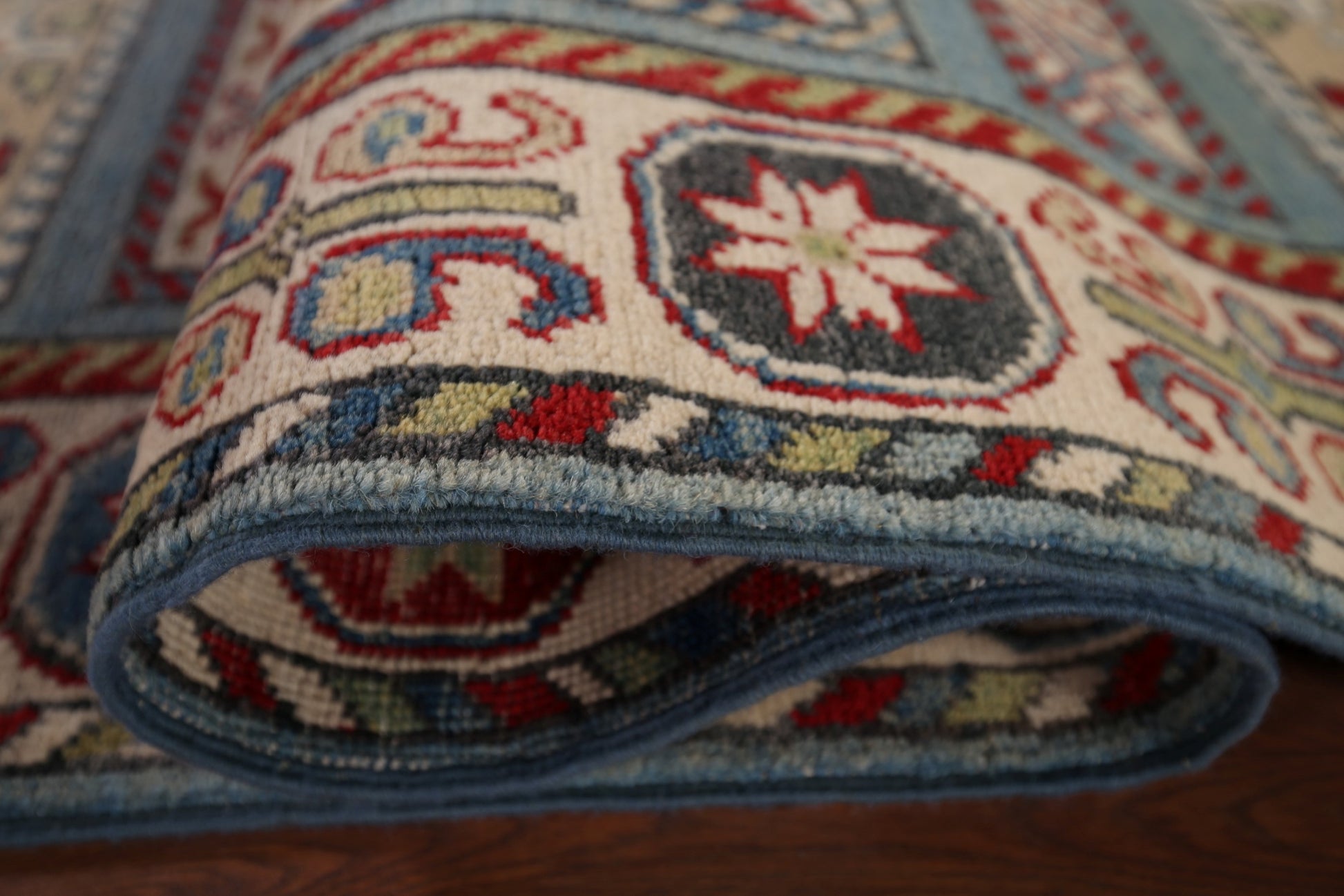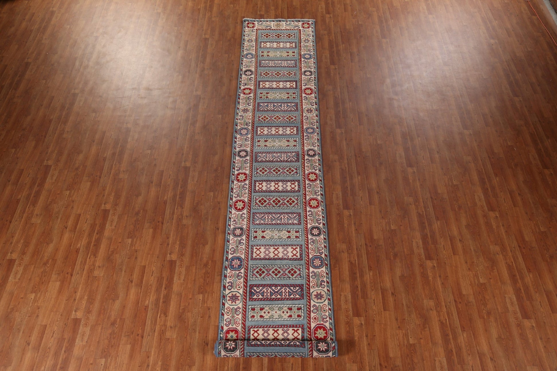 A Beautiful Genuine Pakistan Kazak rug is Hand Knotted by skillful weavers in Pakistan with 100% Wool Material. This rug is in New, First Quality condition. dimensions are 16' 5'' X 3' 0'' in foot and 500 X 91 in centimeter. the primary color is Navy Blue & Blues.