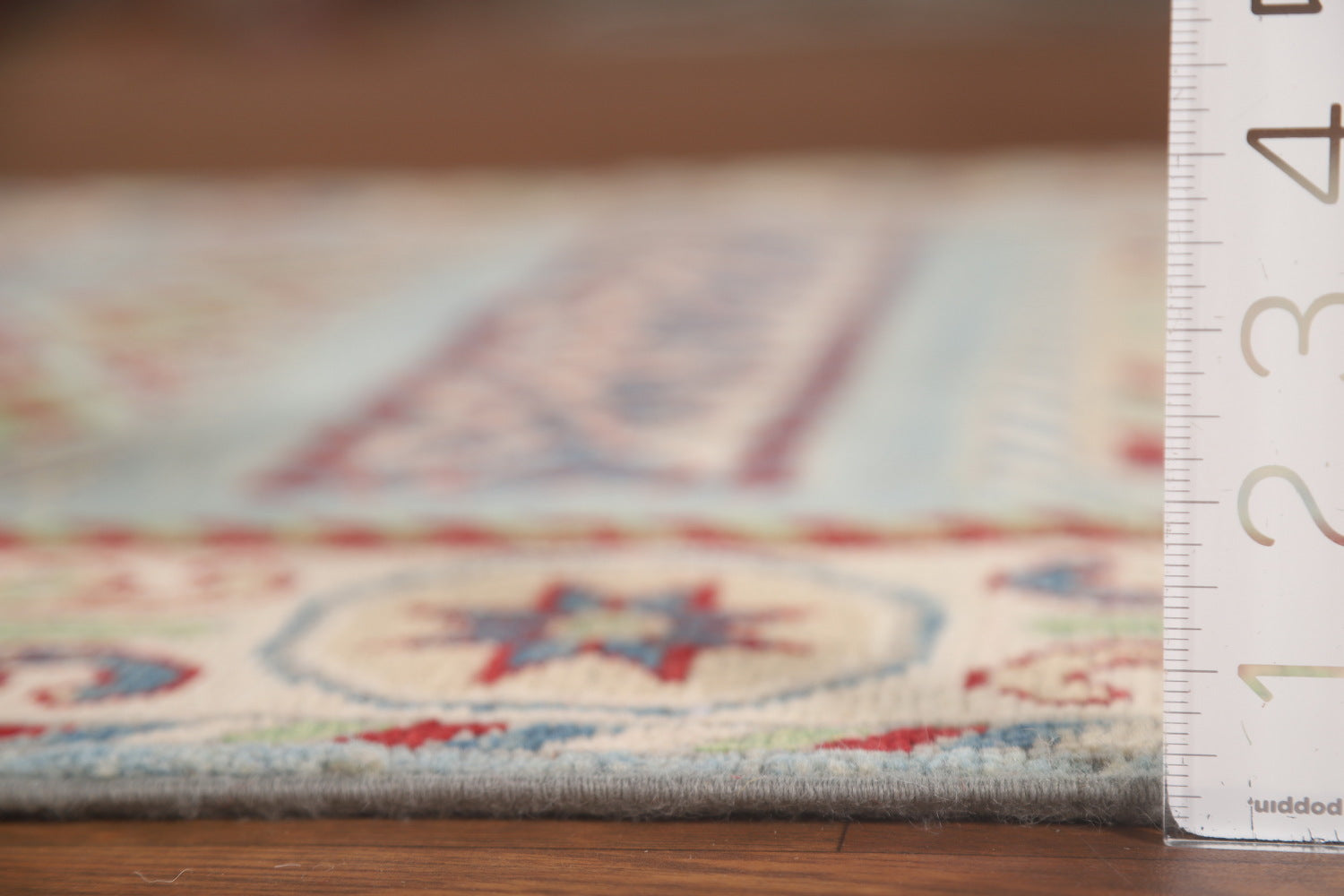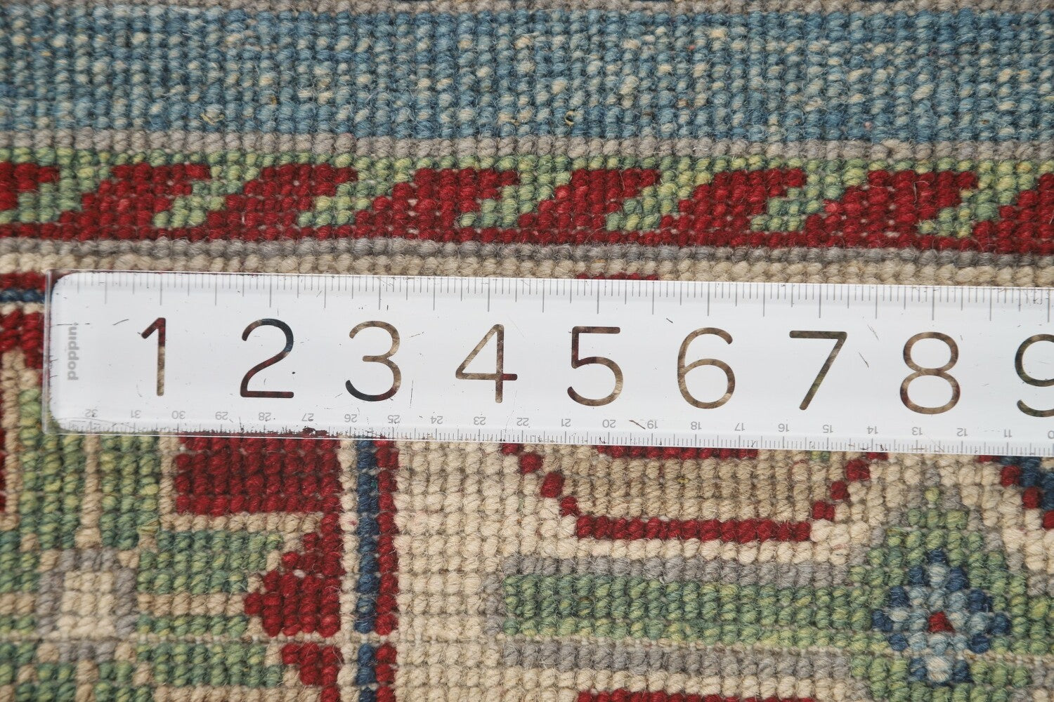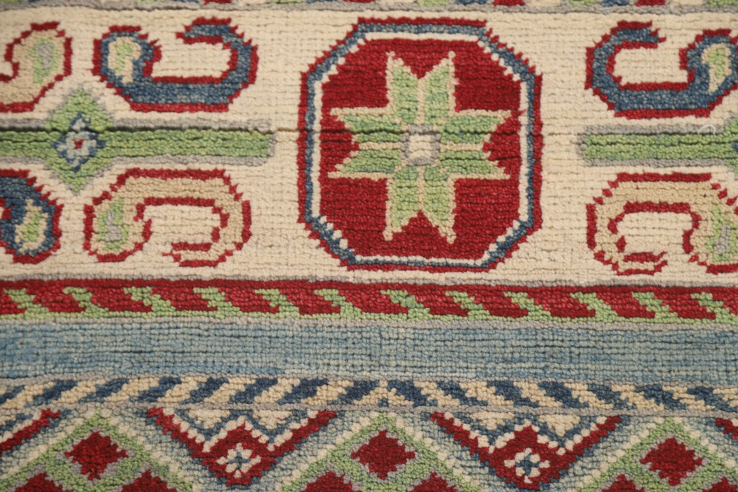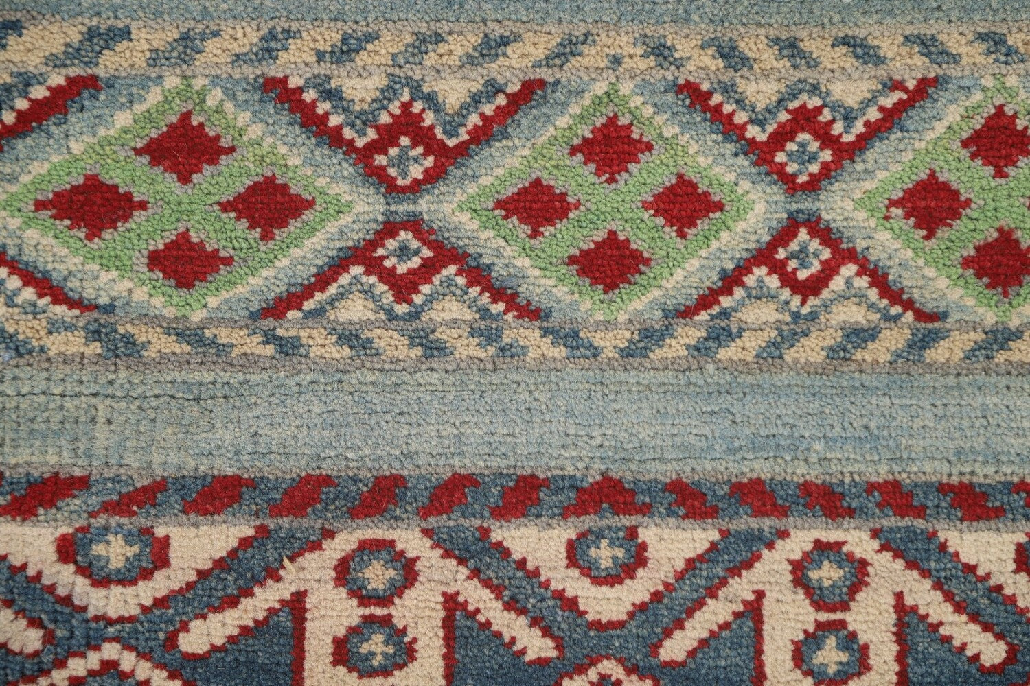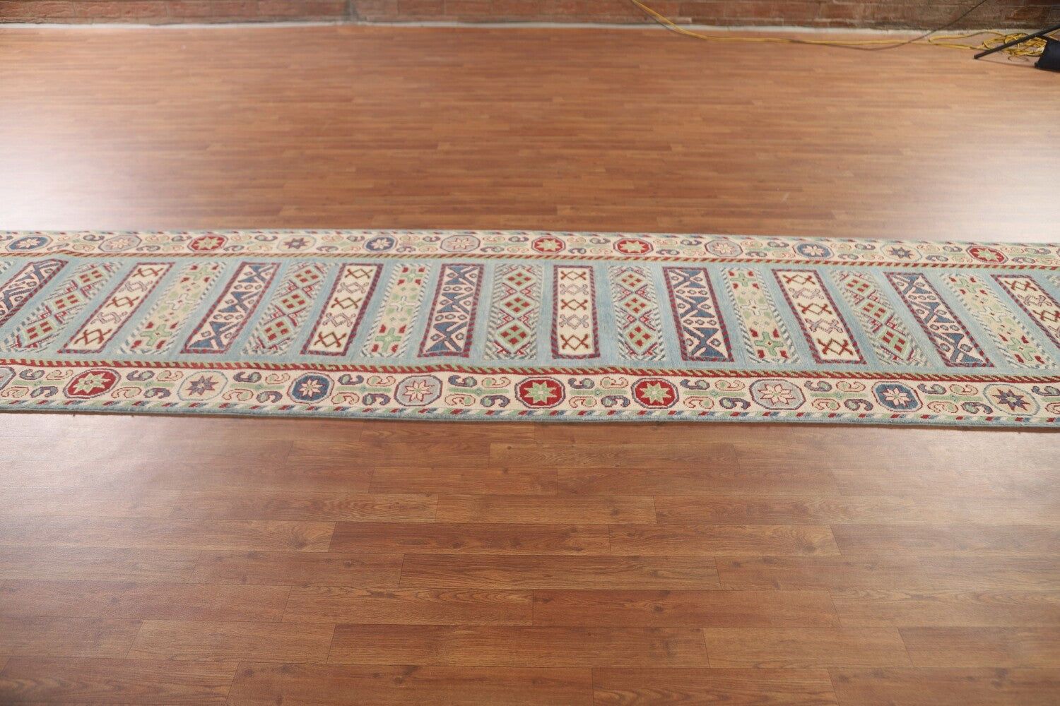 A Beautiful Genuine Pakistan Kazak rug is Hand Knotted by skillful weavers in Pakistan with 100% Wool Material. This rug is in New, First Quality condition. dimensions are 16' 0'' X 3' 4'' in foot and 488 X 102 in centimeter. the primary color is Navy Blue & Blues.