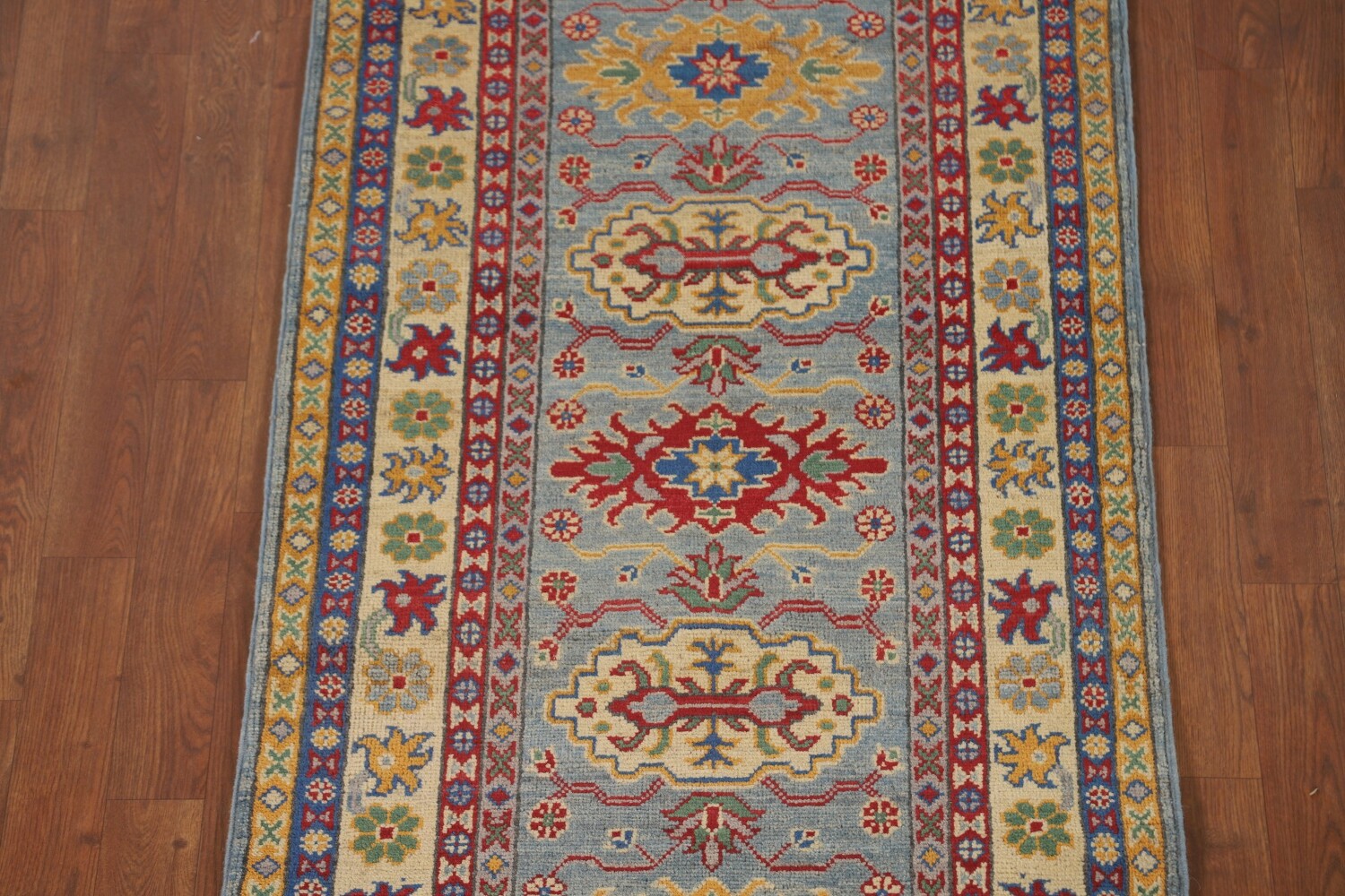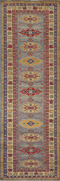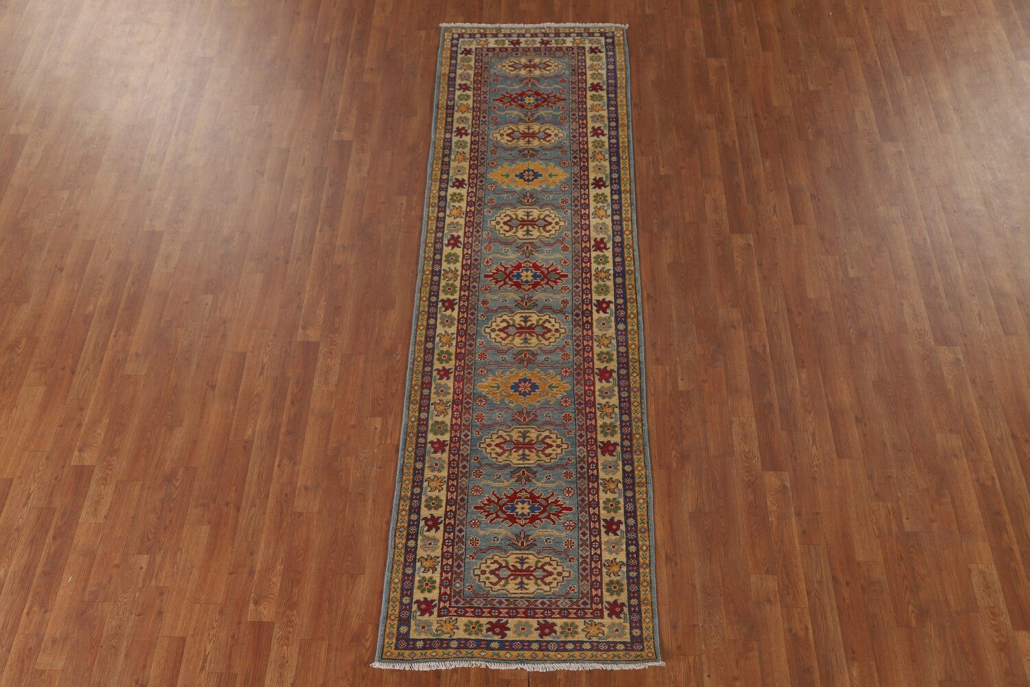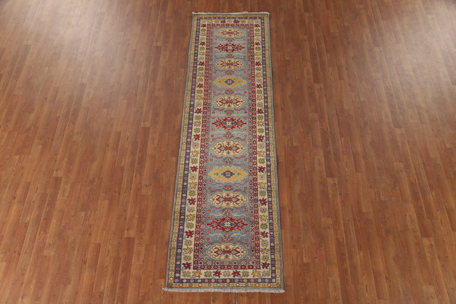 A Beautiful Genuine Pakistan Kazak rug is Hand Knotted by skillful weavers in Pakistan with 100% Wool Material. This rug is in New, First Quality condition. dimensions are 9' 3'' X 2' 7'' in foot and 282 X 79 in centimeter. the primary color is Navy Blue & Blues.