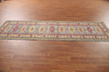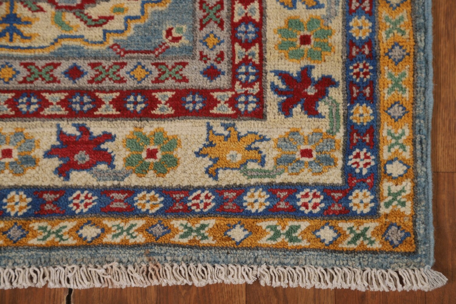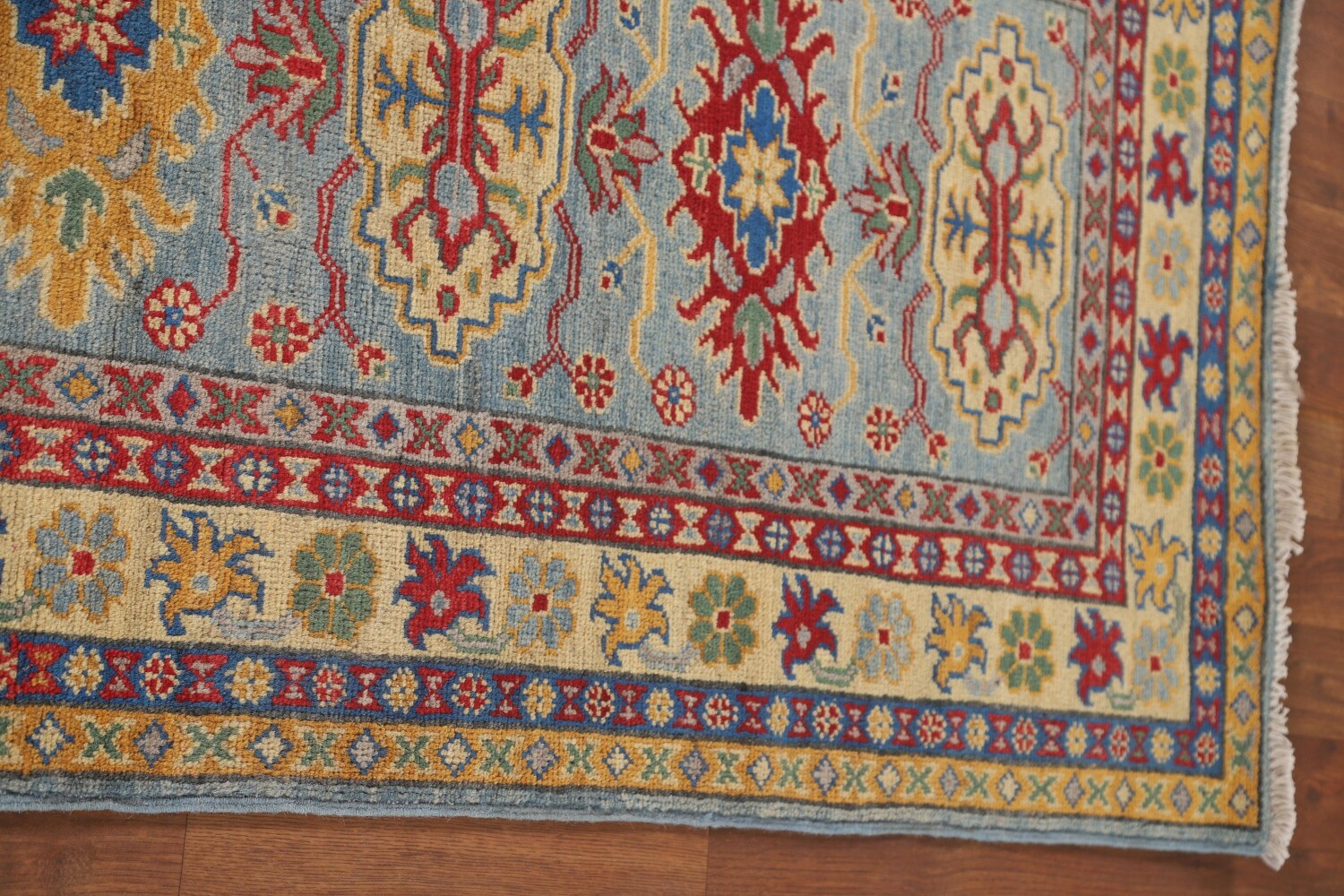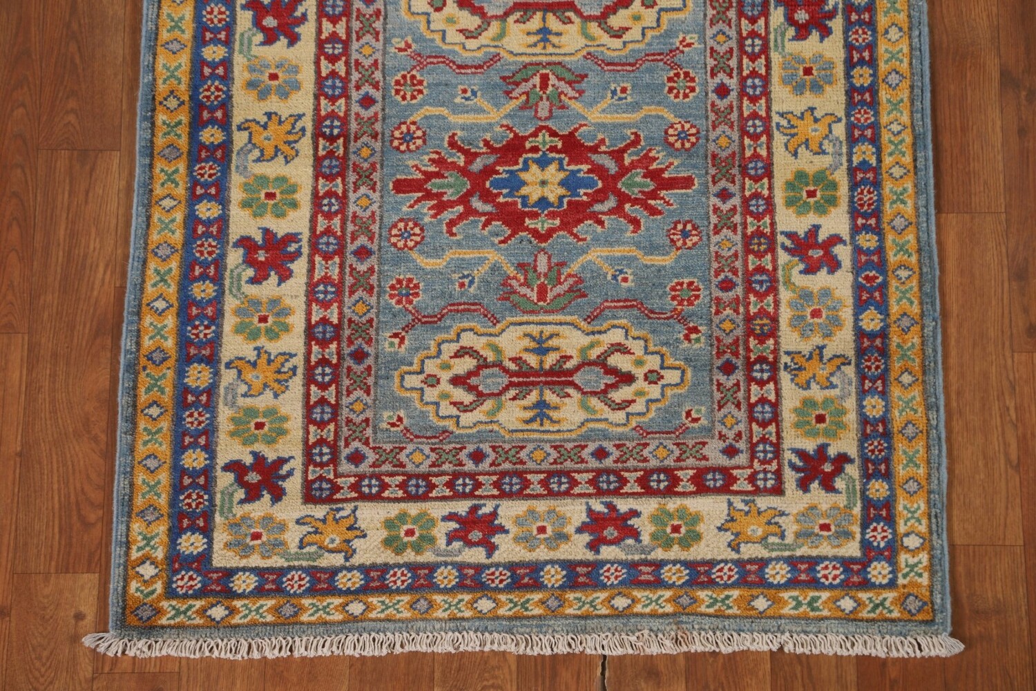 A Beautiful Genuine Pakistan Kazak rug is Hand Knotted by skillful weavers in Pakistan with 100% Wool Material. This rug is in New, First Quality condition. dimensions are 9' 3'' X 2' 7'' in foot and 282 X 79 in centimeter. the primary color is Navy Blue & Blues.