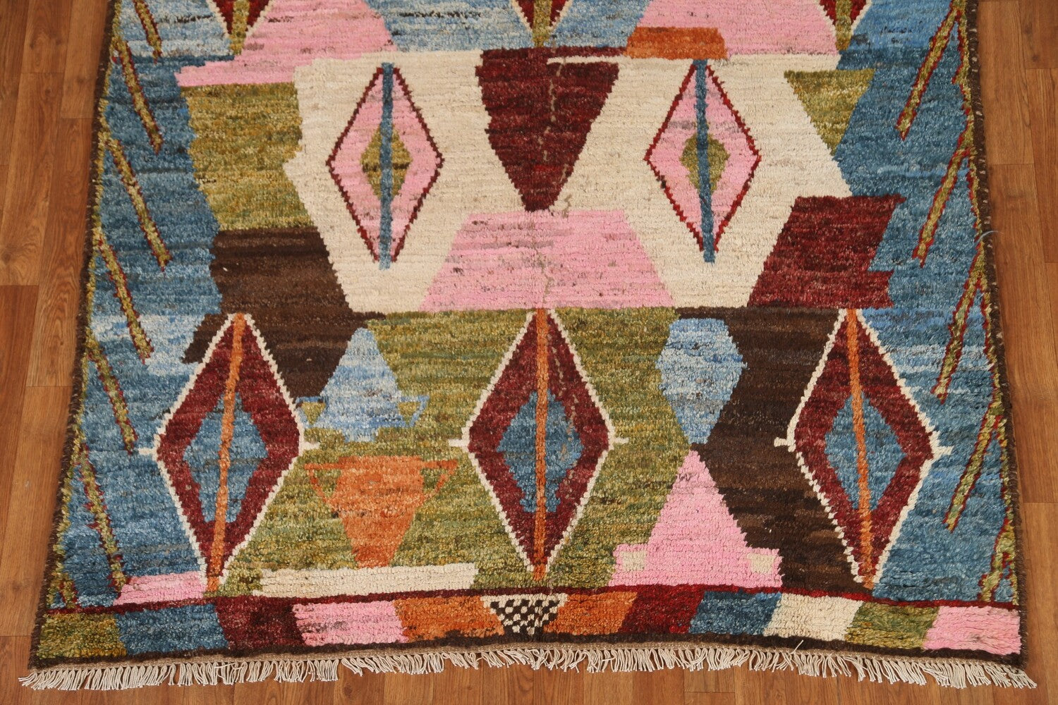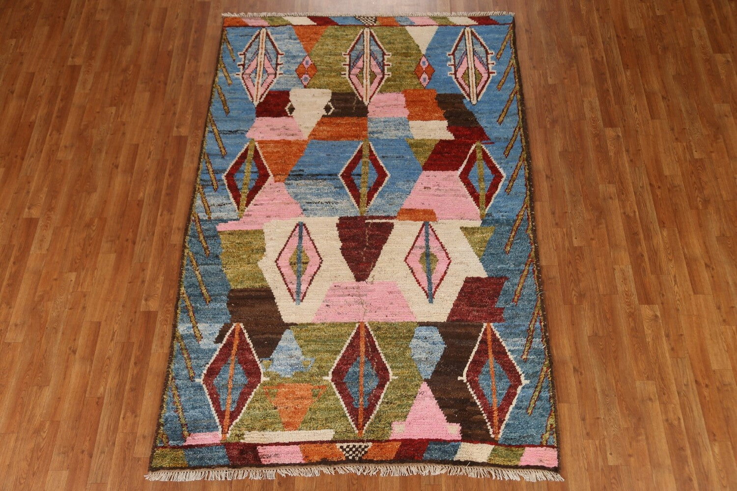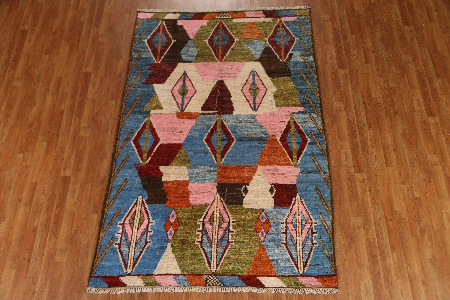 A Beautiful Genuine Pakistan Moroccan rug is Hand Knotted by skillful weavers in Pakistan with 100% Wool Material. This rug is in condition. dimensions are 8' 4'' X 5' 6'' in foot and 254 X 168 in centimeter. the primary color is Navy Blue & Blues.