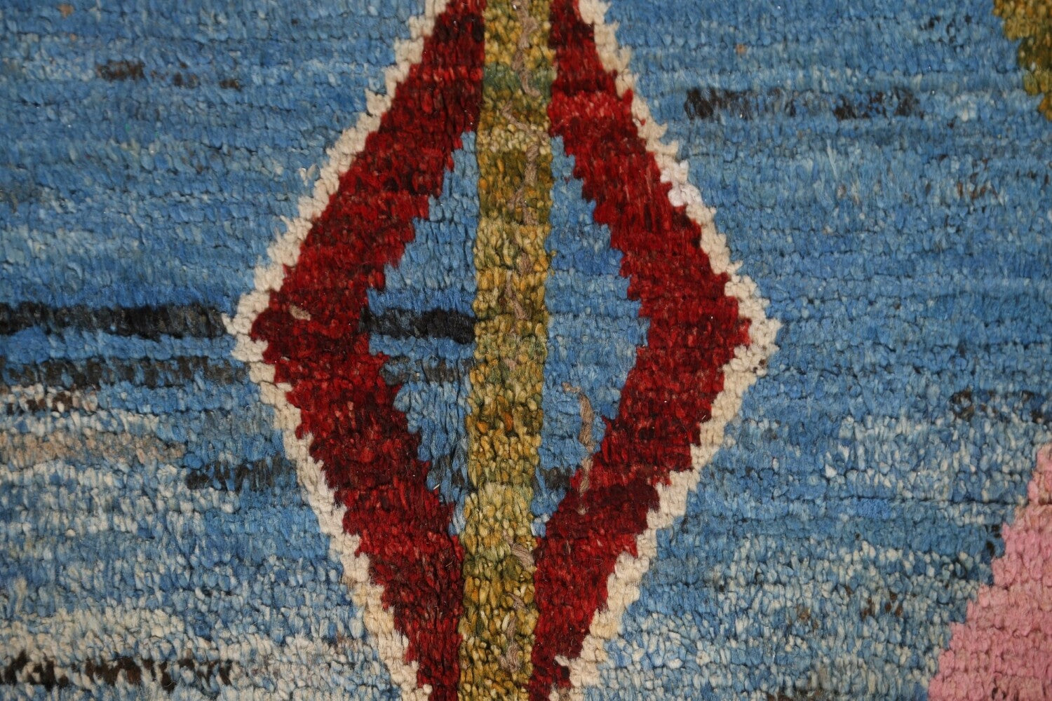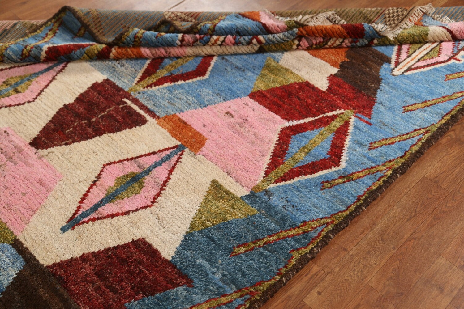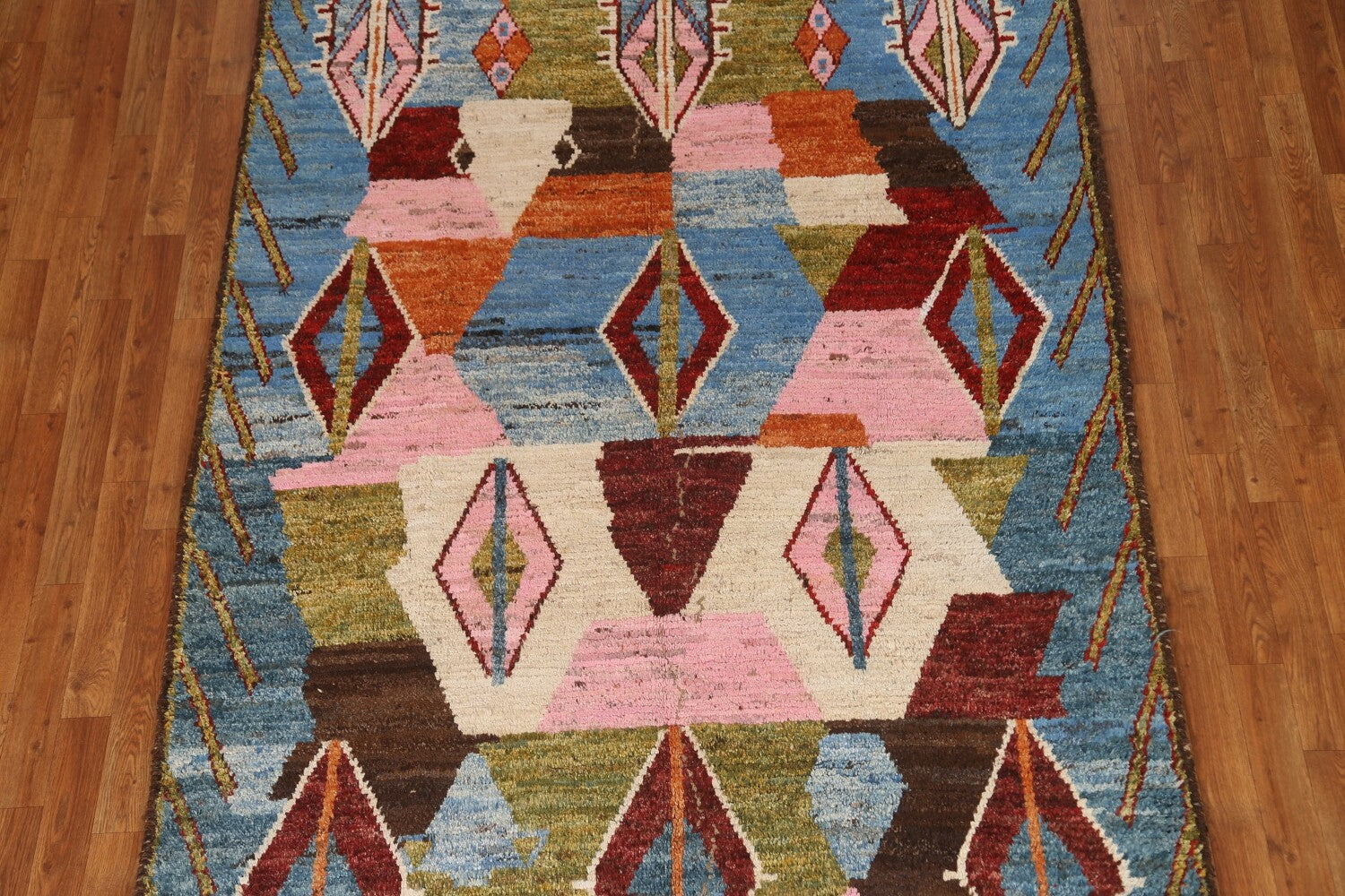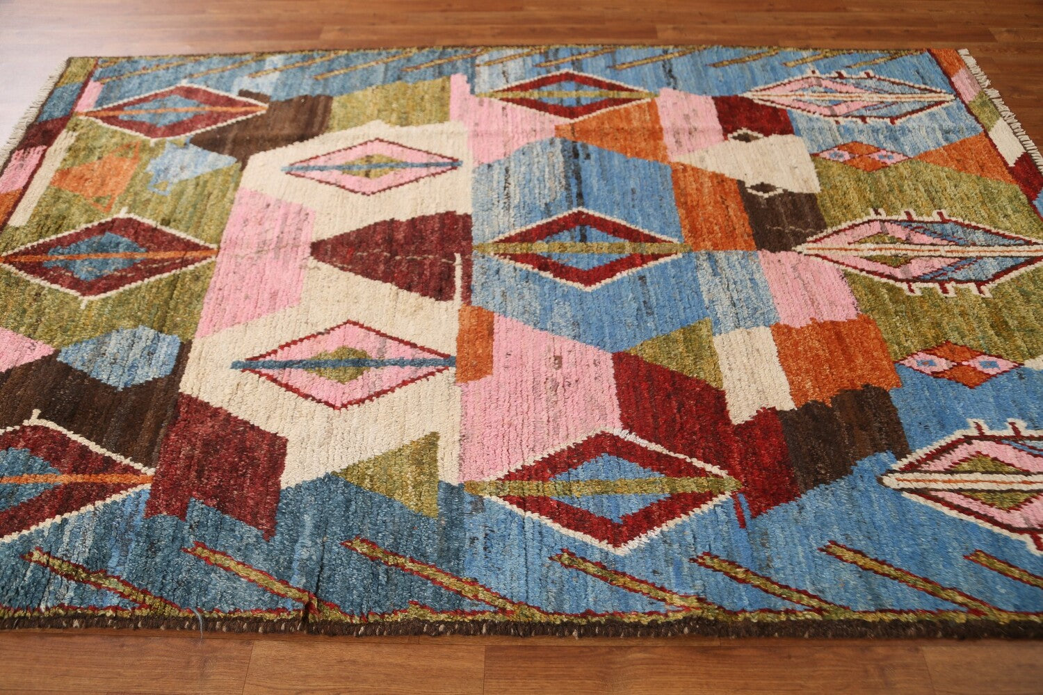 A Beautiful Genuine Pakistan Moroccan rug is Hand Knotted by skillful weavers in Pakistan with 100% Wool Material. This rug is in condition. dimensions are 8' 4'' X 5' 6'' in foot and 254 X 168 in centimeter. the primary color is Navy Blue & Blues.
