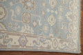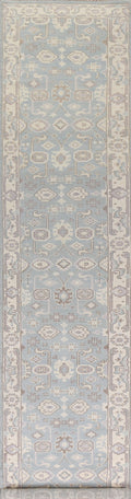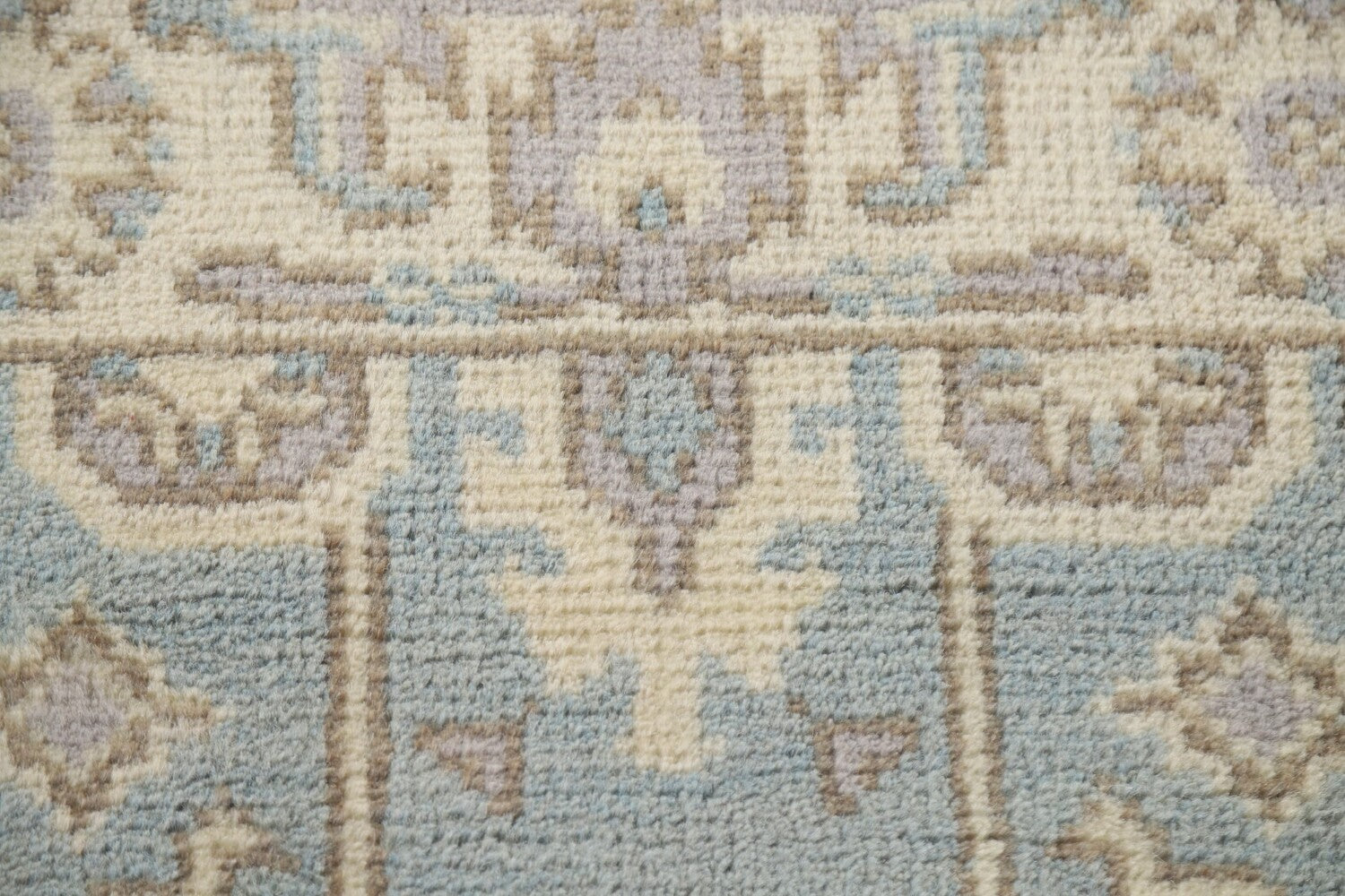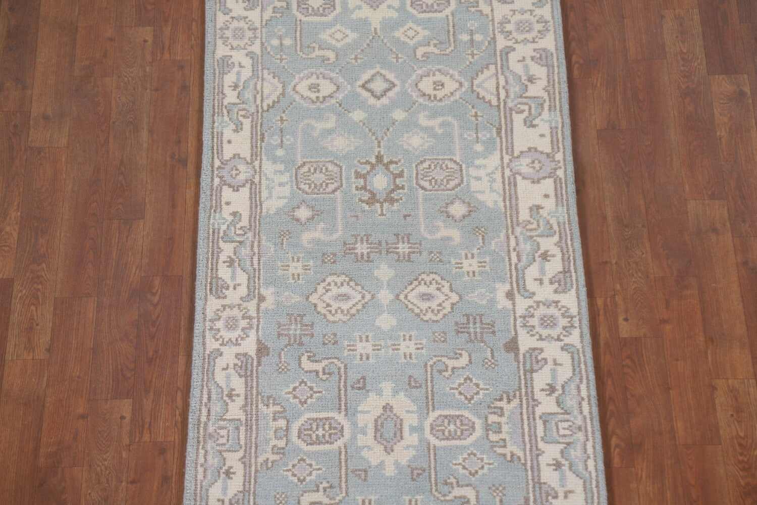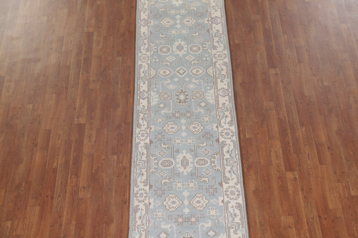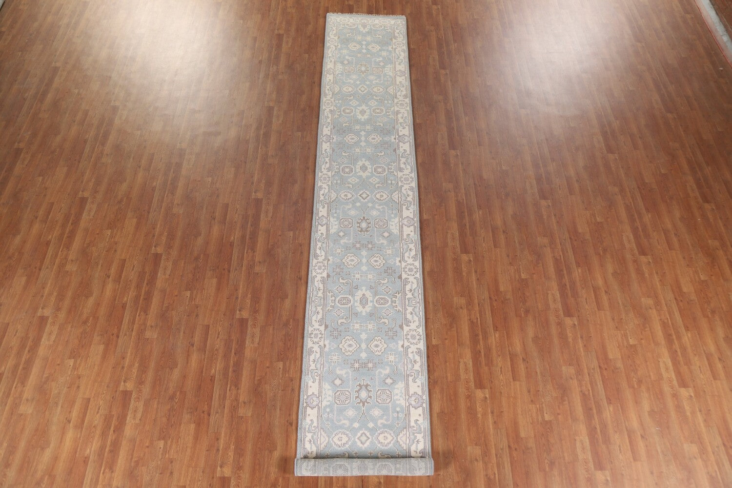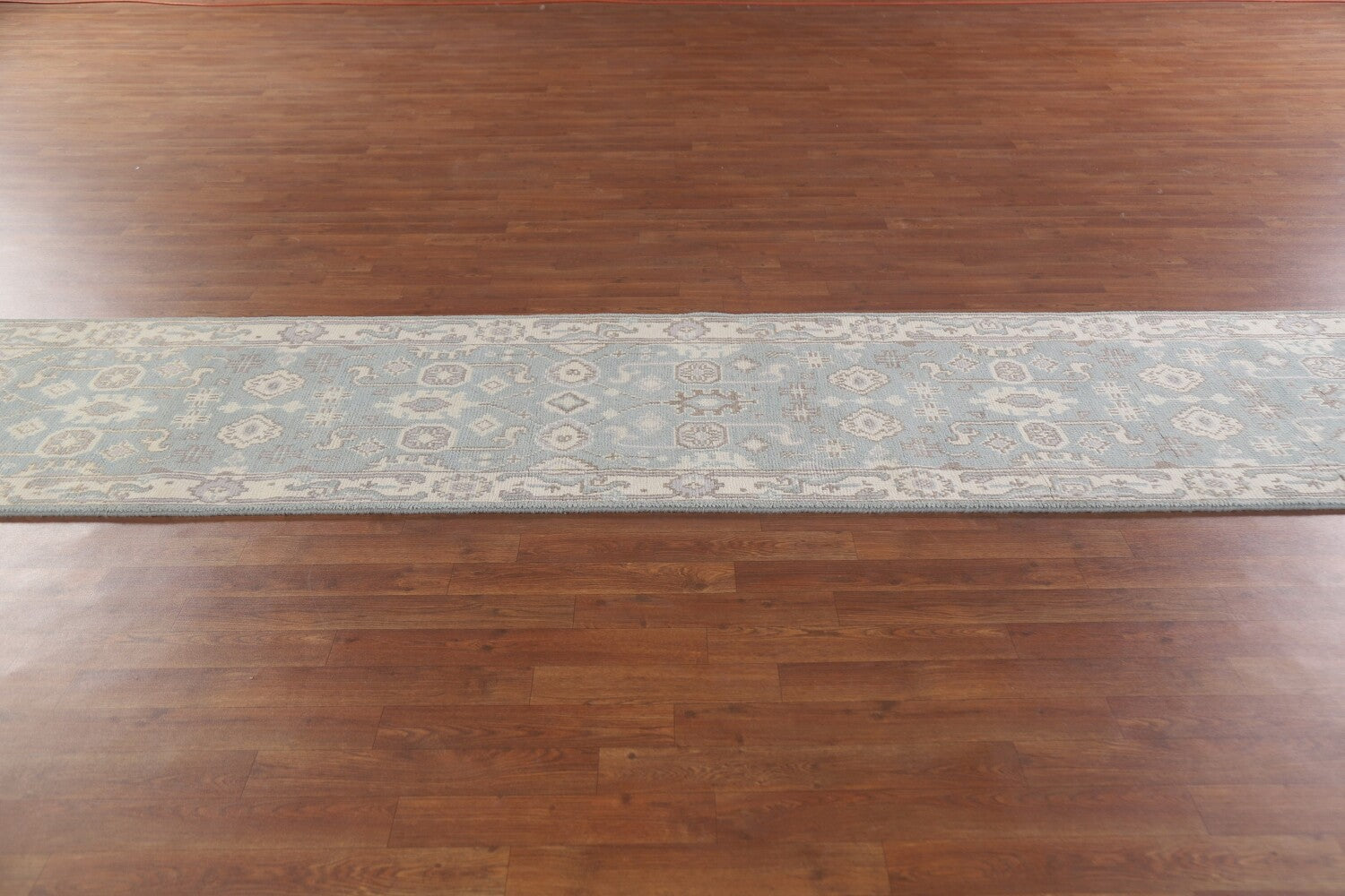 A Beautiful Genuine India Oushak rug is Hand Knotted by skillful weavers in India with 100% Wool Material. This rug is in New, First Quality condition. dimensions are 15' 10'' X 2' 7'' in foot and 483 X 79 in centimeter. the primary color is Navy Blue & Blues.