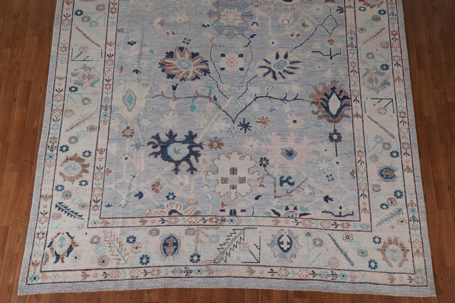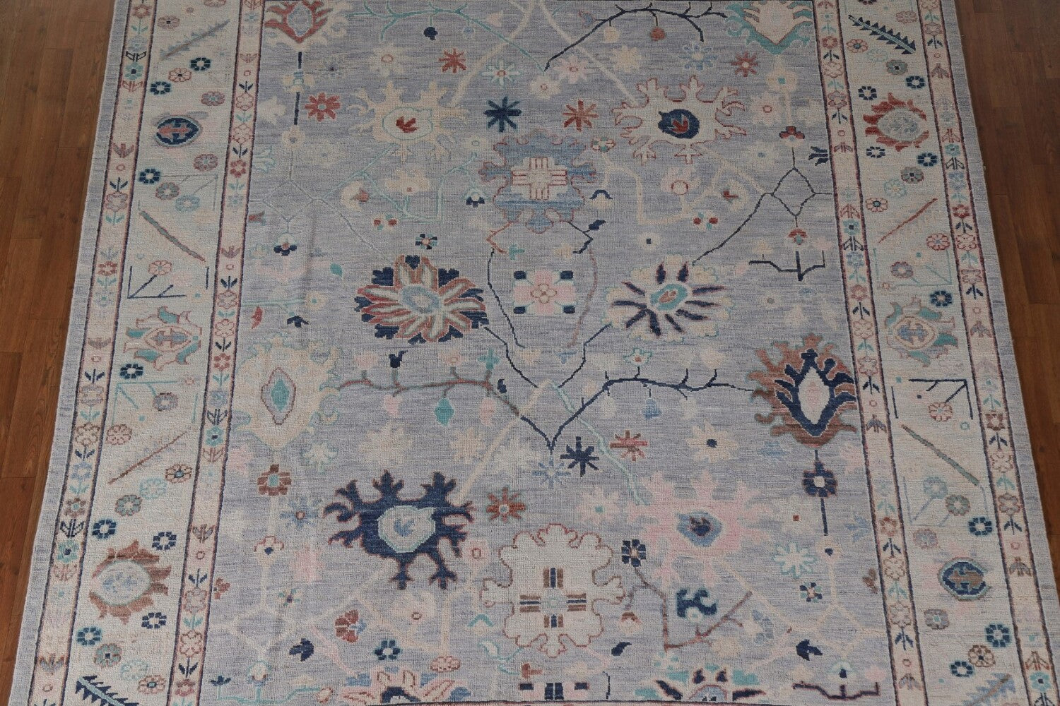 A Beautiful Genuine Turkey Oushak rug is Hand Knotted by skillful weavers in Turkey with 100% Wool Material. This rug is in New, First Quality condition. dimensions are 9' 8'' X 8' 1'' in foot and 295 X 246 in centimeter. the primary color is Navy Blue & Blues.