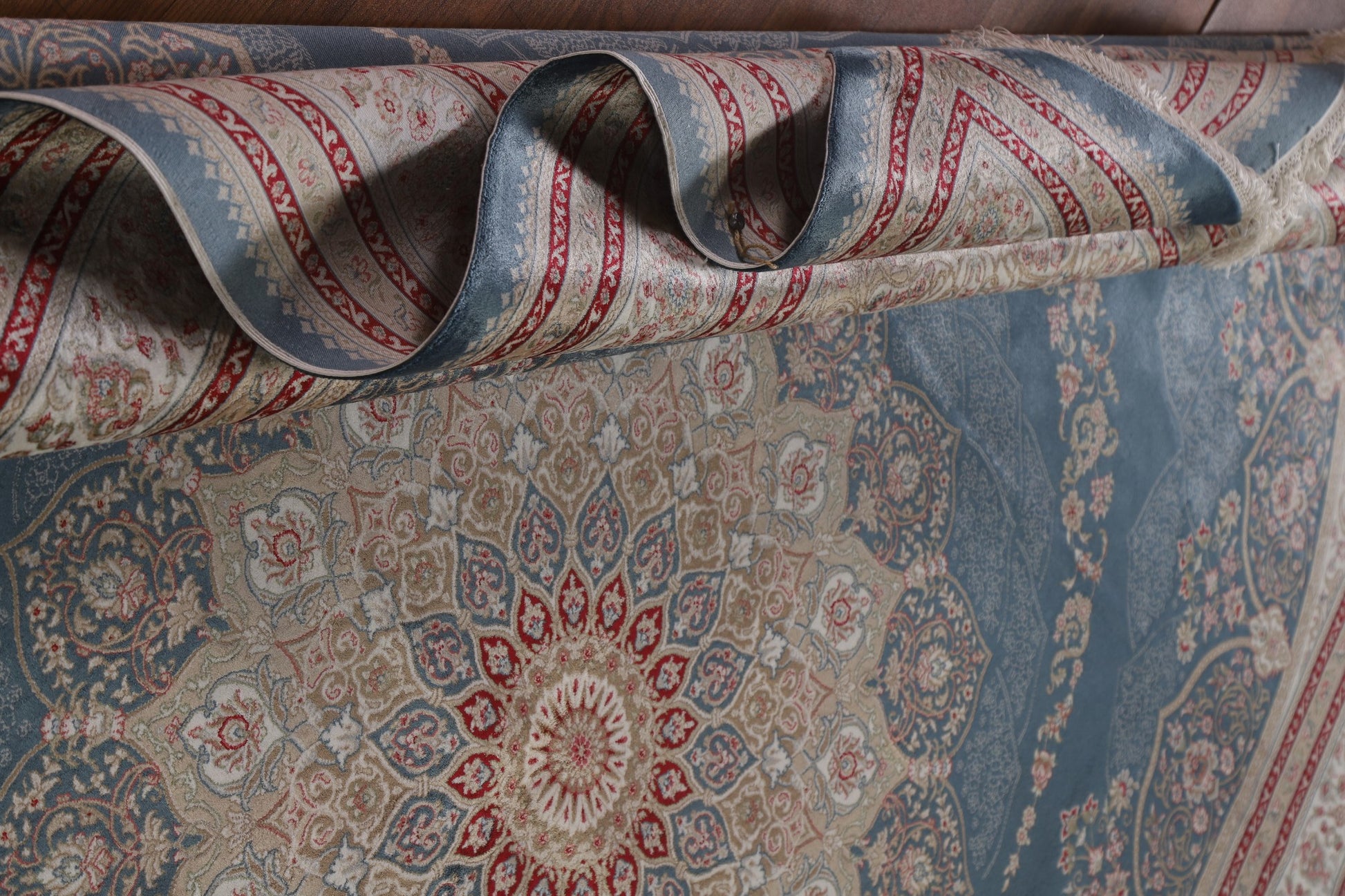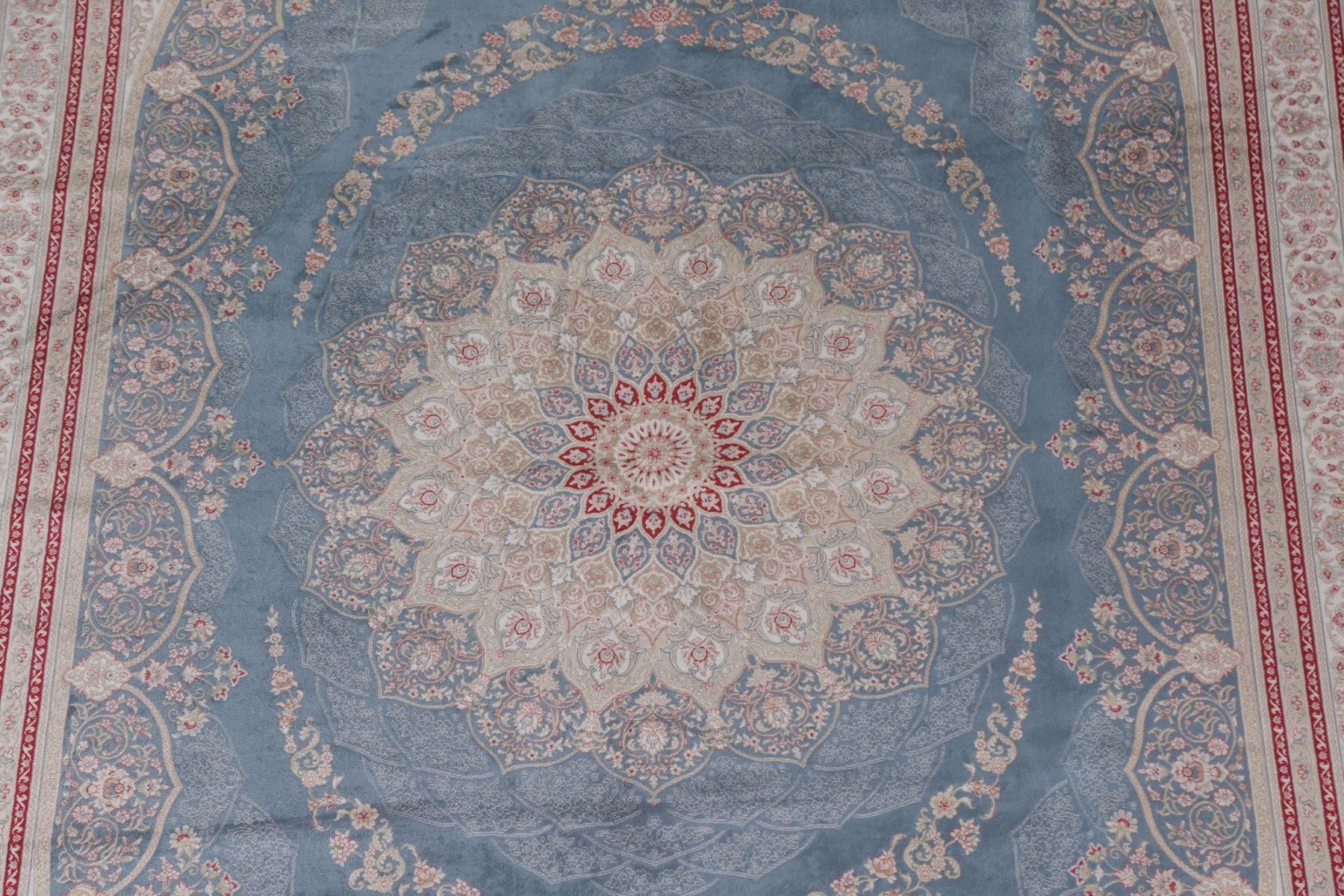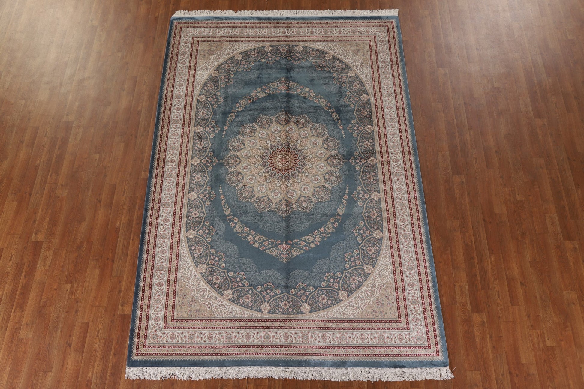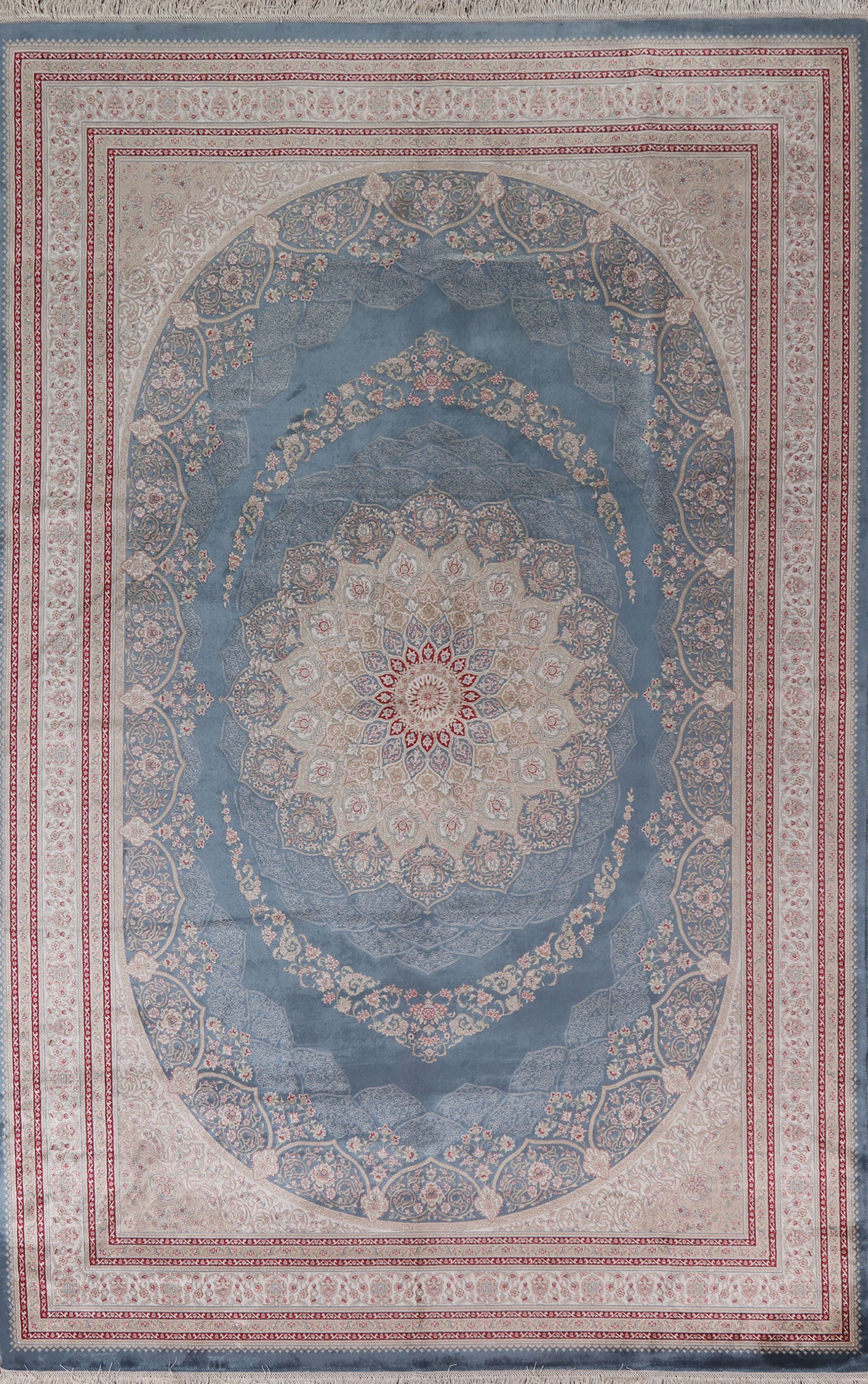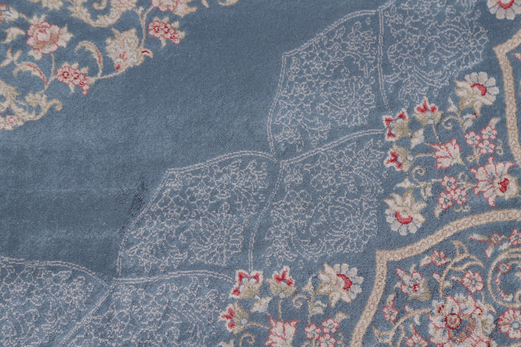 A Beautiful Genuine Turkey Qum rug is Machine Made by skillful weavers in Turkey with 90% Silk - 10% Polyester Material. This rug is in condition. dimensions are 9' 7'' X 6' 4'' in foot and 292 X 193 in centimeter. the primary color is Navy Blue & Blues.