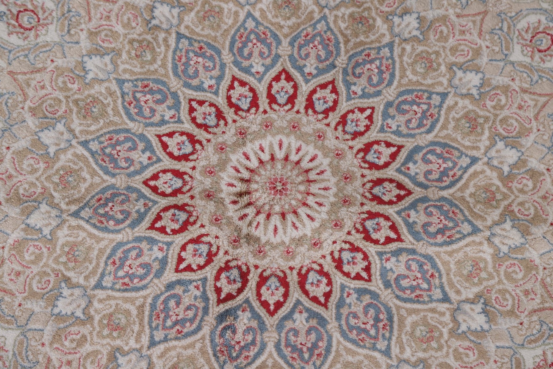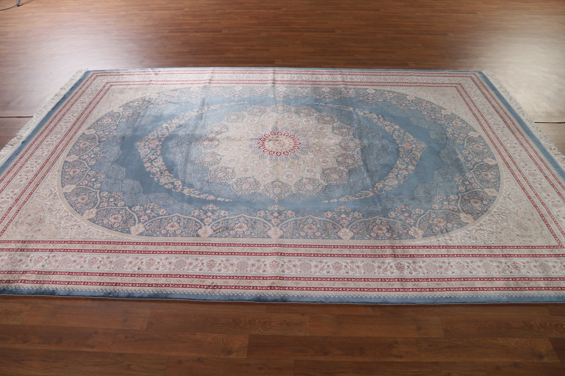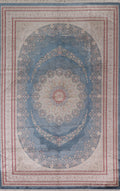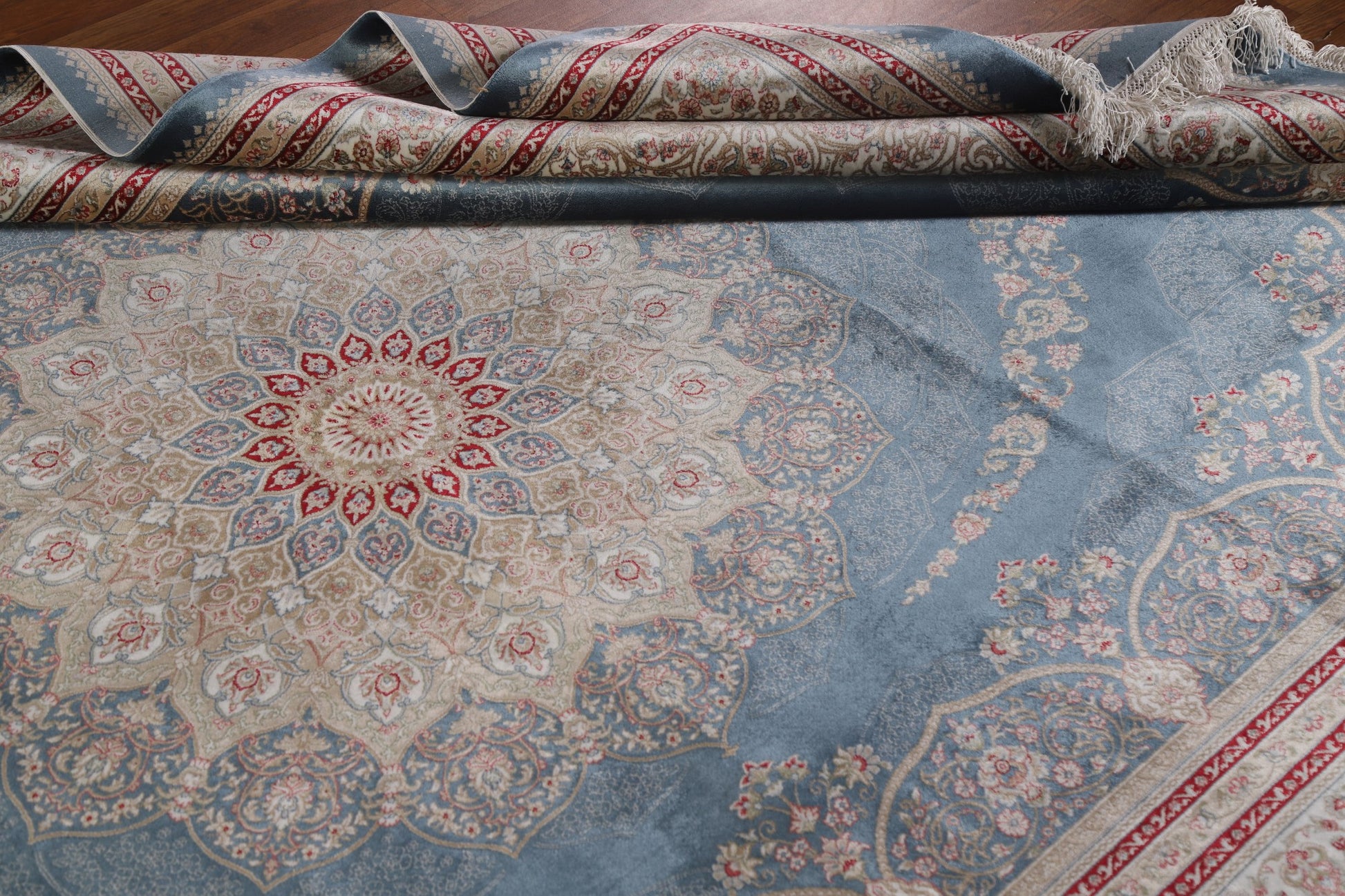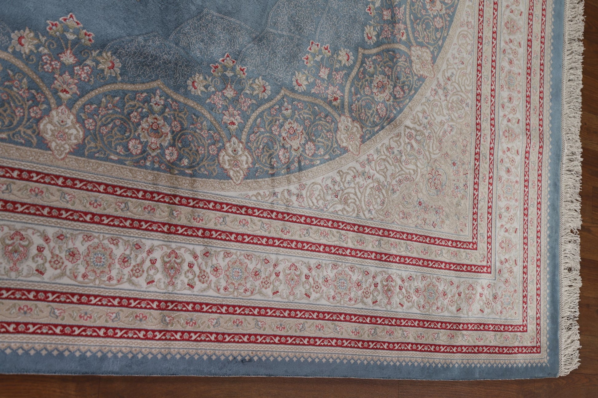 A Beautiful Genuine Turkey Qum rug is Machine Made by skillful weavers in Turkey with 90% Silk - 10% Polyester Material. This rug is in condition. dimensions are 9' 7'' X 6' 4'' in foot and 292 X 193 in centimeter. the primary color is Navy Blue & Blues.