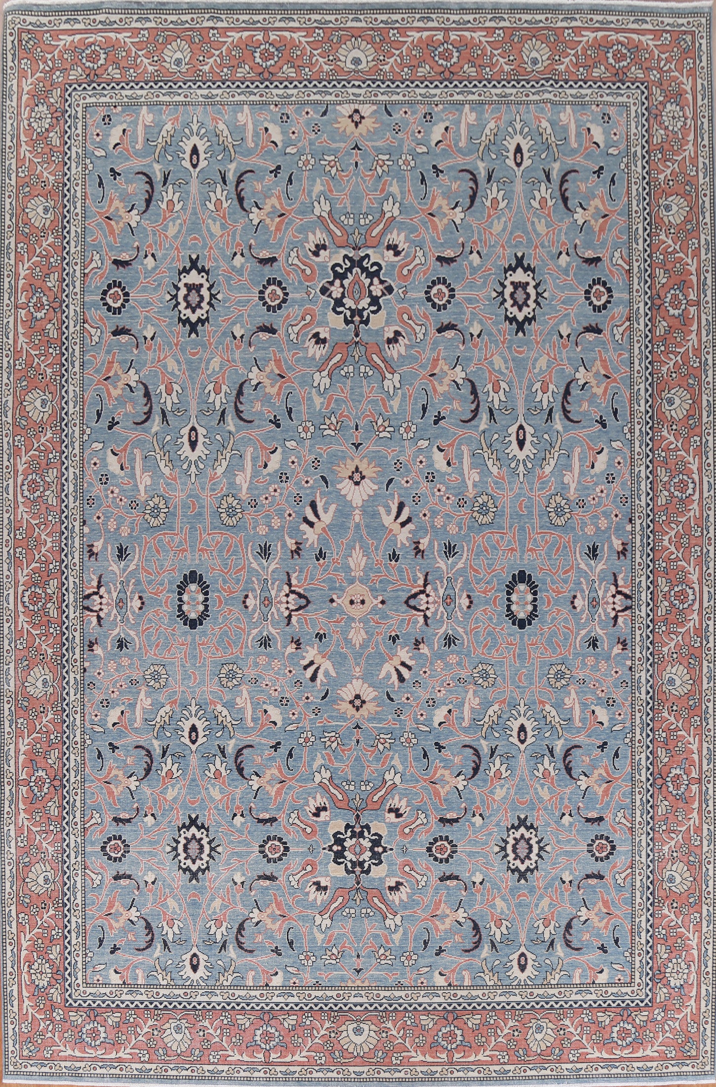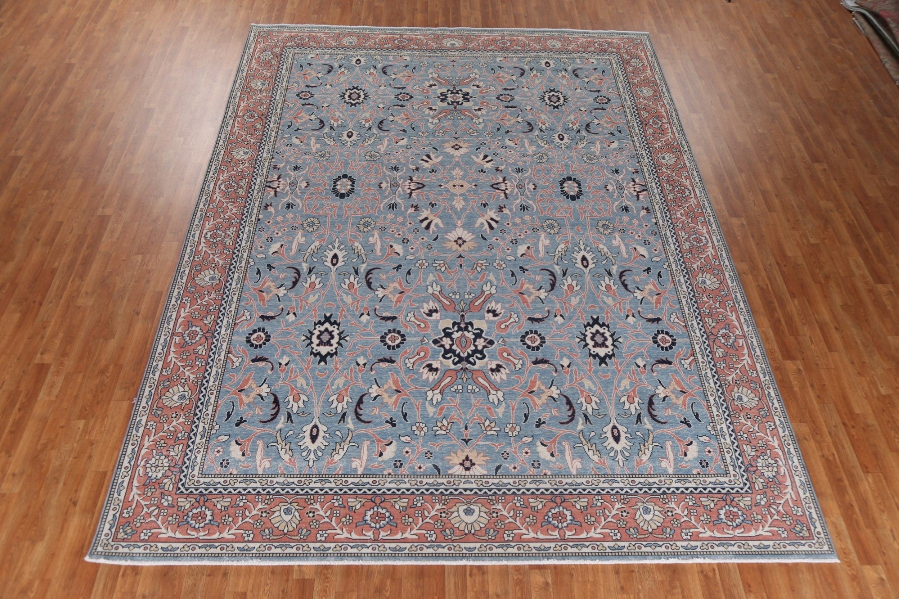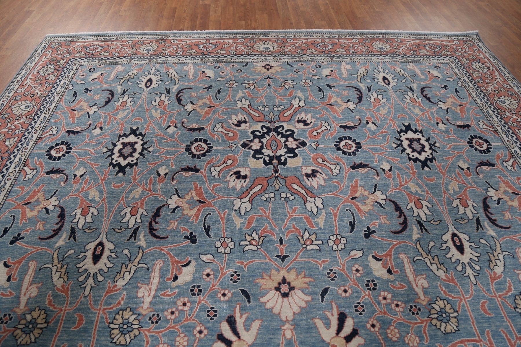 A Beautiful Genuine Turkey Sultanabad (Ziegler) rug is Hand Knotted by skillful weavers in Turkey with 100% Wool Material. This rug is in New, First Quality condition. dimensions are 12' 11'' X 9' 10'' in foot and 394 X 300 in centimeter. the primary color is Navy Blue & Blues.
