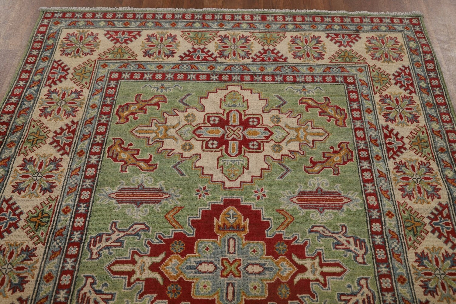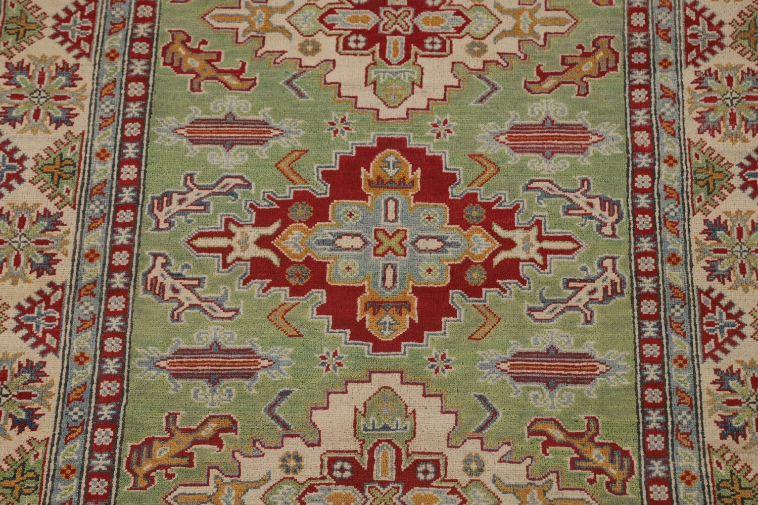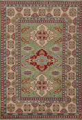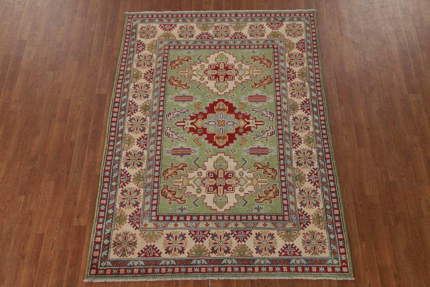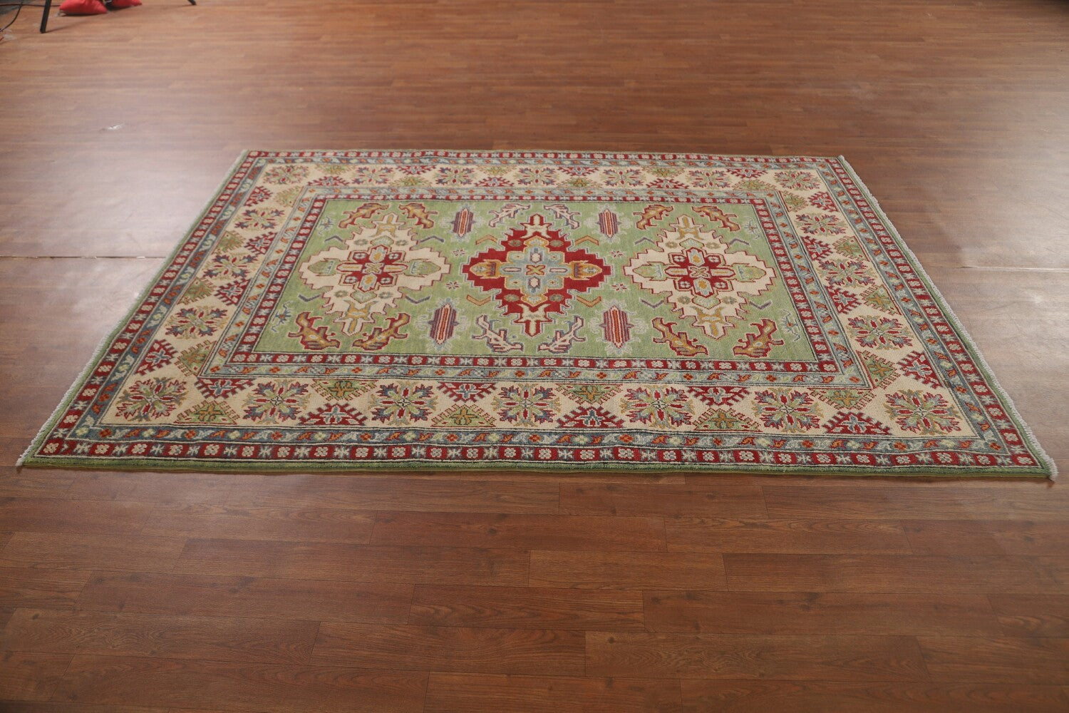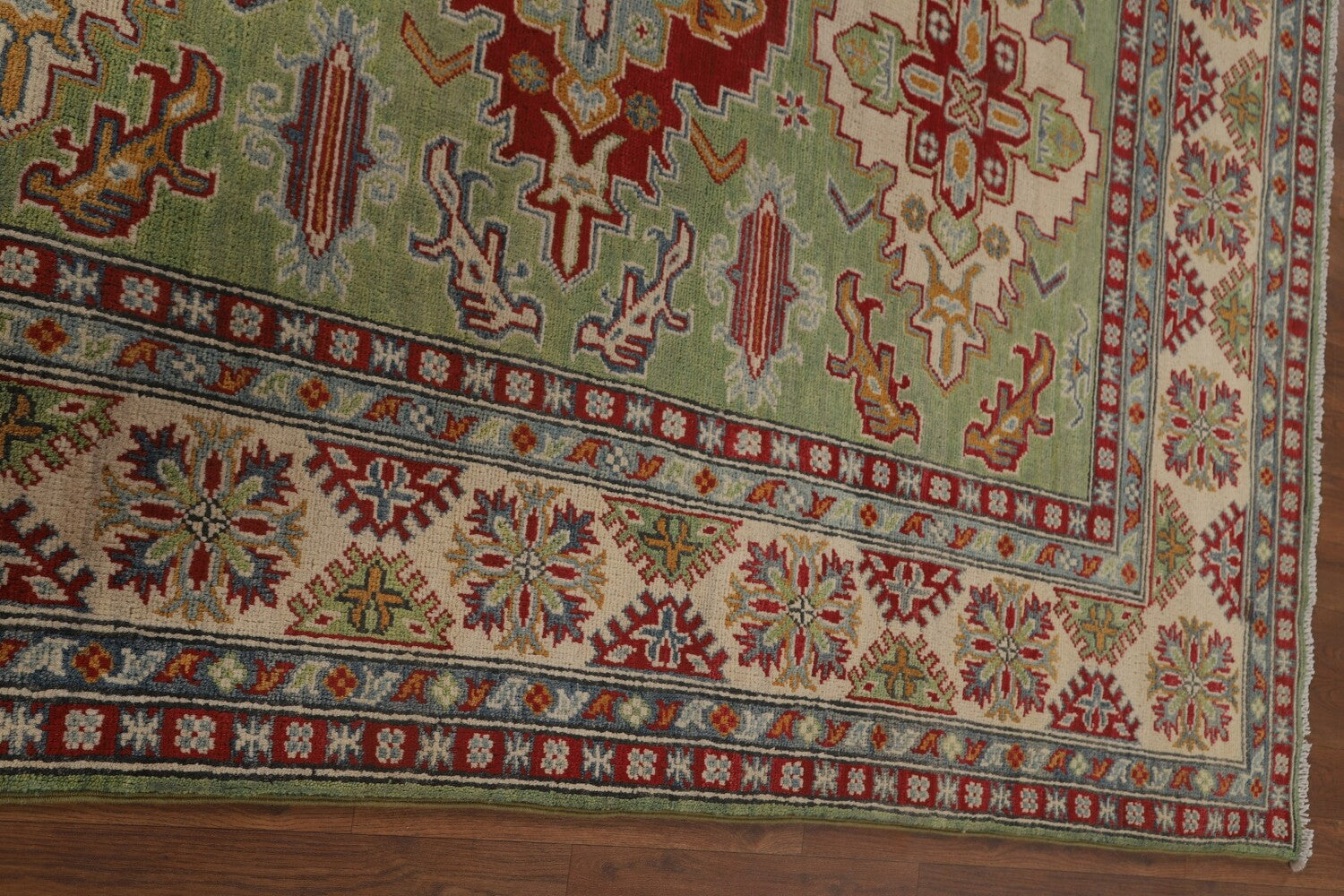 A Beautiful Genuine Pakistan Kazak rug is Hand Knotted by skillful weavers in Pakistan with 100% Wool Material. This rug is in New, First Quality condition. dimensions are 7' 0'' X 5' 0'' in foot and 213 X 152 in centimeter. the primary color is Green.
