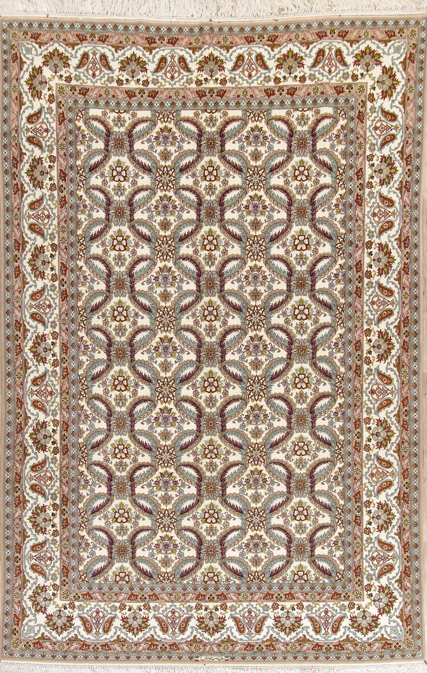 A Beautiful Genuine Persia ( Persia ) Isfahan rug is Hand Knotted by skillful weavers in Persia ( Persia ) with Wool & Silk Material. This rug is in New, First Quality condition. dimensions are 12' 3'' X 8' 1'' in foot and 373 X 246 in centimeter. the primary color is Beige & Ivories.