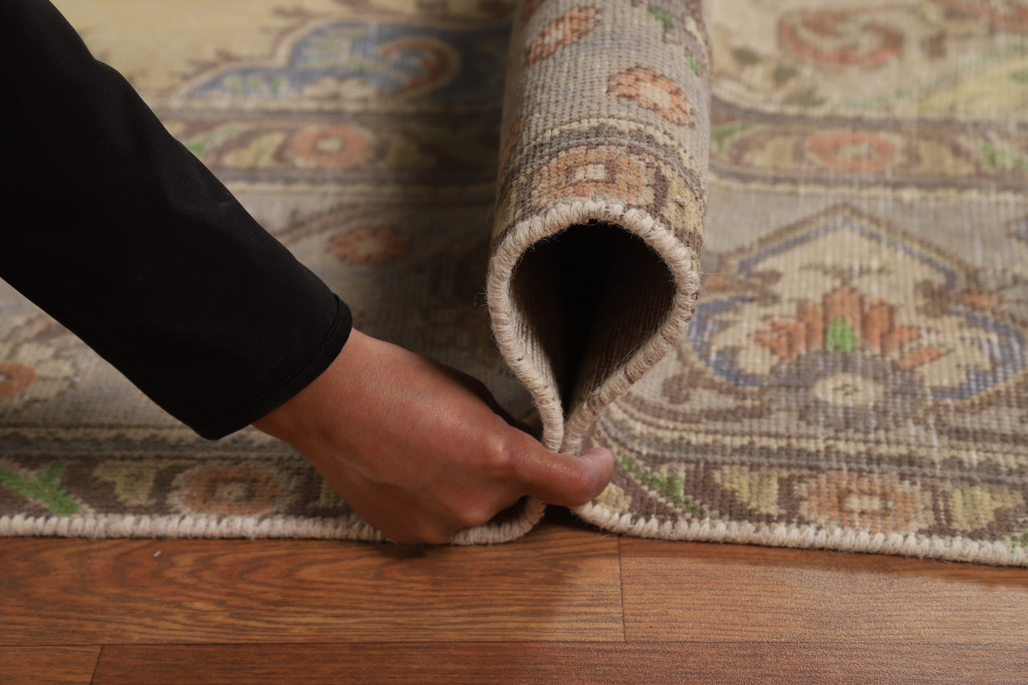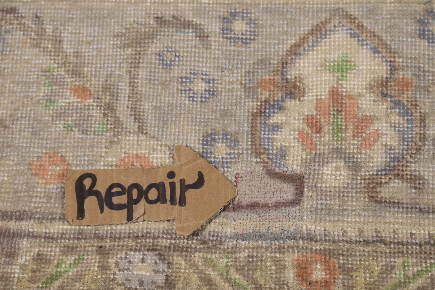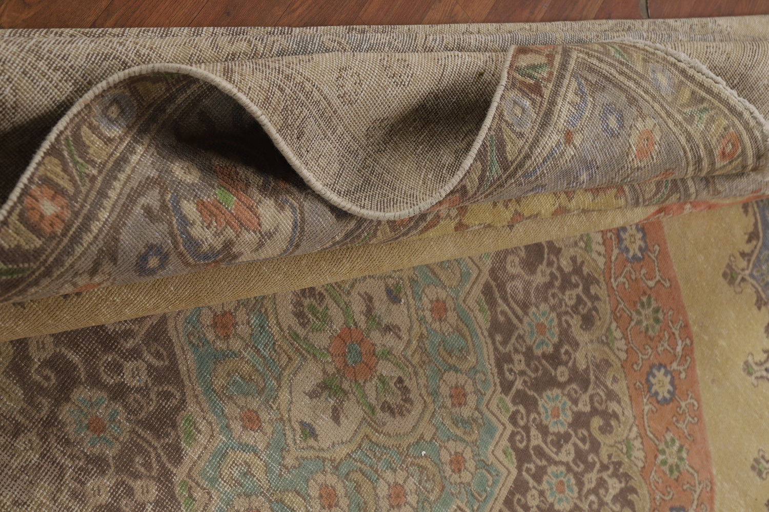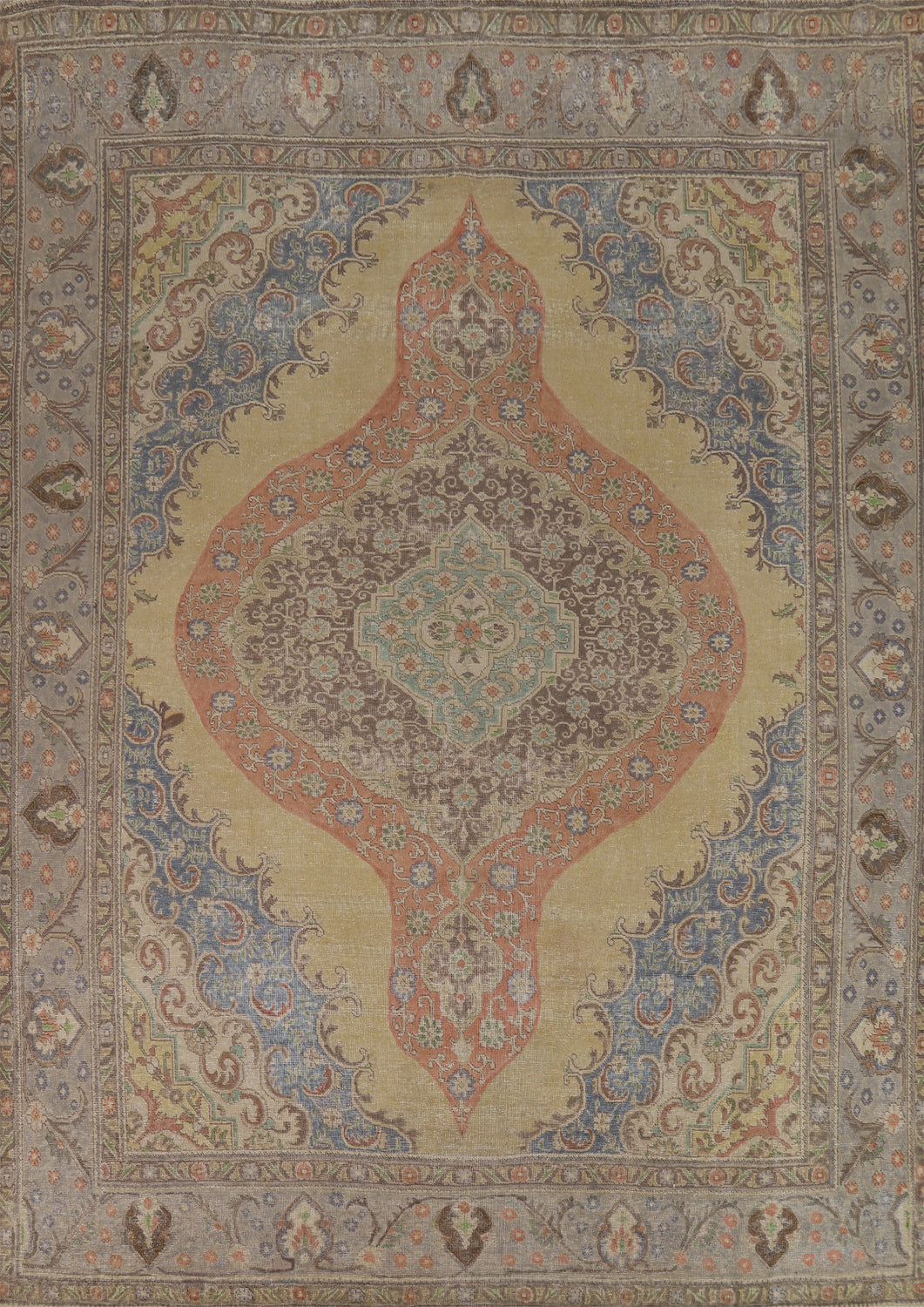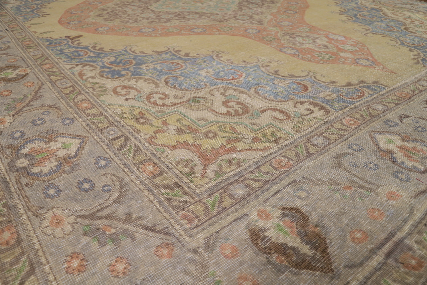 A Beautiful Genuine Persia ( Persia ) Tabriz rug is Hand Knotted by skillful weavers in Persia ( Persia ) with 100% Wool Material. This rug is in Very Good ( Evenly Low Pile-Repair) condition. dimensions are 12' 2'' X 9' 5'' in foot and 371 X 287 in centimeter. the primary color is Yellow & Gold.