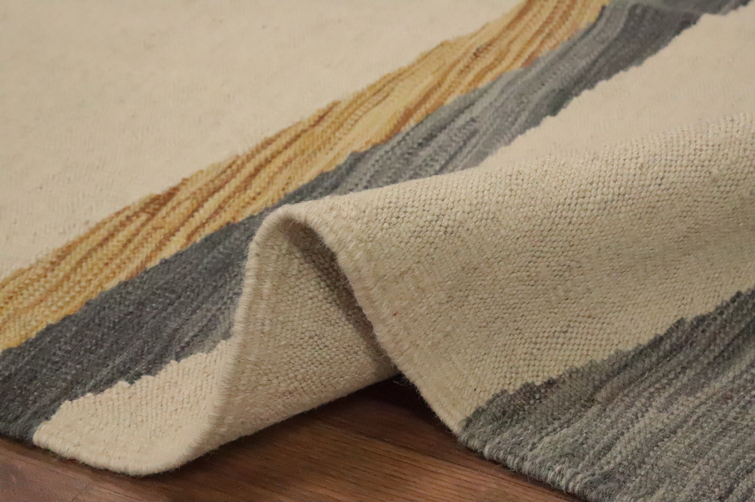 A Beautiful Genuine Pakistan Kilim rug is Hand Woven by skillful weavers in Pakistan with 100% Wool Material. This rug is in New, First Quality condition. dimensions are 10' 0'' X 6' 7'' in foot and 305 X 201 in centimeter. the primary color is Beige & Ivories.